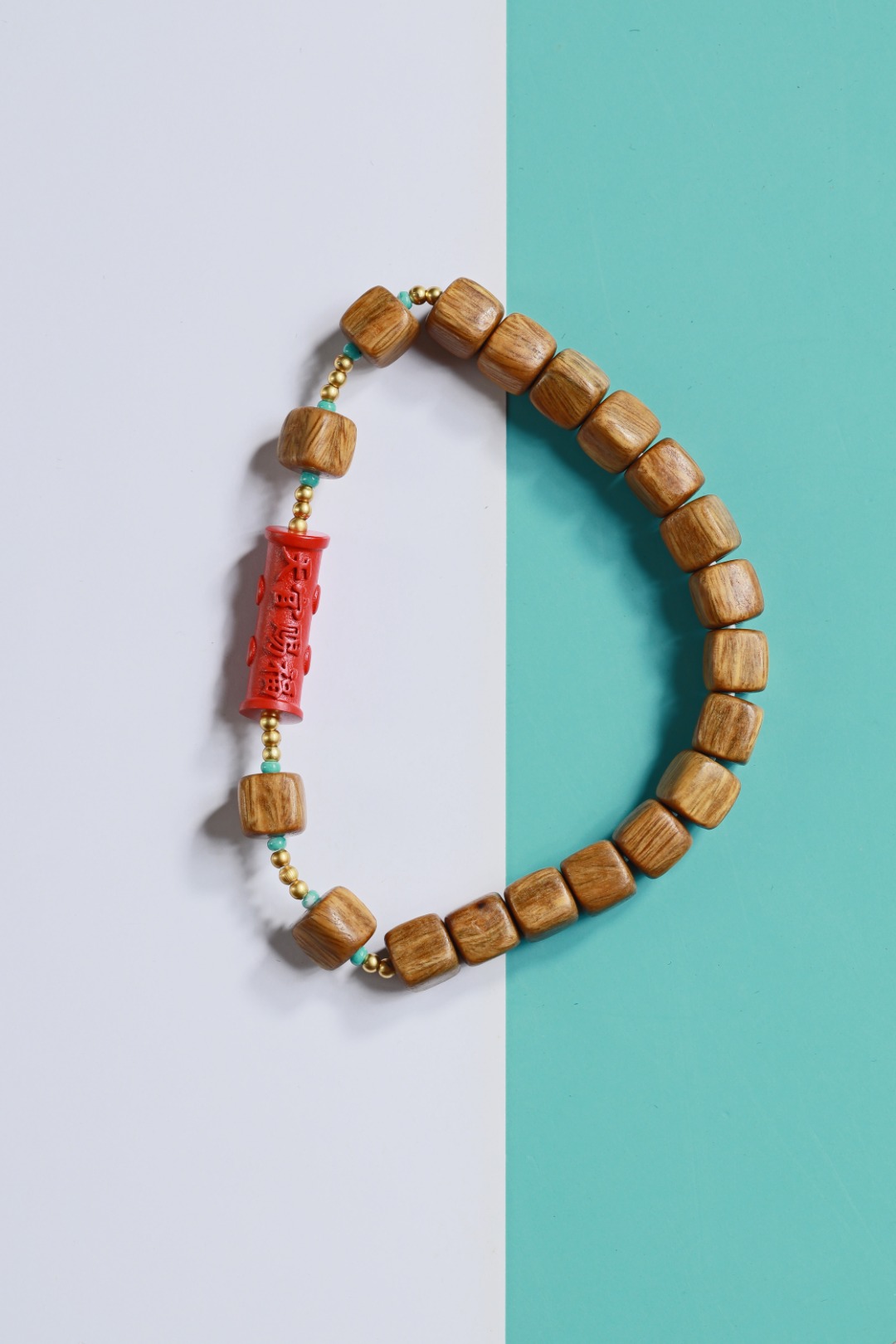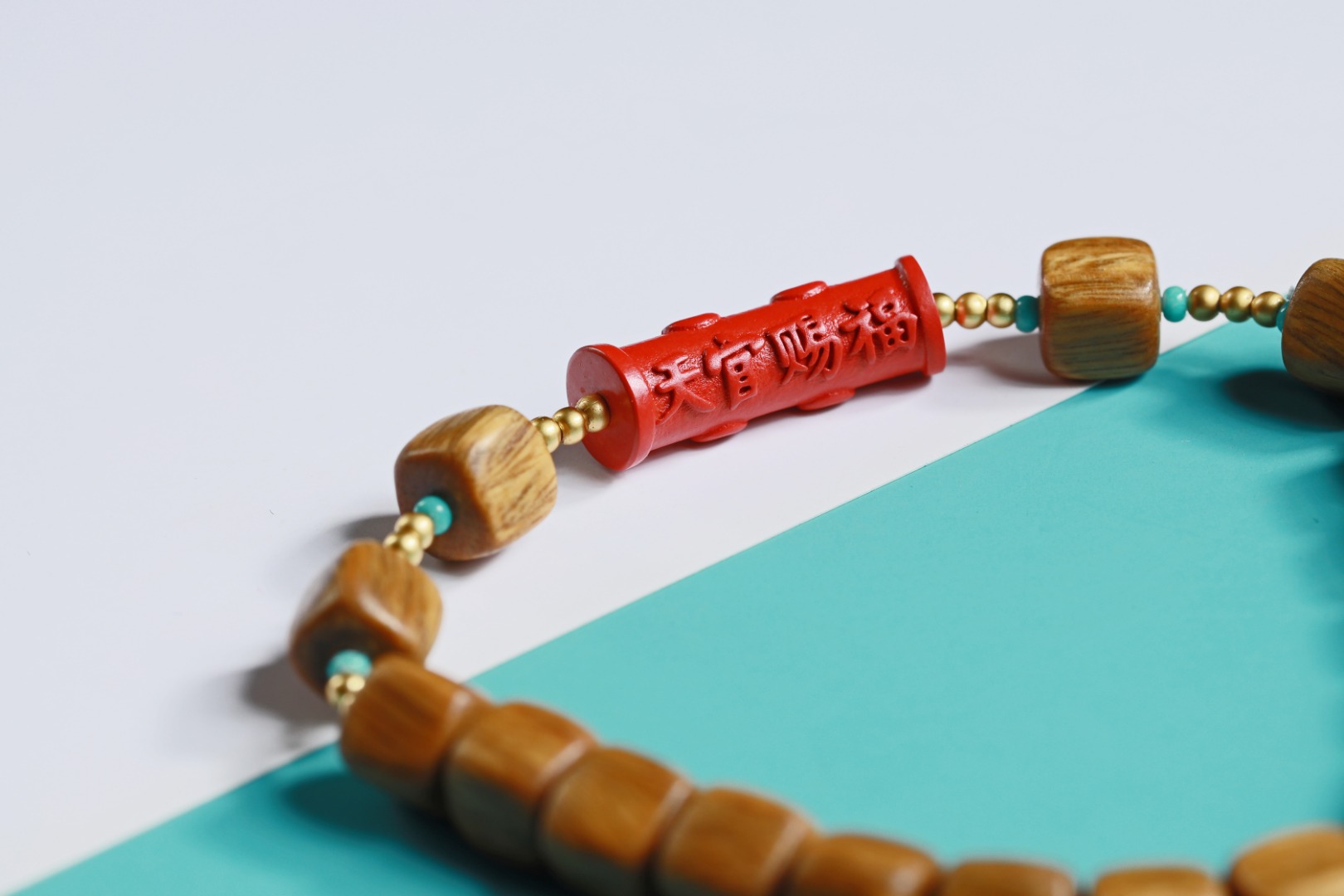 绿檀四方来财珠+琉璃隔片、铜珠、朱砂天官赐福