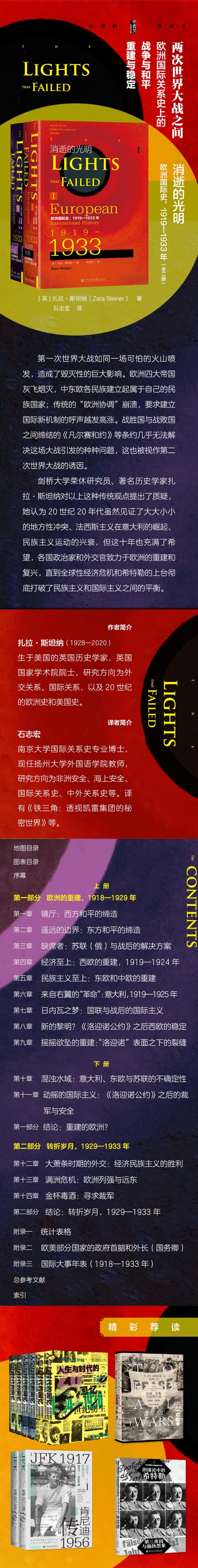 作者扎拉·斯坦纳(1928—2020),生于美国的英国历史学家,英国国家学术院院士,研究方向为外交关系、国际关系,以及20世纪的欧洲史和美国史。译者石志宏,南京大学国际关系史专业博士,现任扬州大学外国语学院教师,研究方向为非洲安全、海上安全、国际关系史、中外关系史等。译有《铁三角:透视凯雷集团的秘密世界》等。