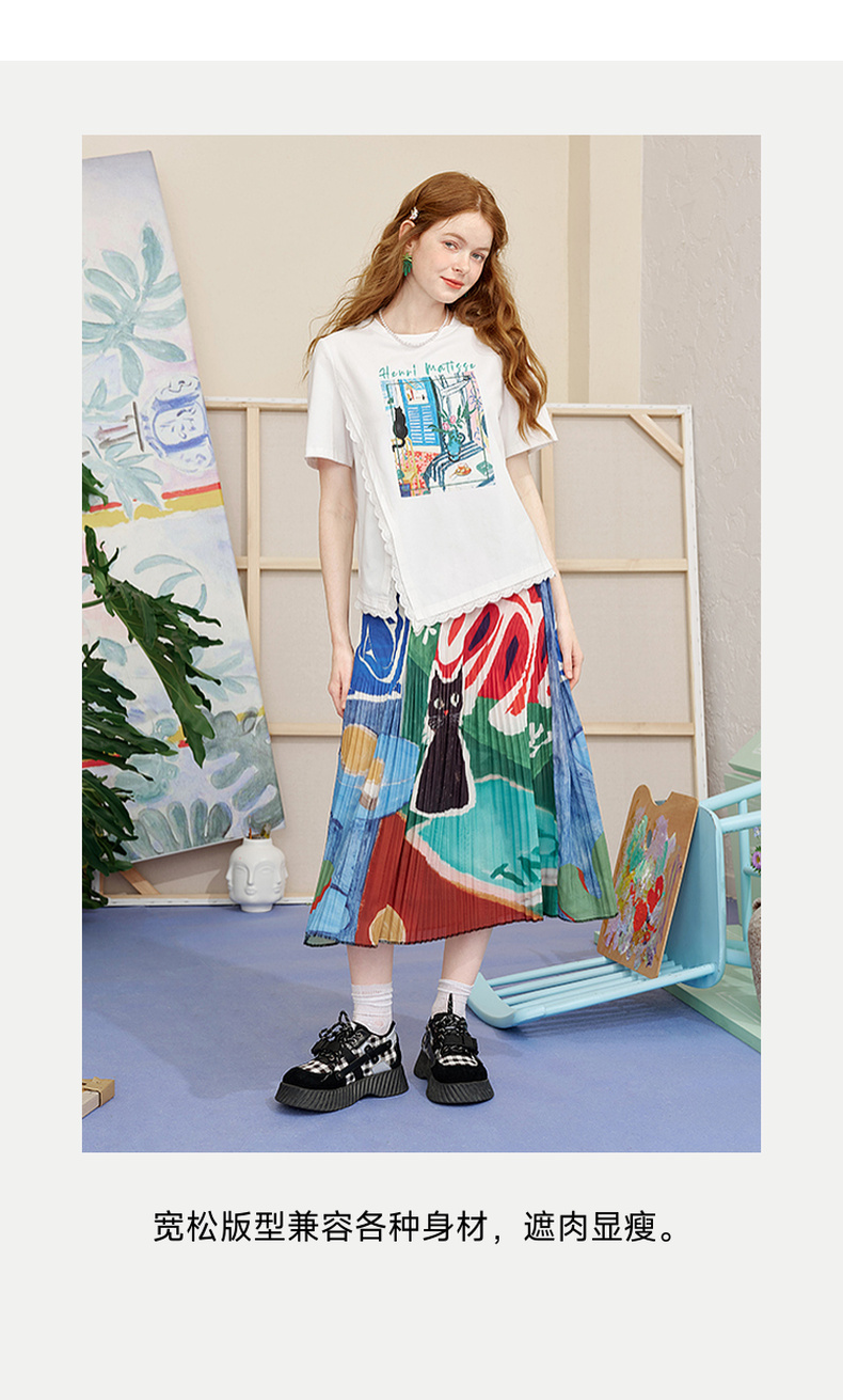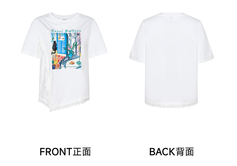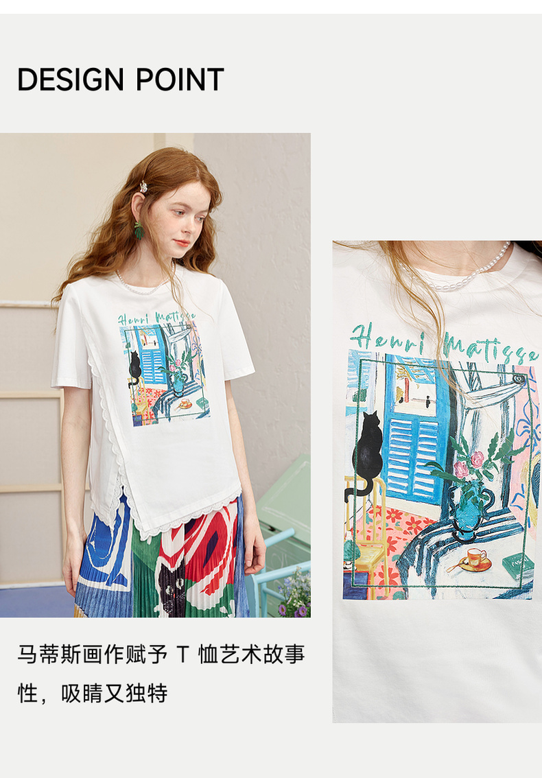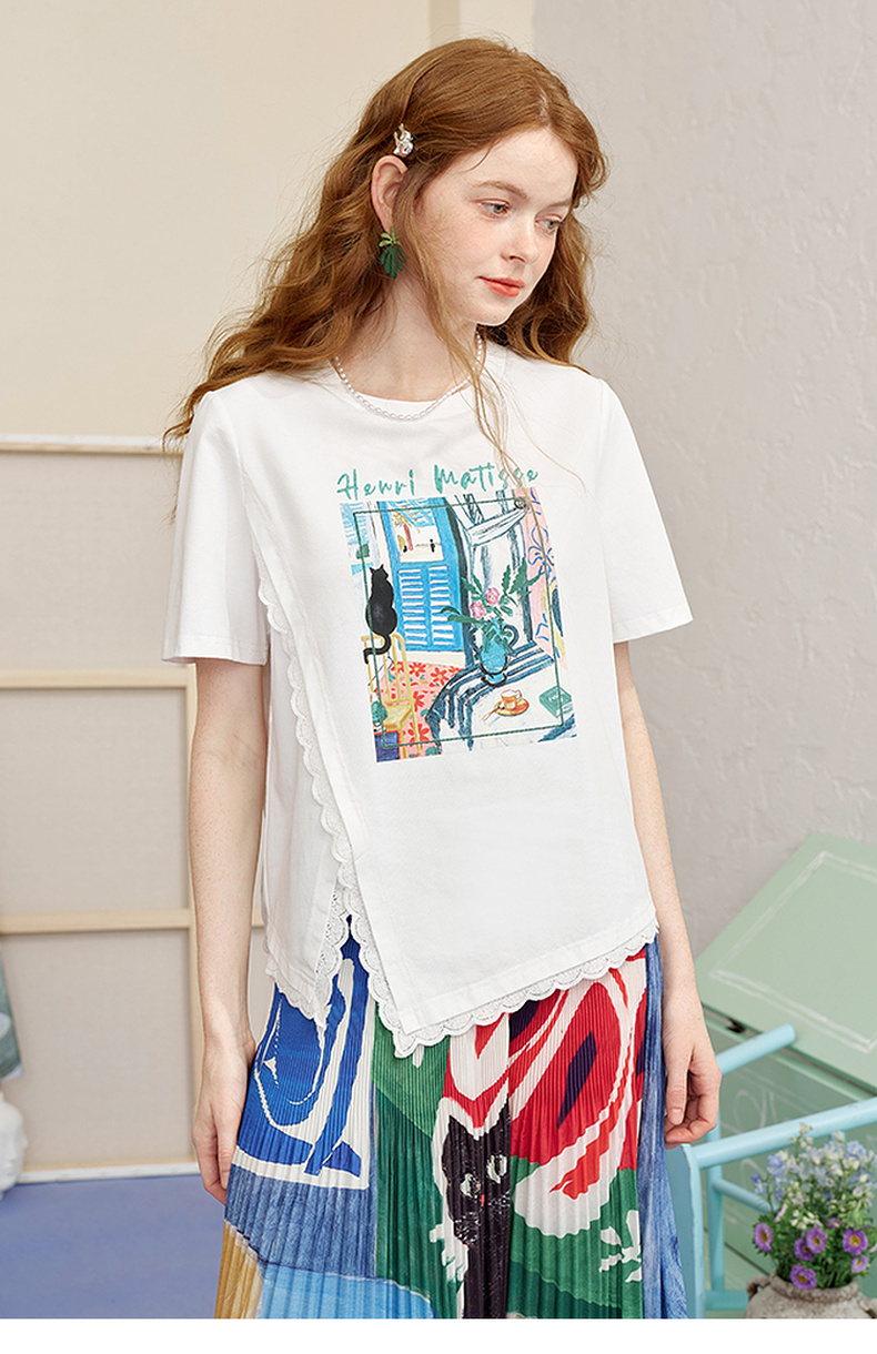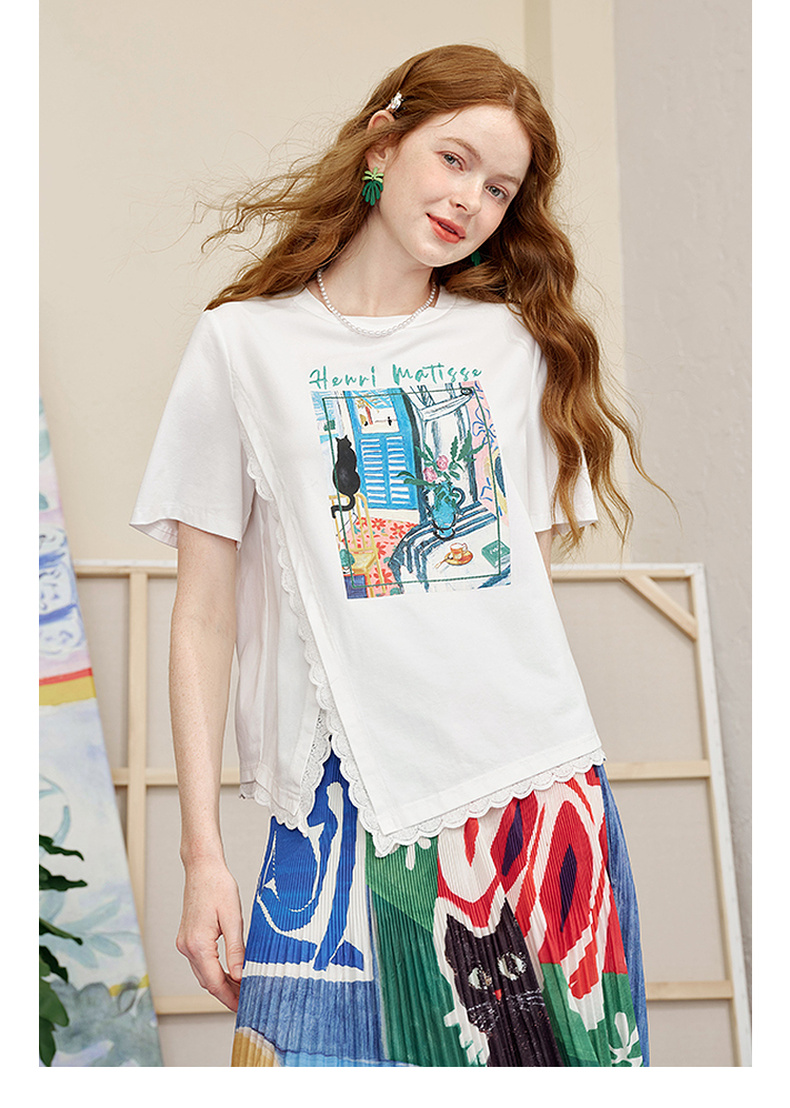 两三事画中往事2025夏新款休闲蕾丝拼接不对称下摆印花短袖t恤女