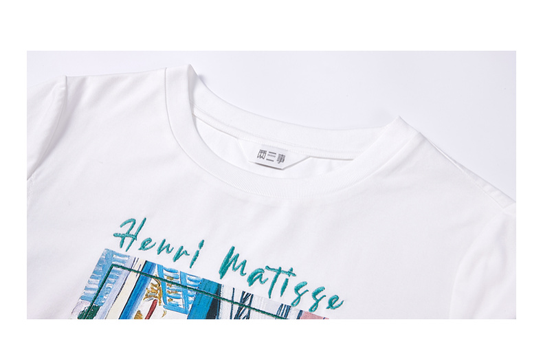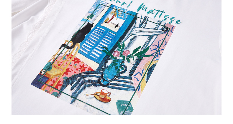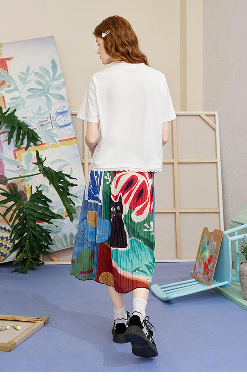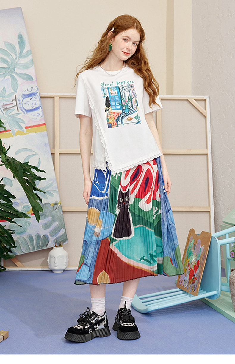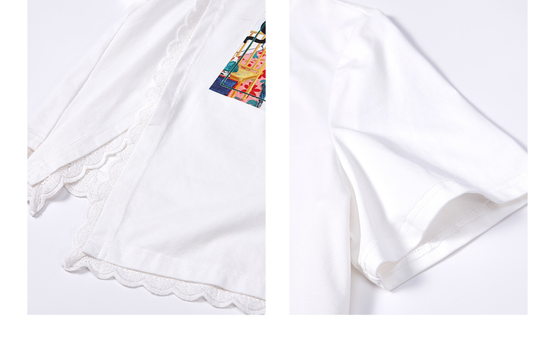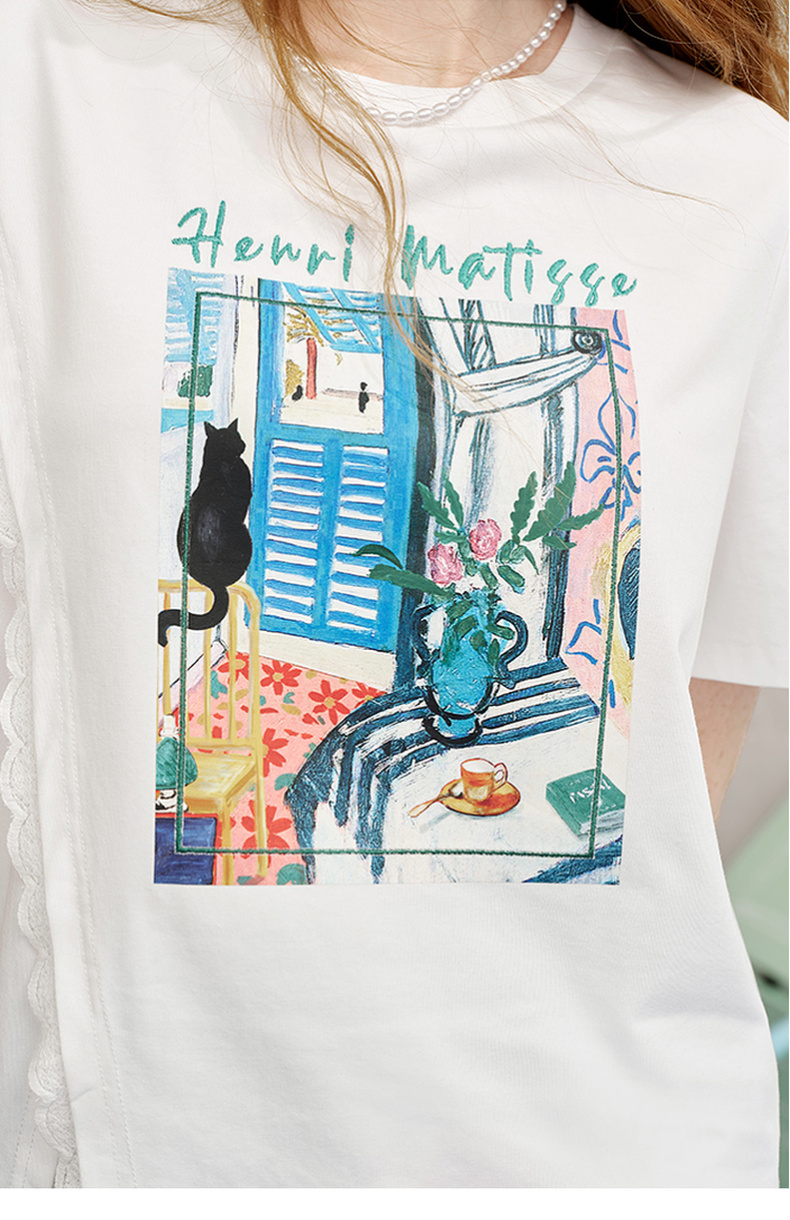 两三事画中往事2025夏新款休闲蕾丝拼接不对称下摆印花短袖t恤女