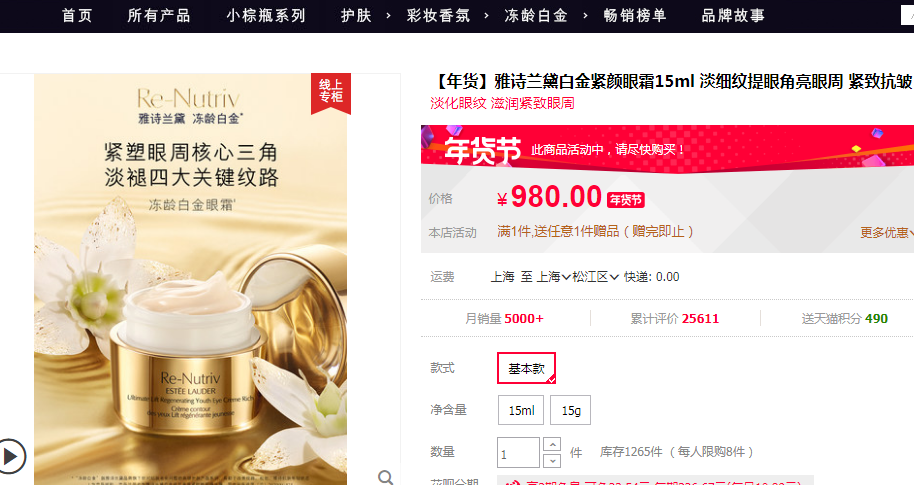 【商品名称】雅诗兰黛白金级奢宠紧颜冻龄眼霜7ml *2