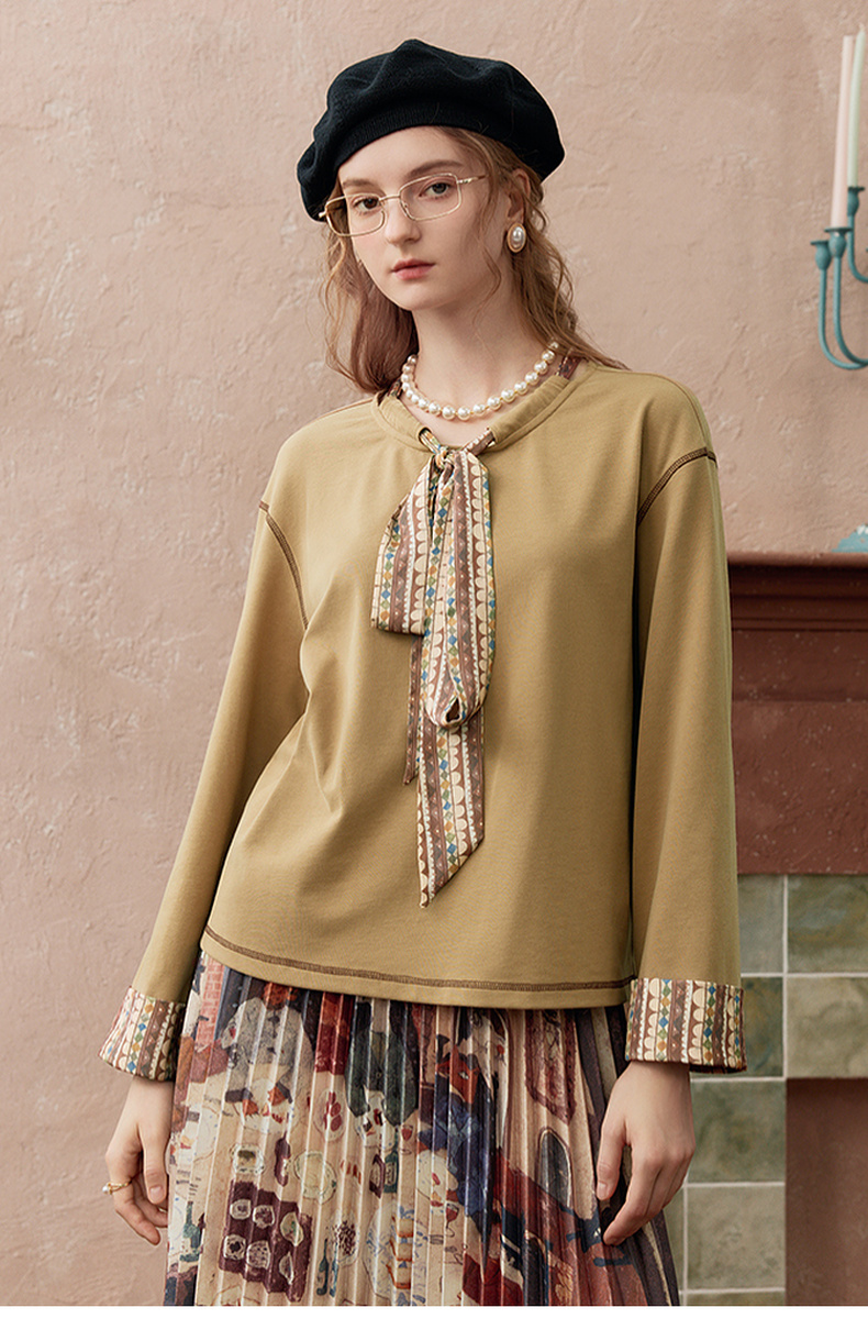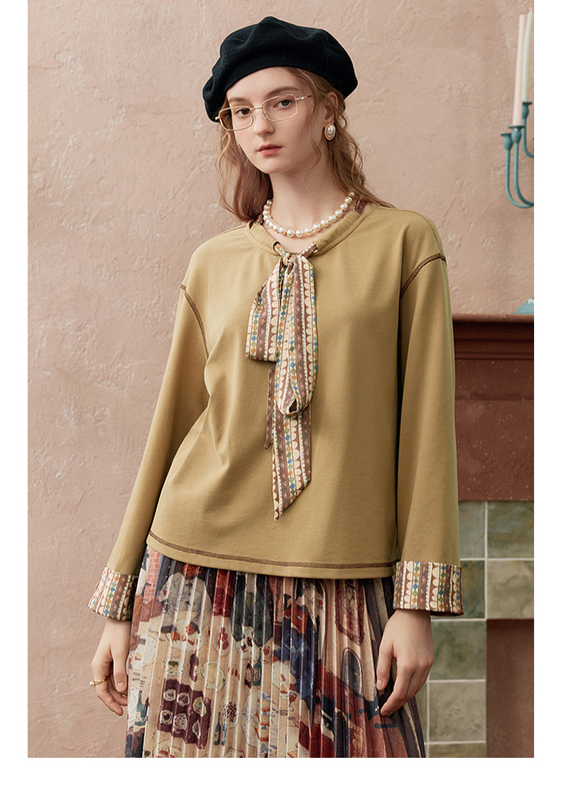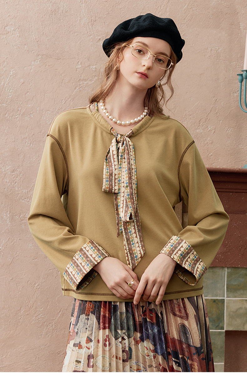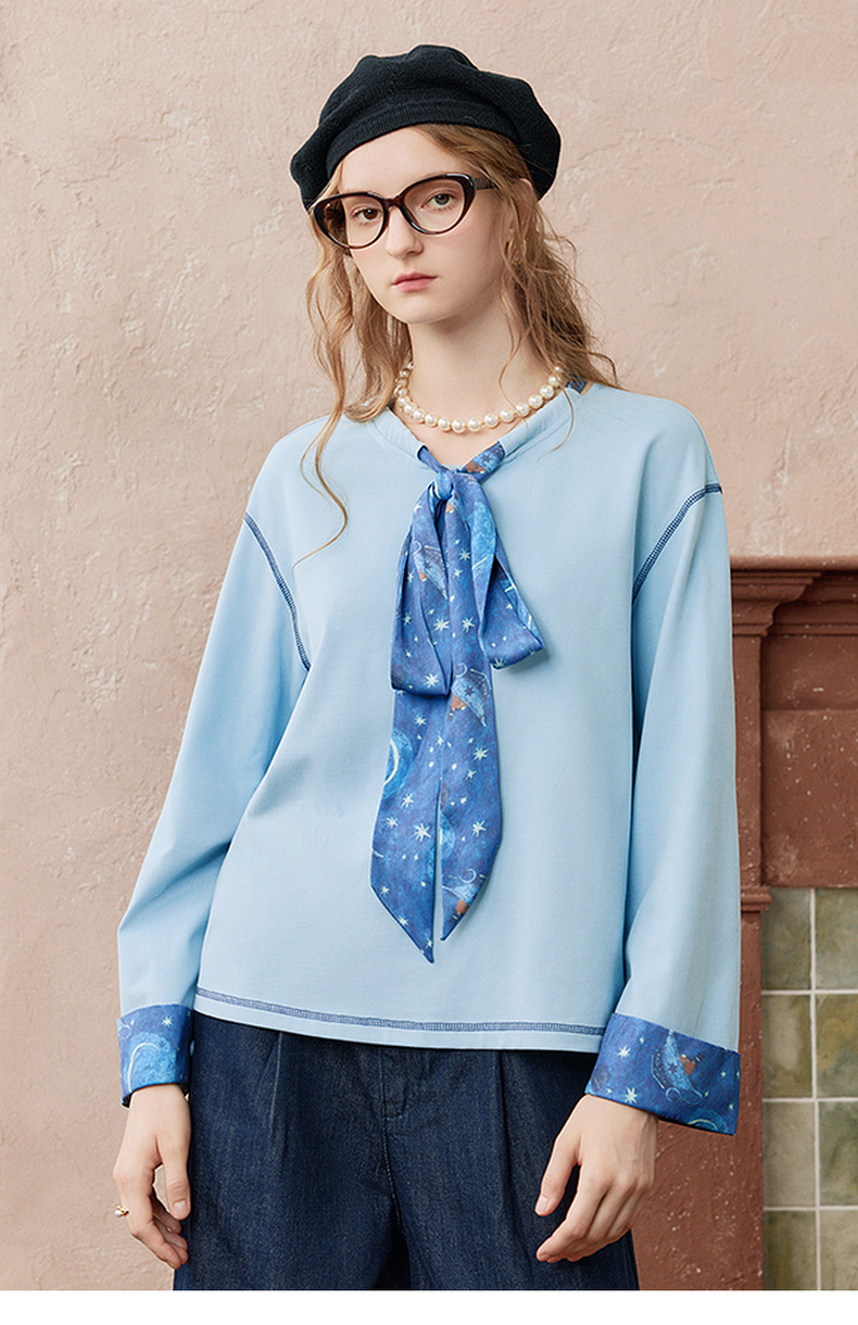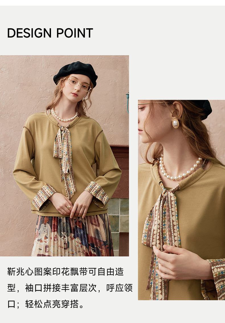 两三事星穹画语2025秋季新款复古印花绑带刺绣线边长袖t恤女宽松