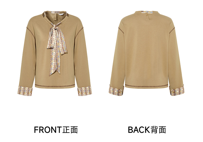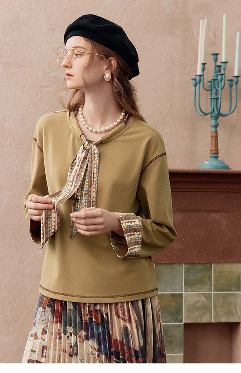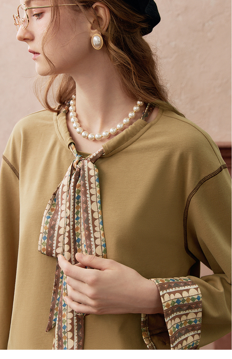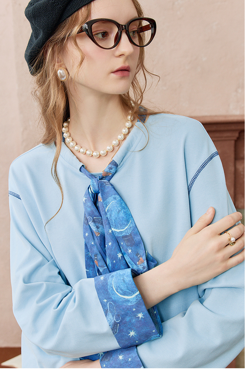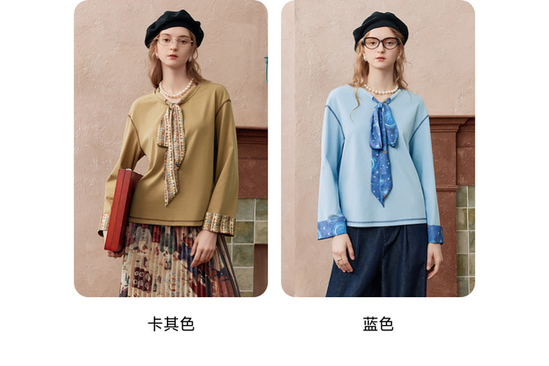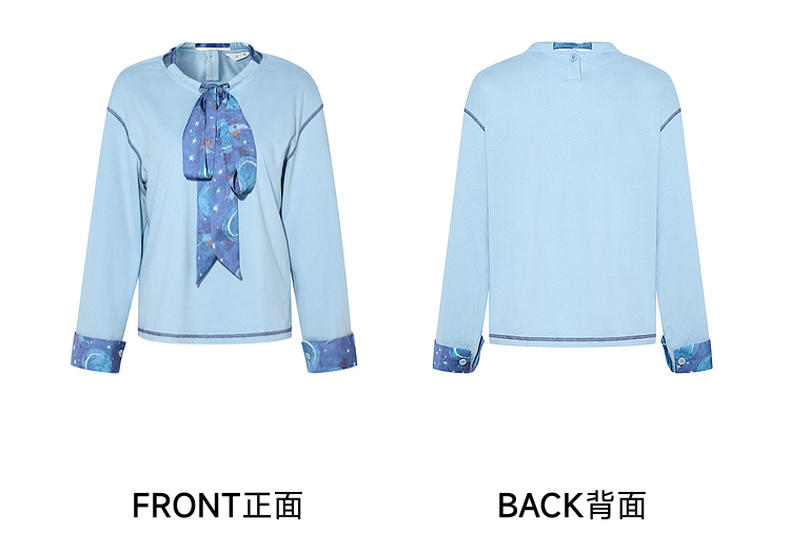 两三事星穹画语2025秋季新款复古印花绑带刺绣线边长袖t恤女宽松