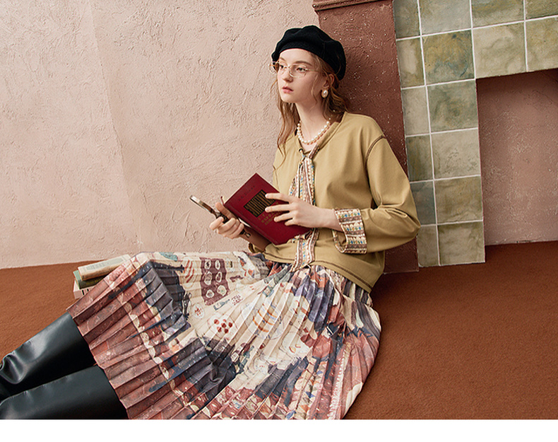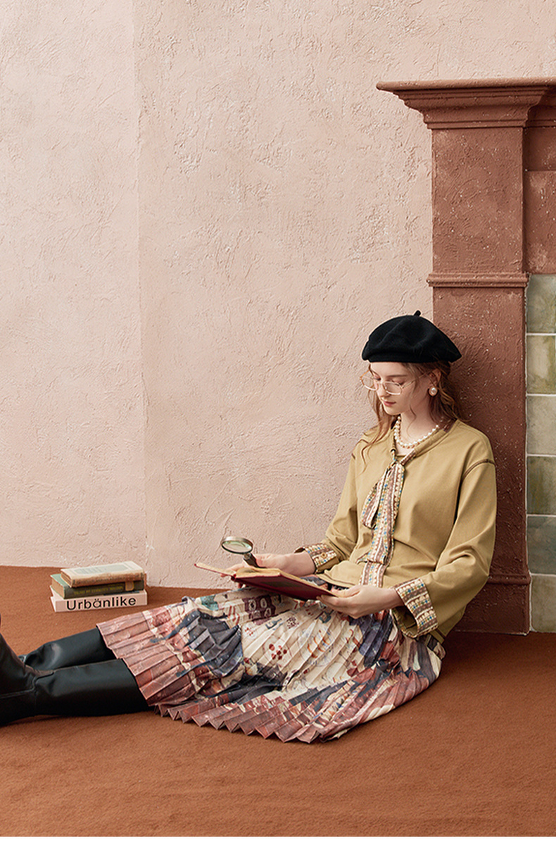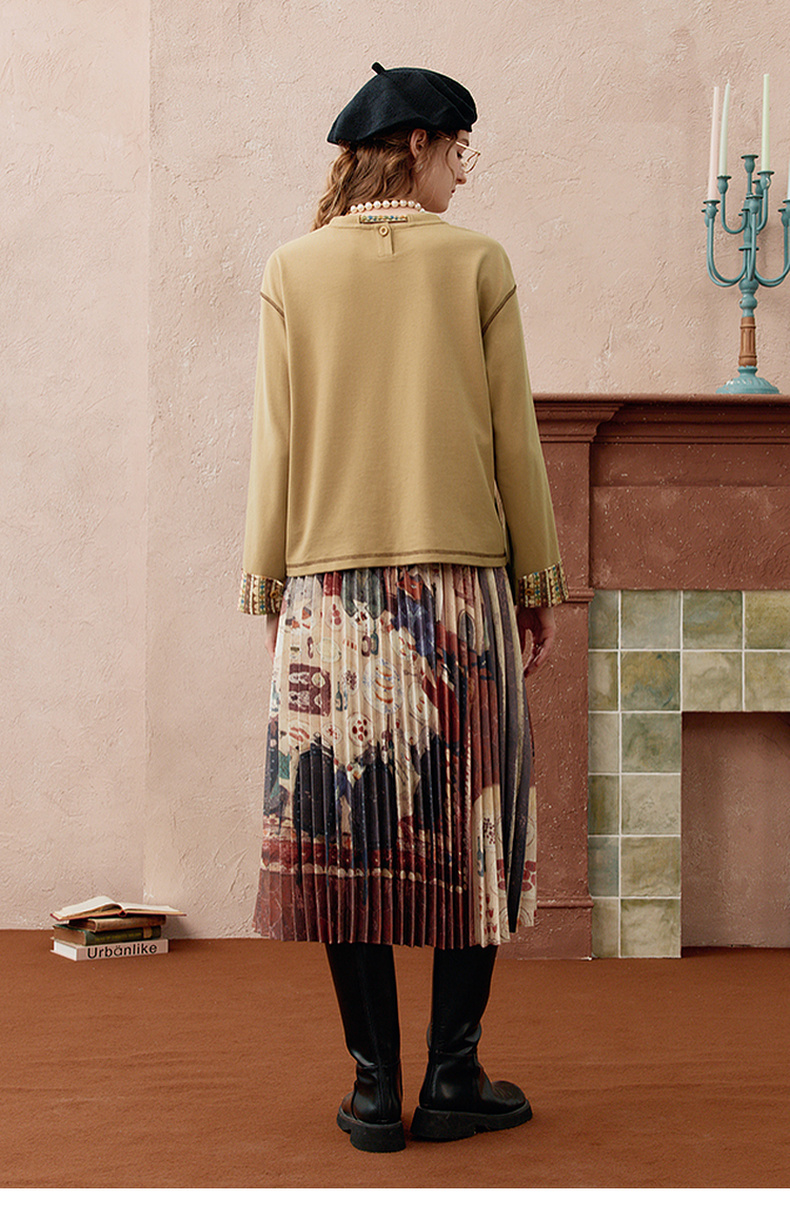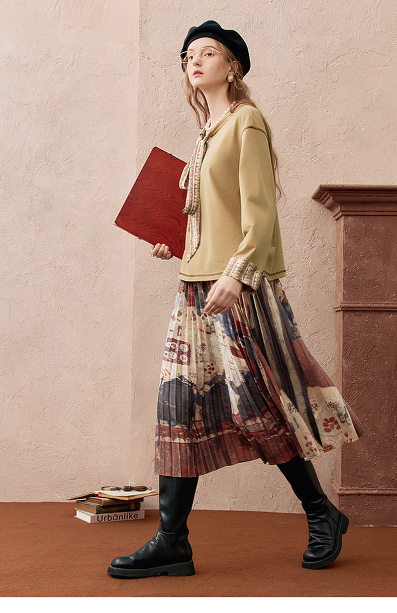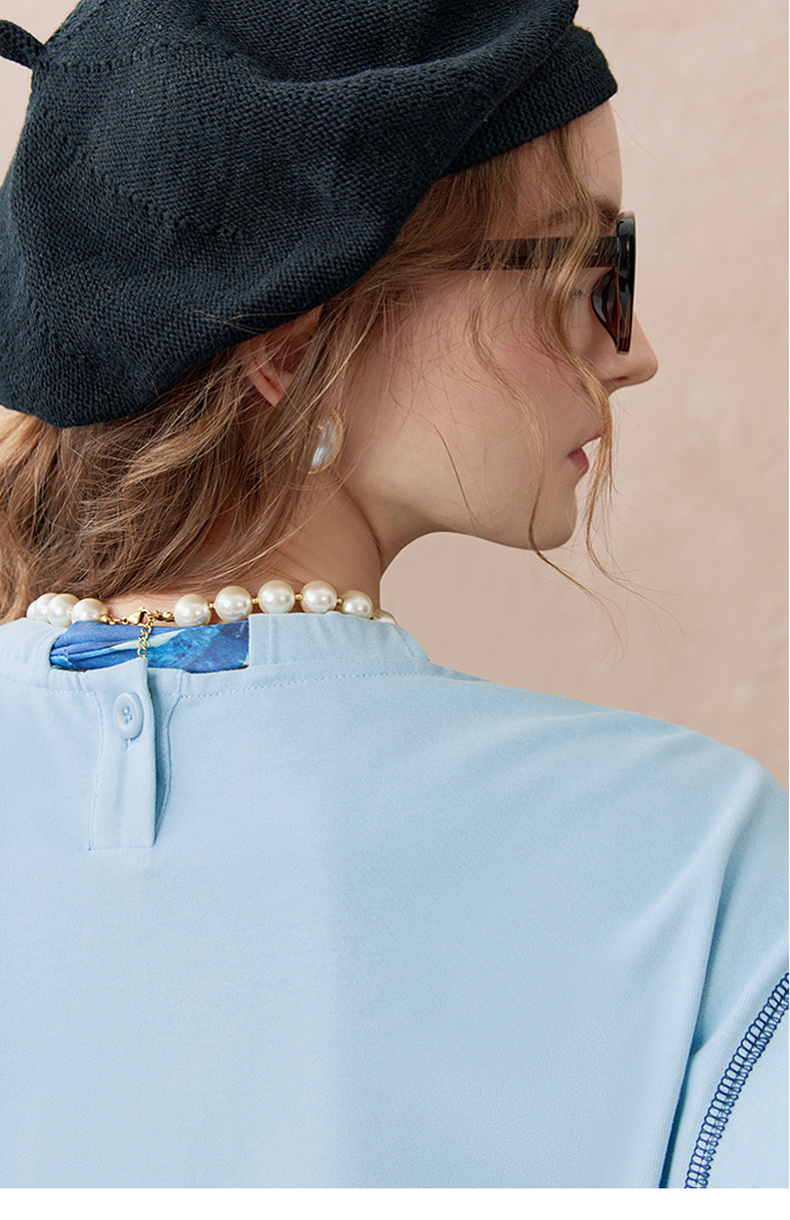 两三事星穹画语2025秋季新款复古印花绑带刺绣线边长袖t恤女宽松