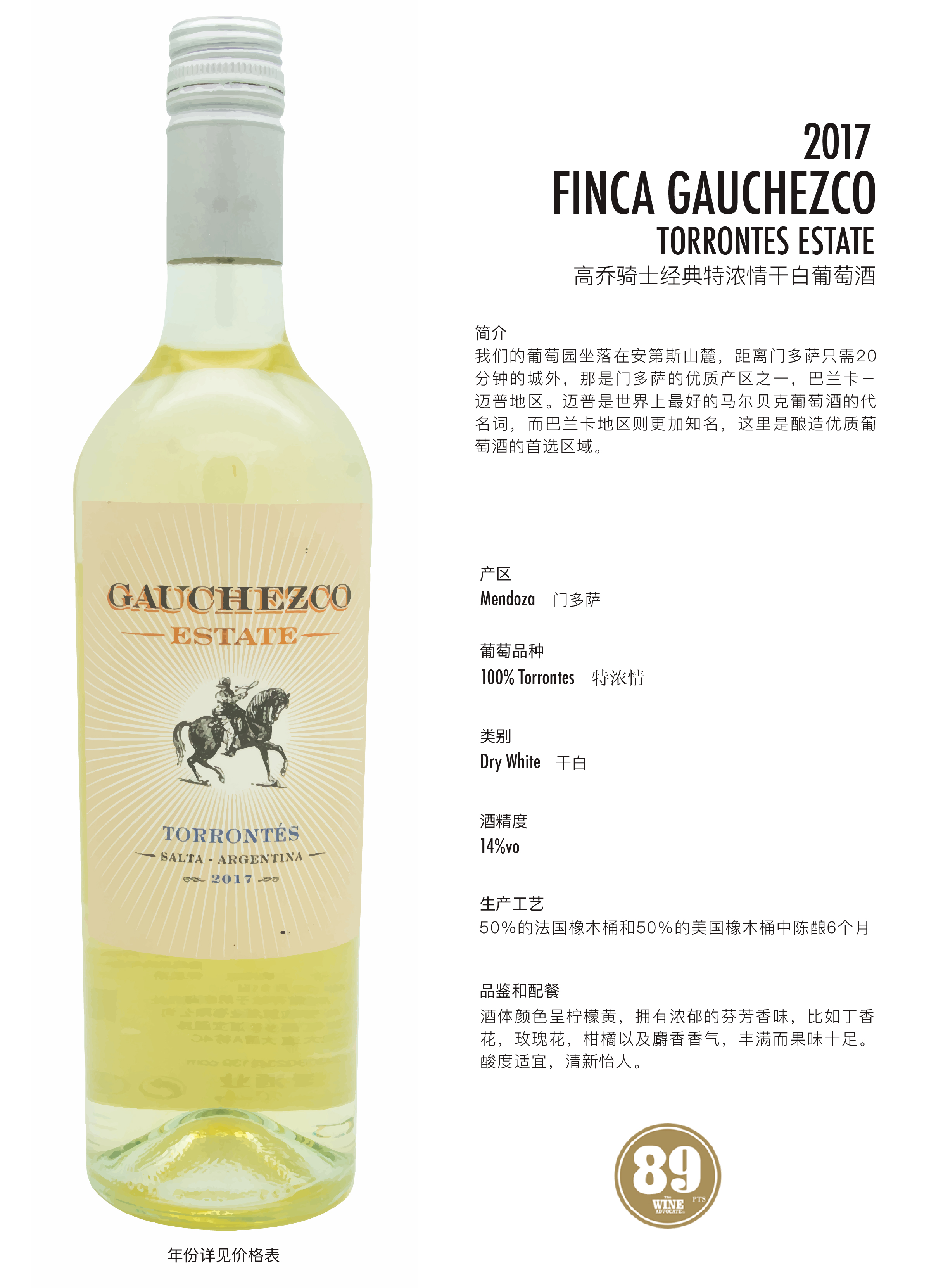 高乔骑士特浓情白葡萄酒2018 750ml 阿根廷