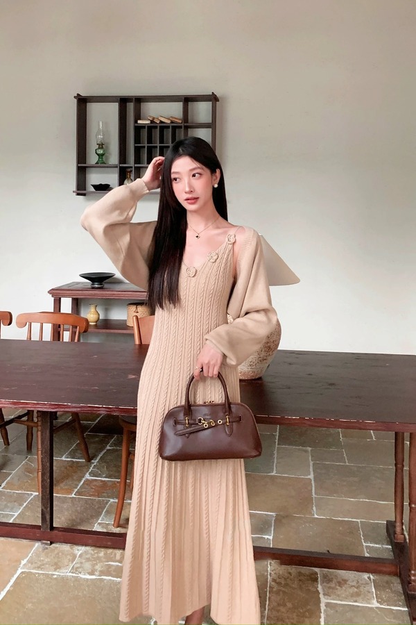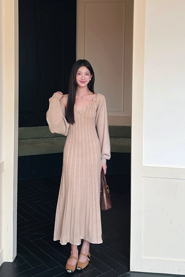 SIA SAYLOR 优雅提花针织浪漫钩花长款连衣裙披肩套装 21405