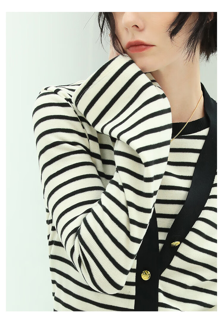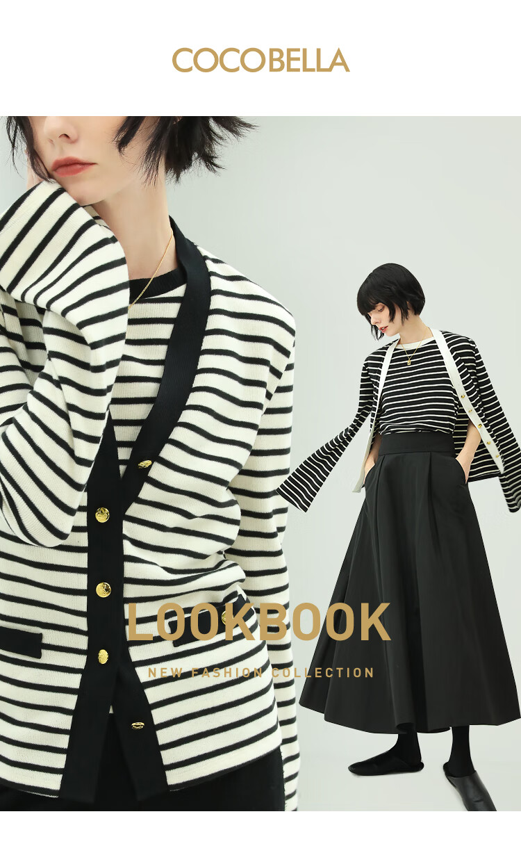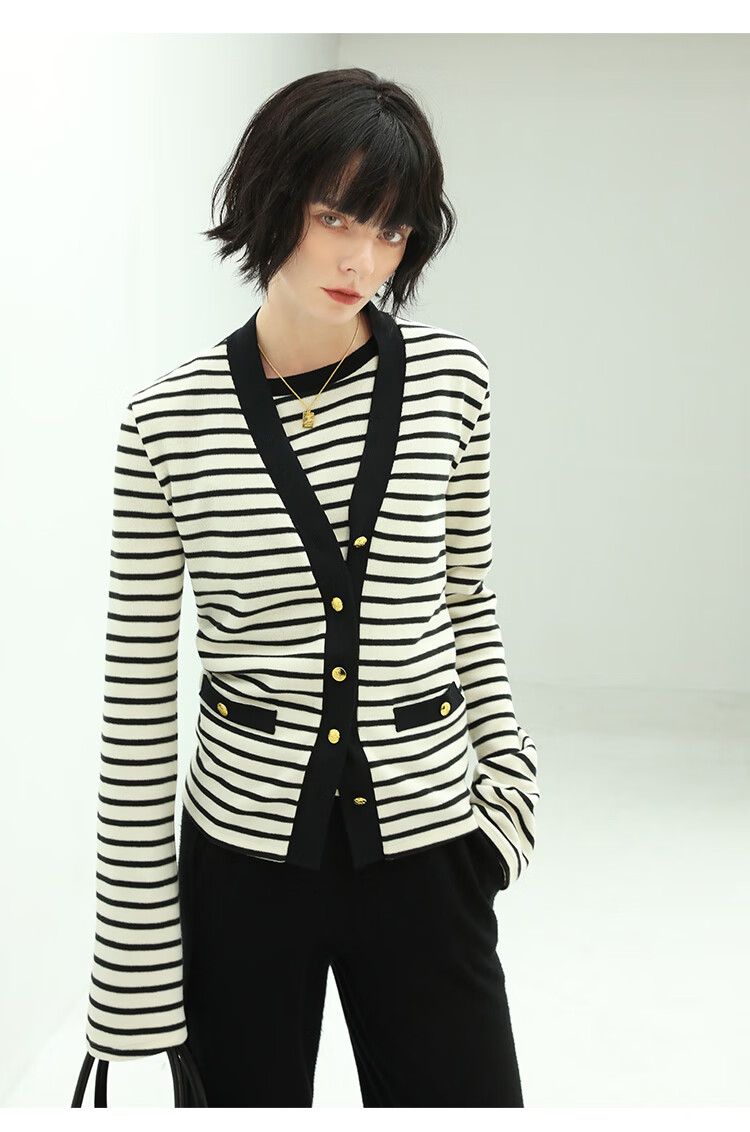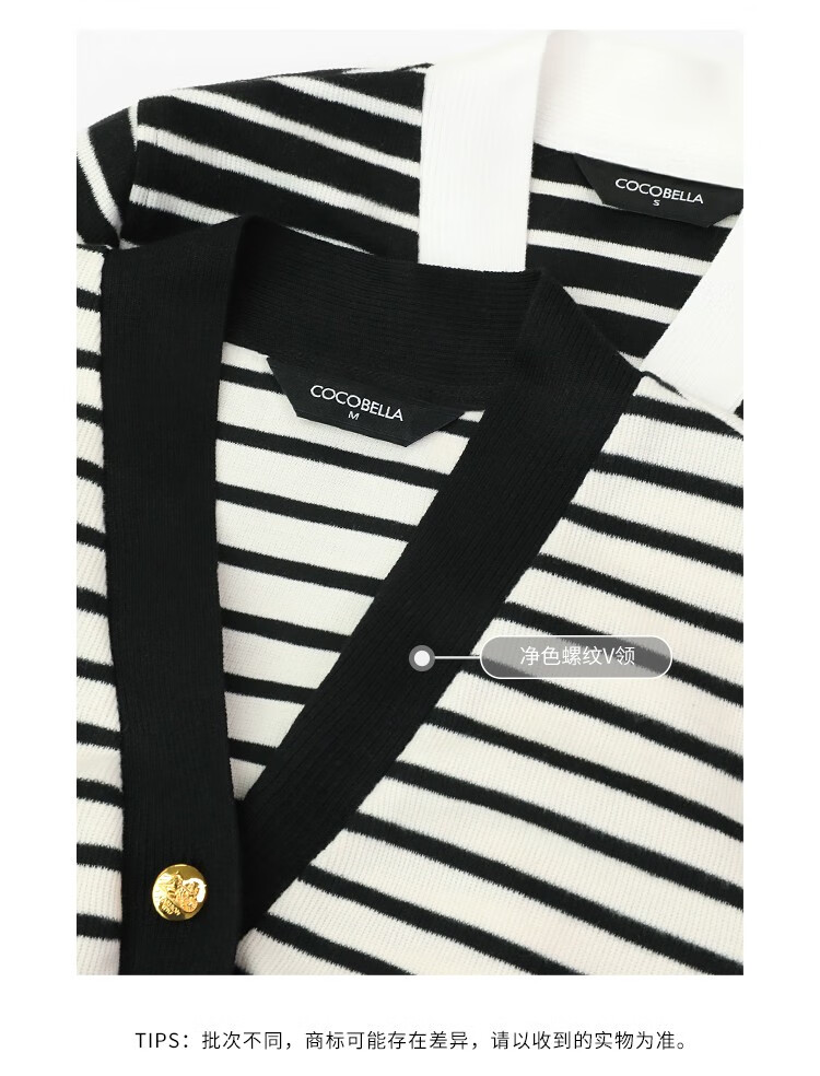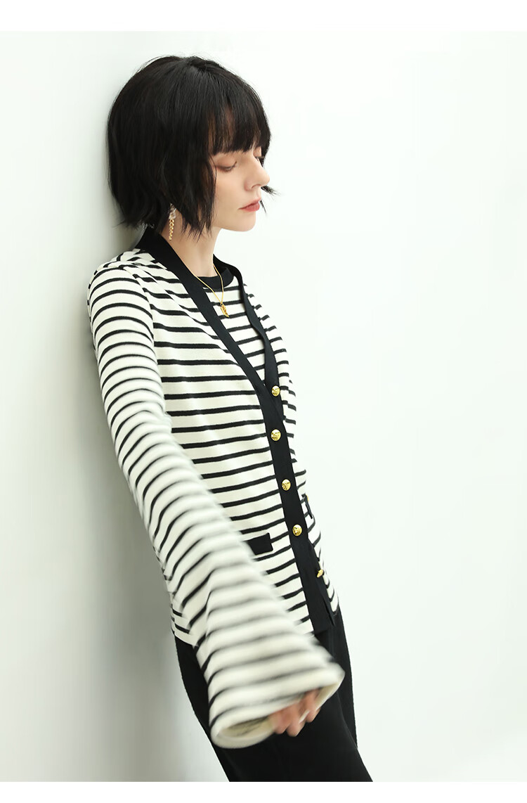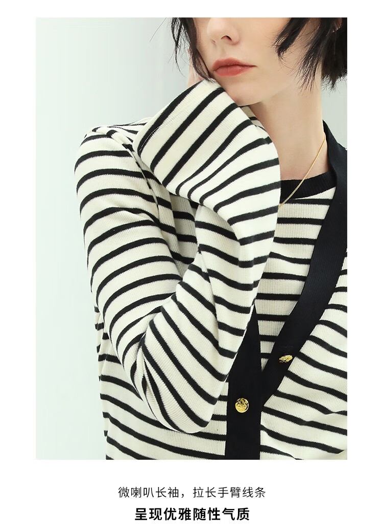 COCOBELLA撞色黑白条纹喇叭袖针织衫女V领开衫MZ157