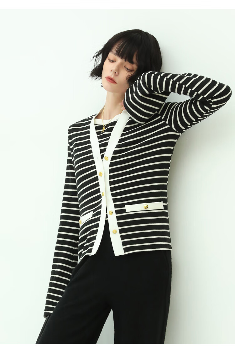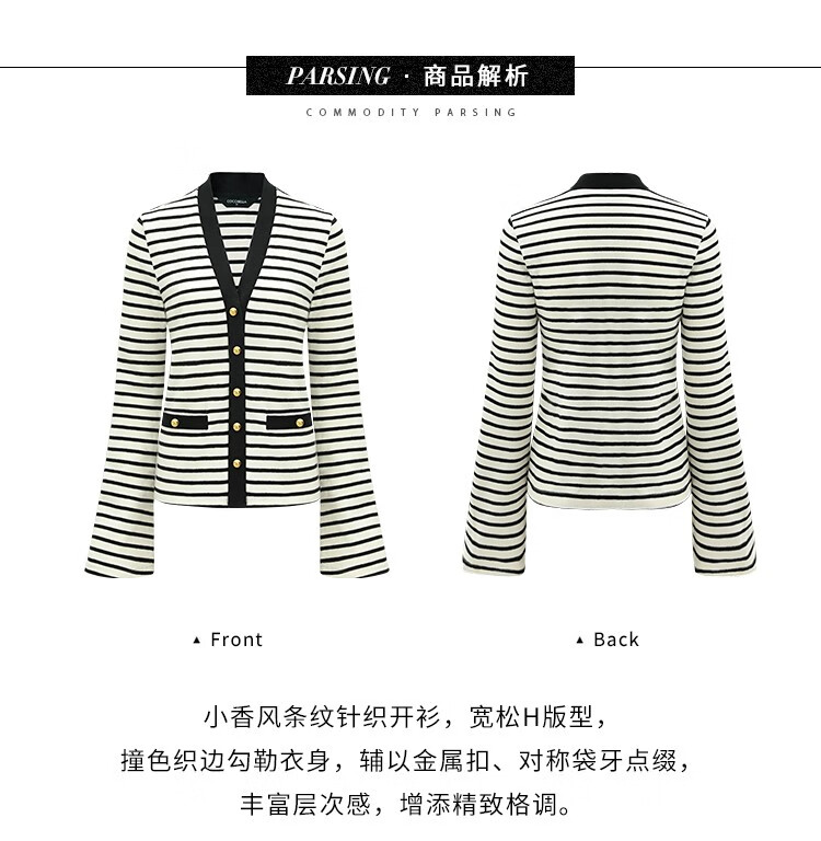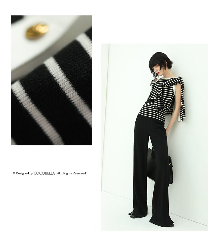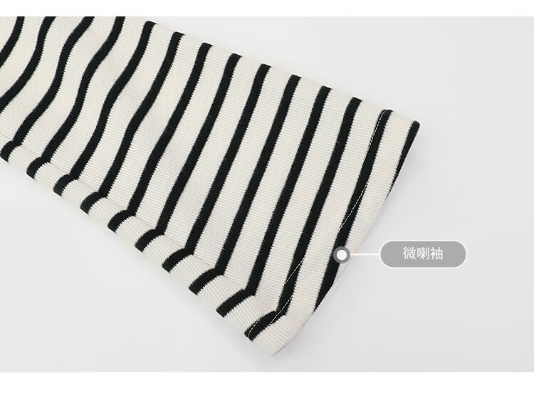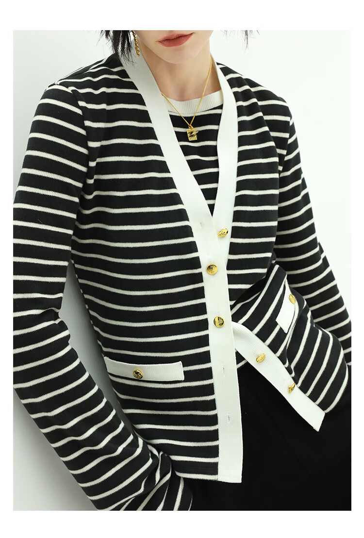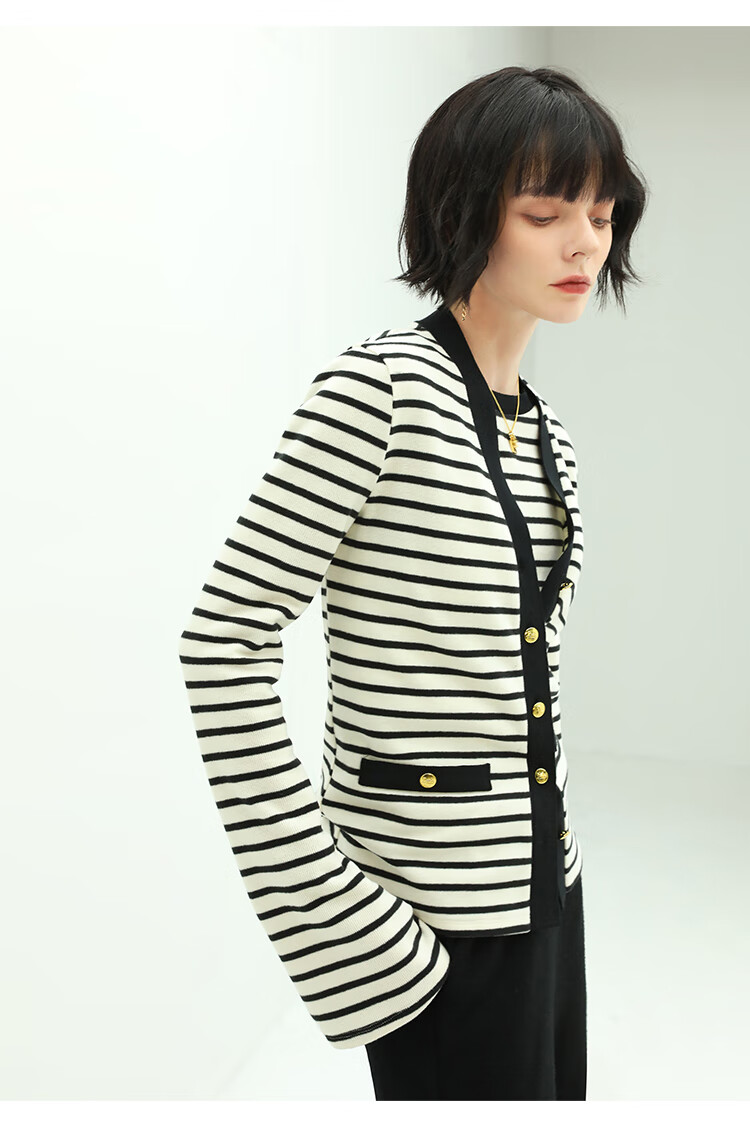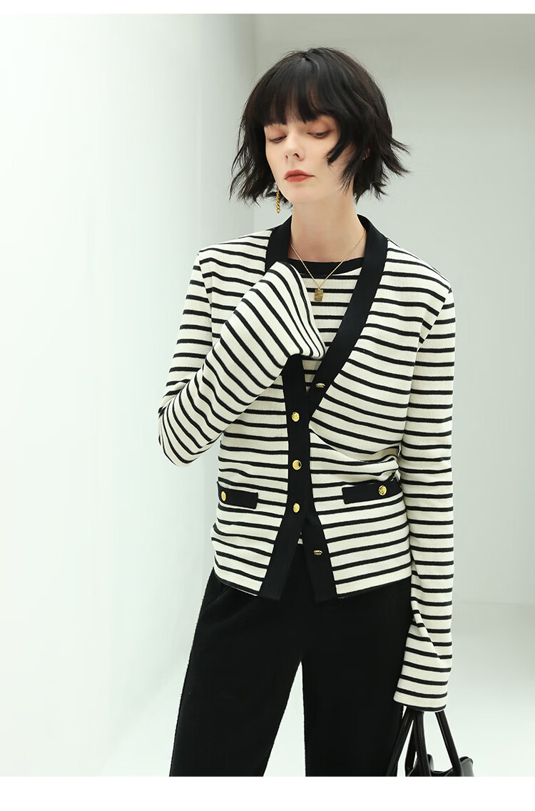 COCOBELLA撞色黑白条纹喇叭袖针织衫女V领开衫MZ157