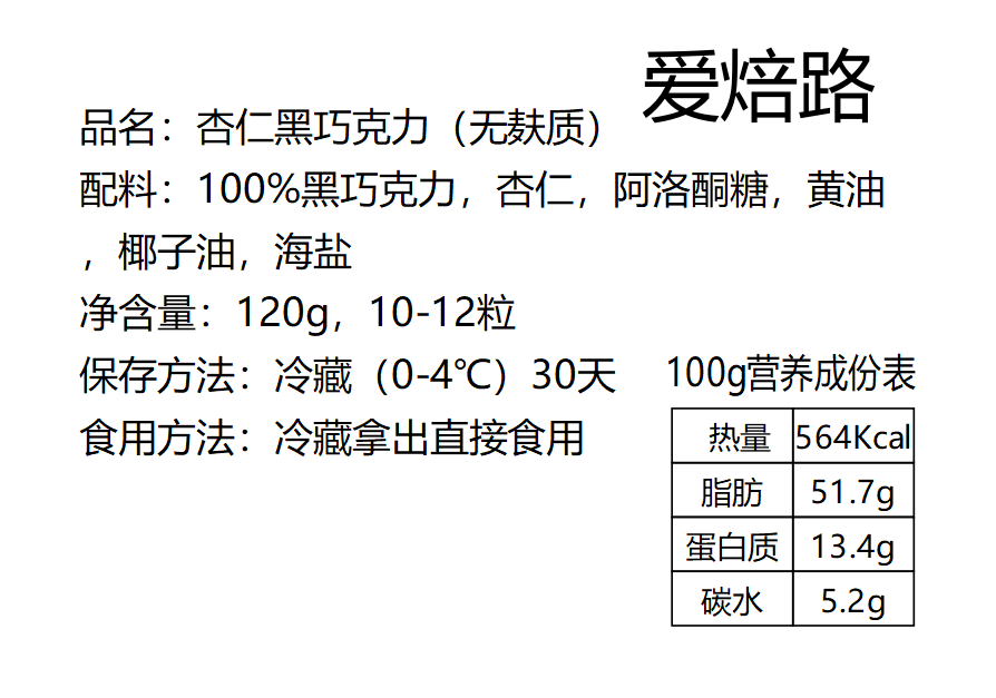 情人节礼物 无糖杏仁黑巧克力 纯可可脂