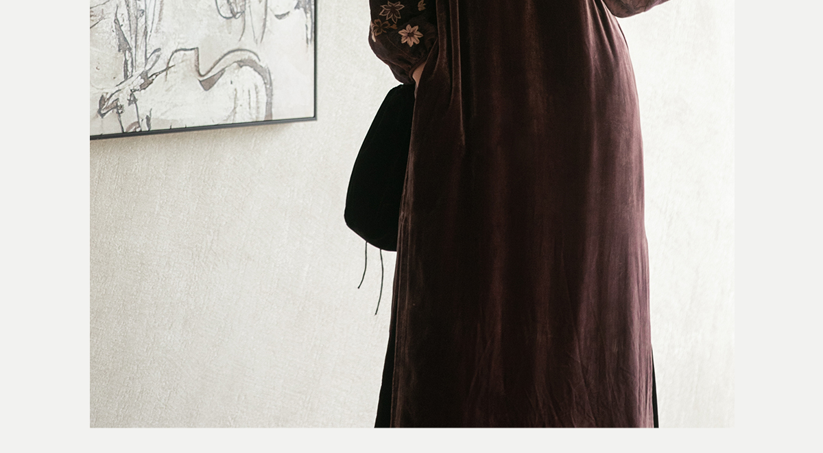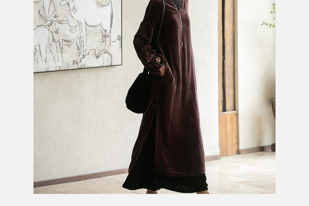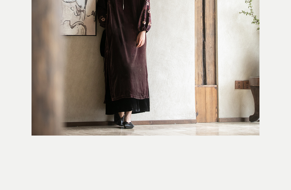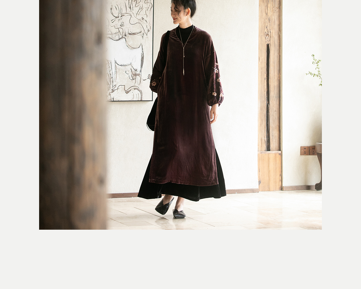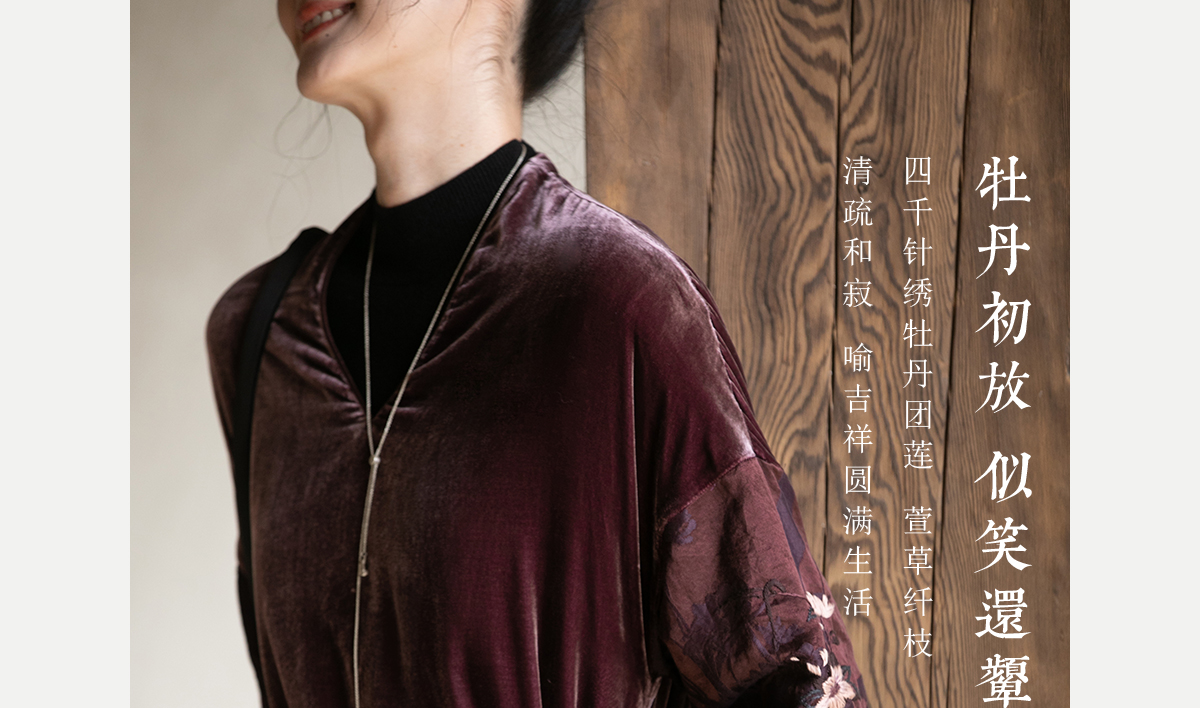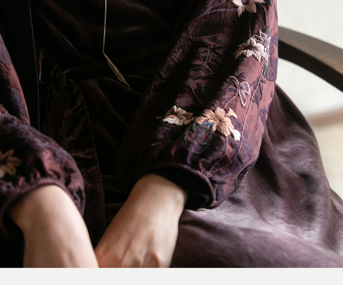 牧衣游原创丝绒手工刺绣连衣裙新款古朴东方V领气质宽松长裙 李子