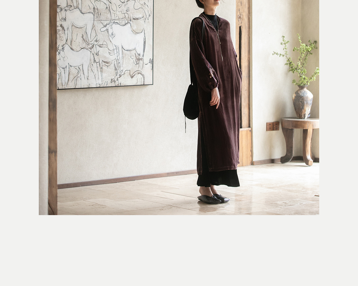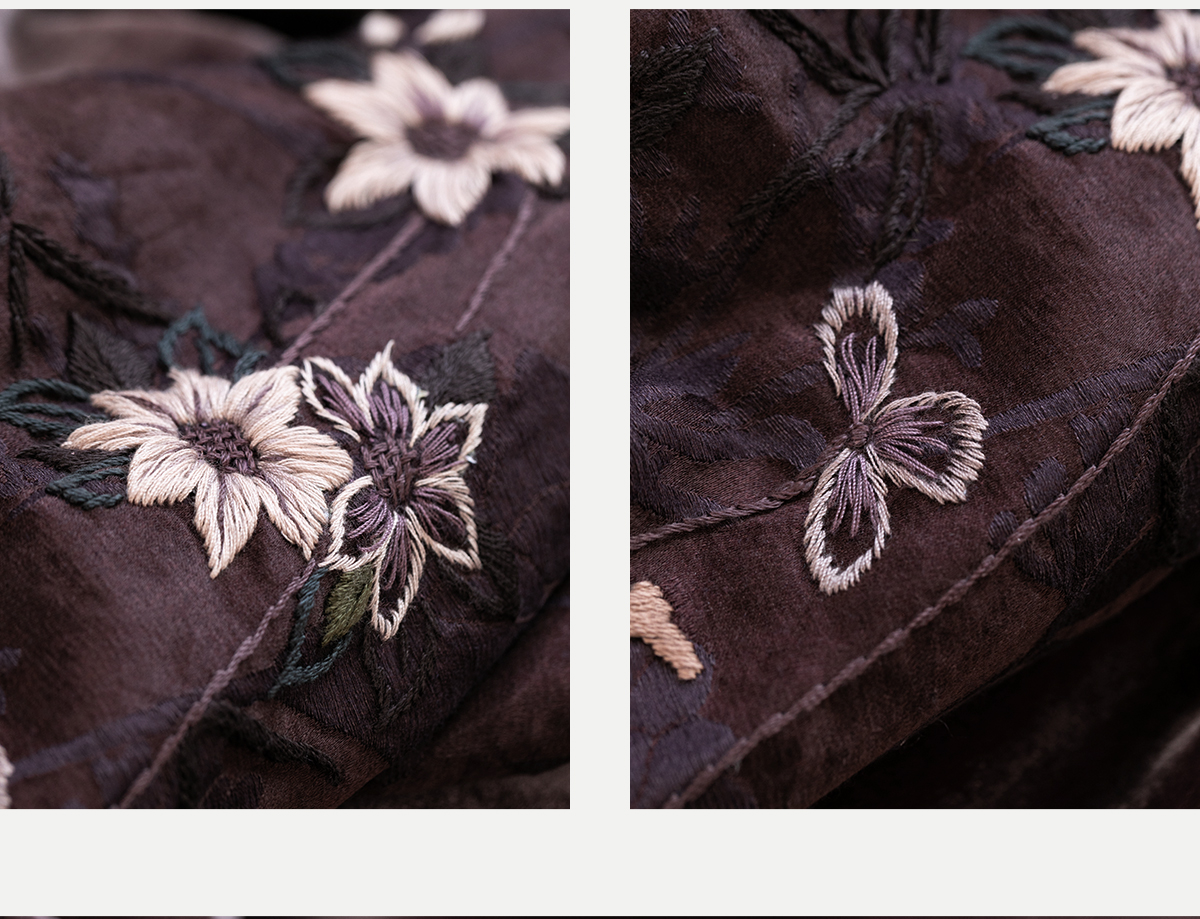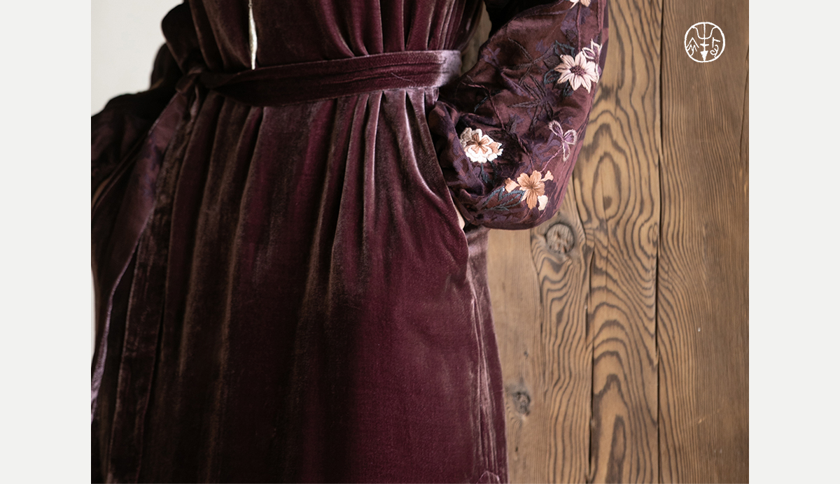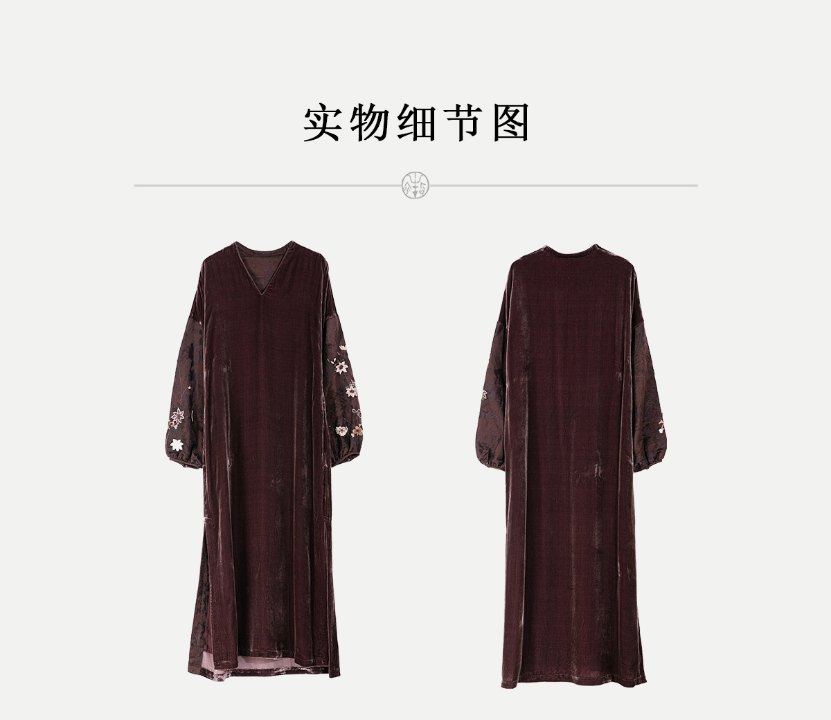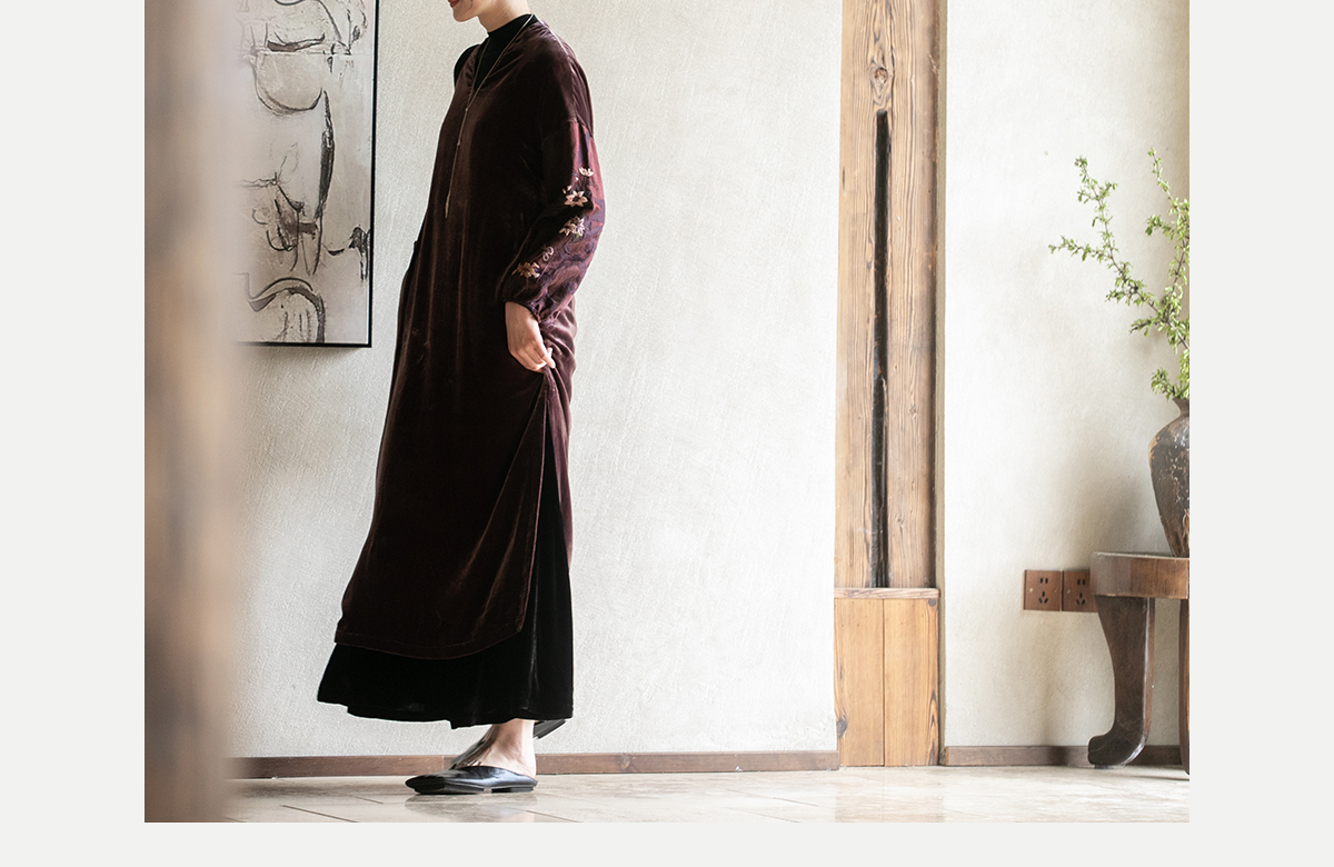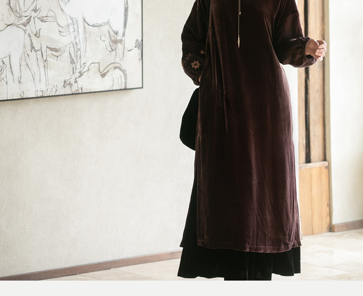 牧衣游原创丝绒手工刺绣连衣裙新款古朴东方V领气质宽松长裙 李子