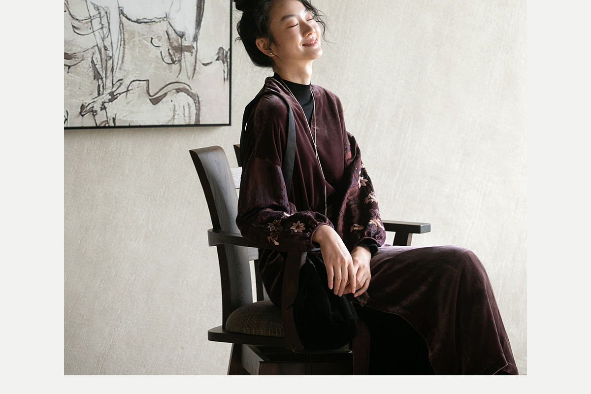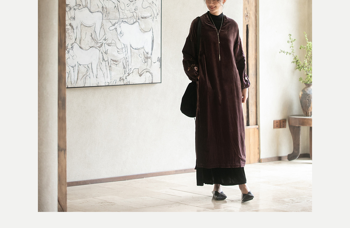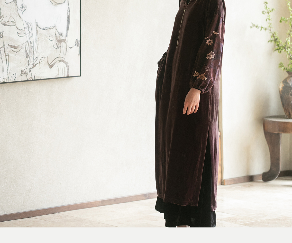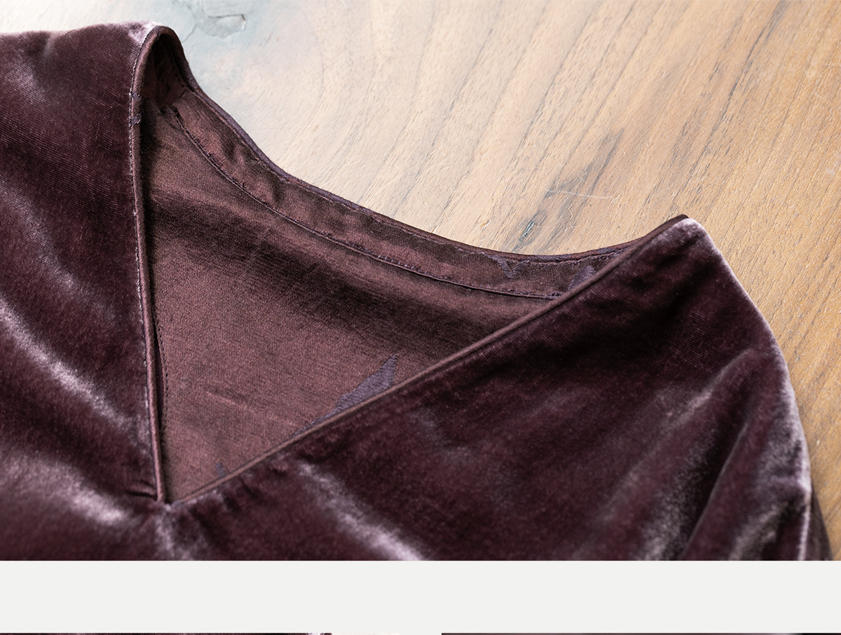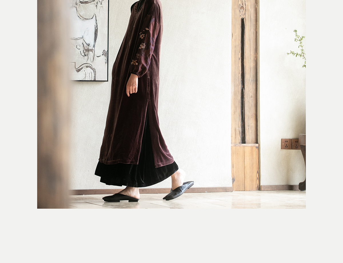 牧衣游原创丝绒手工刺绣连衣裙新款古朴东方V领气质宽松长裙 李子