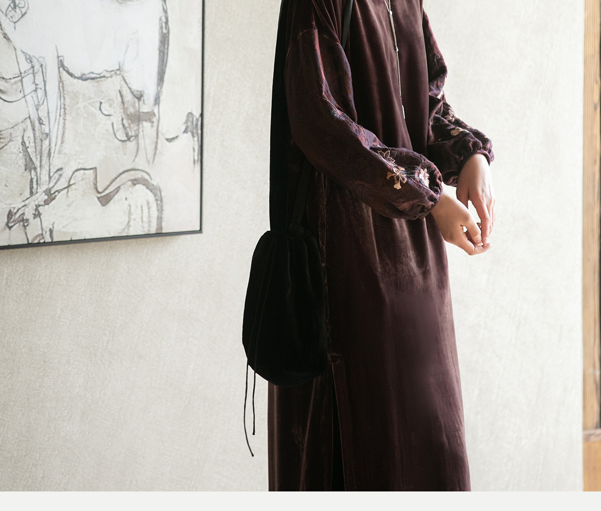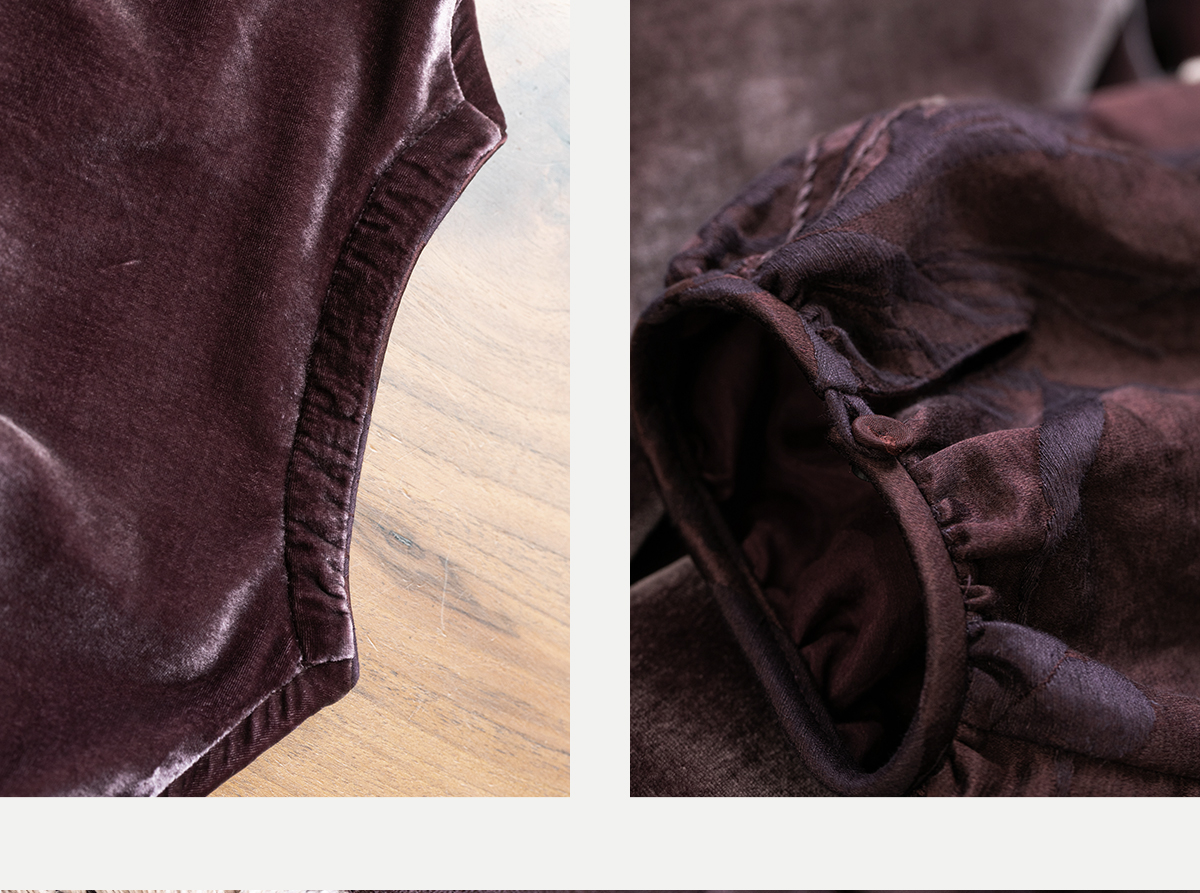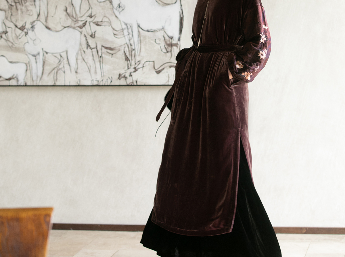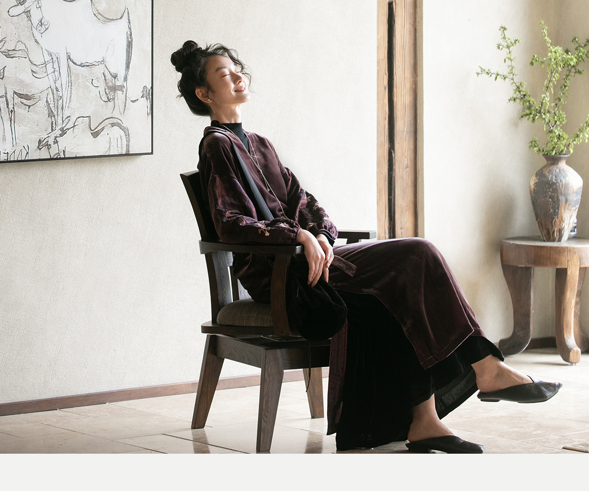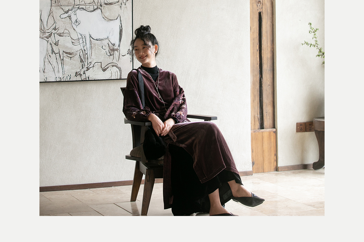 牧衣游原创丝绒手工刺绣连衣裙新款古朴东方V领气质宽松长裙 李子