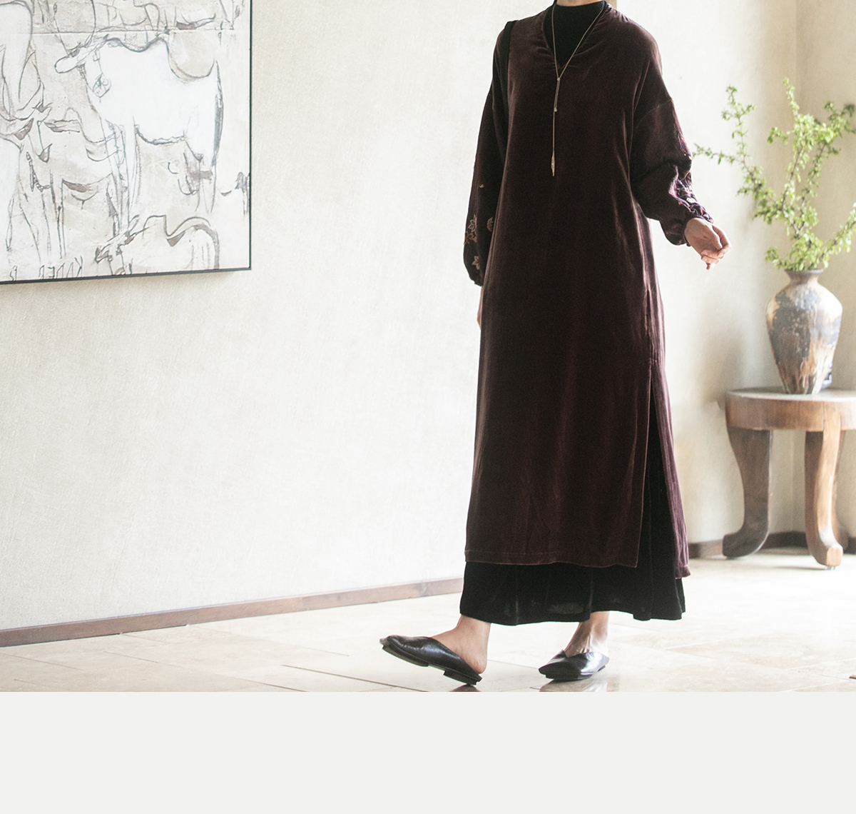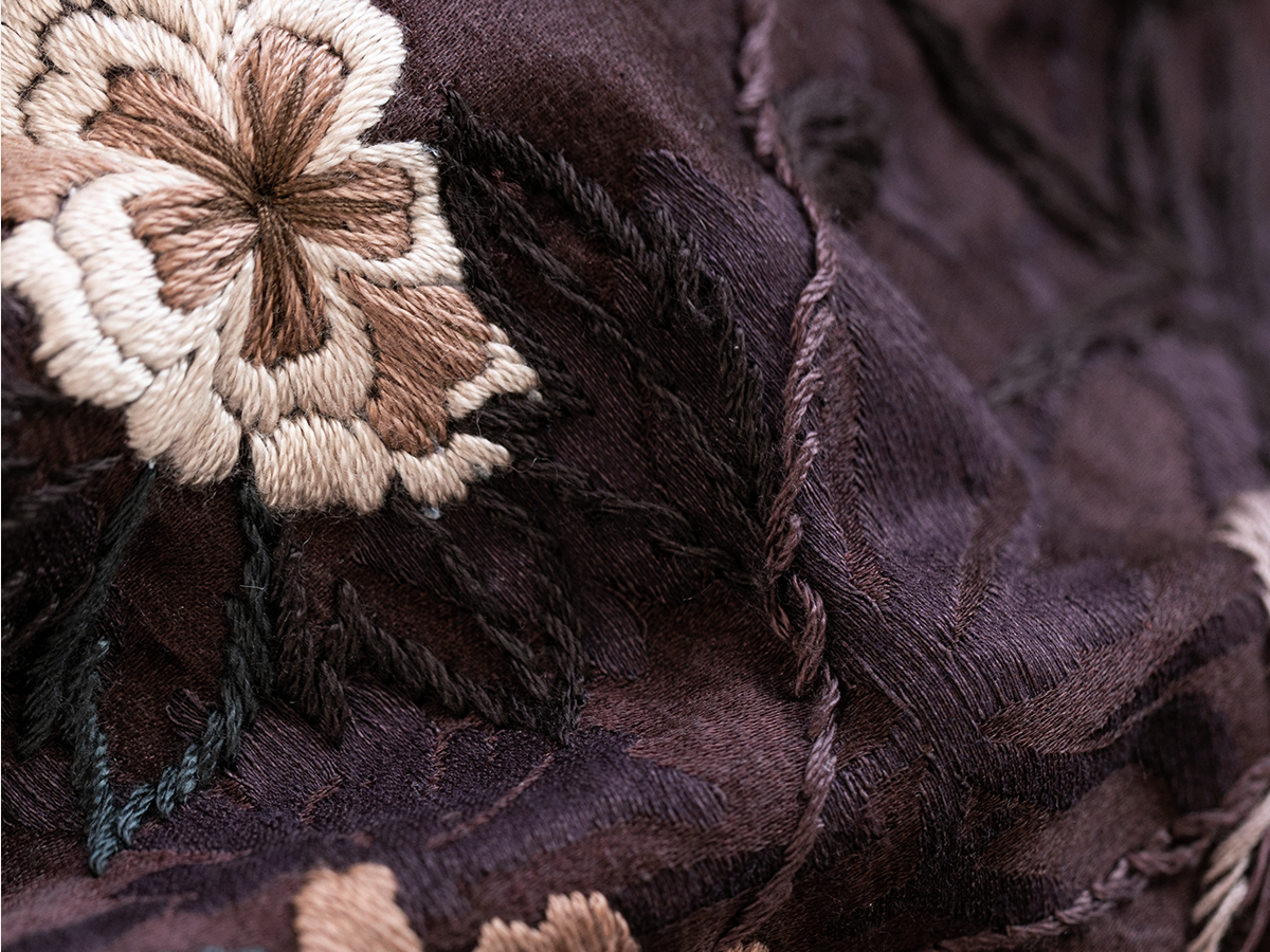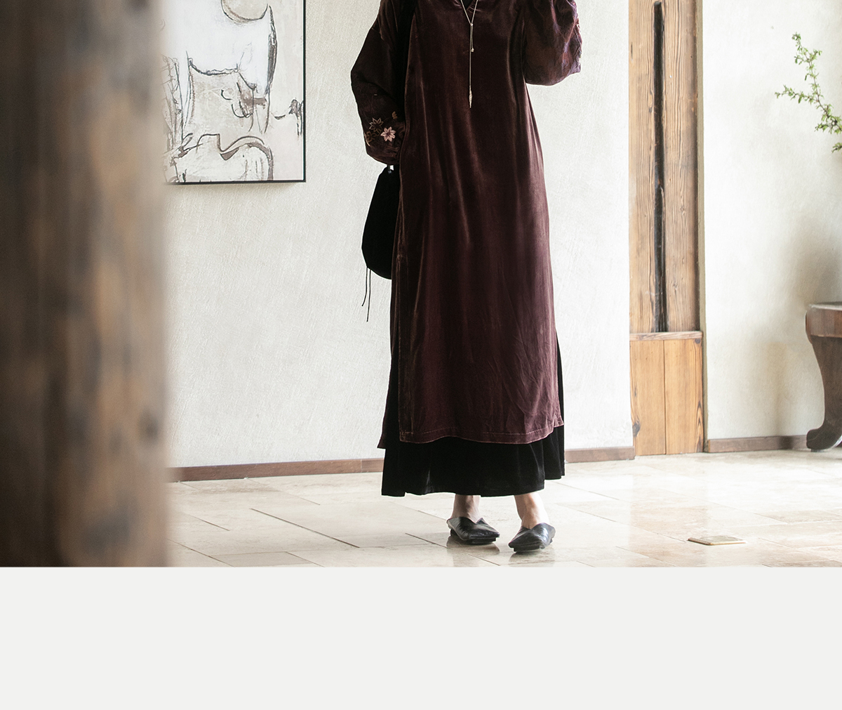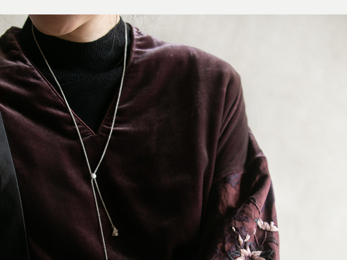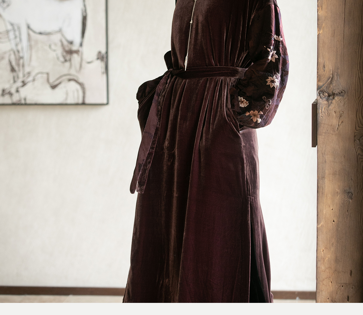 牧衣游原创丝绒手工刺绣连衣裙新款古朴东方V领气质宽松长裙 李子