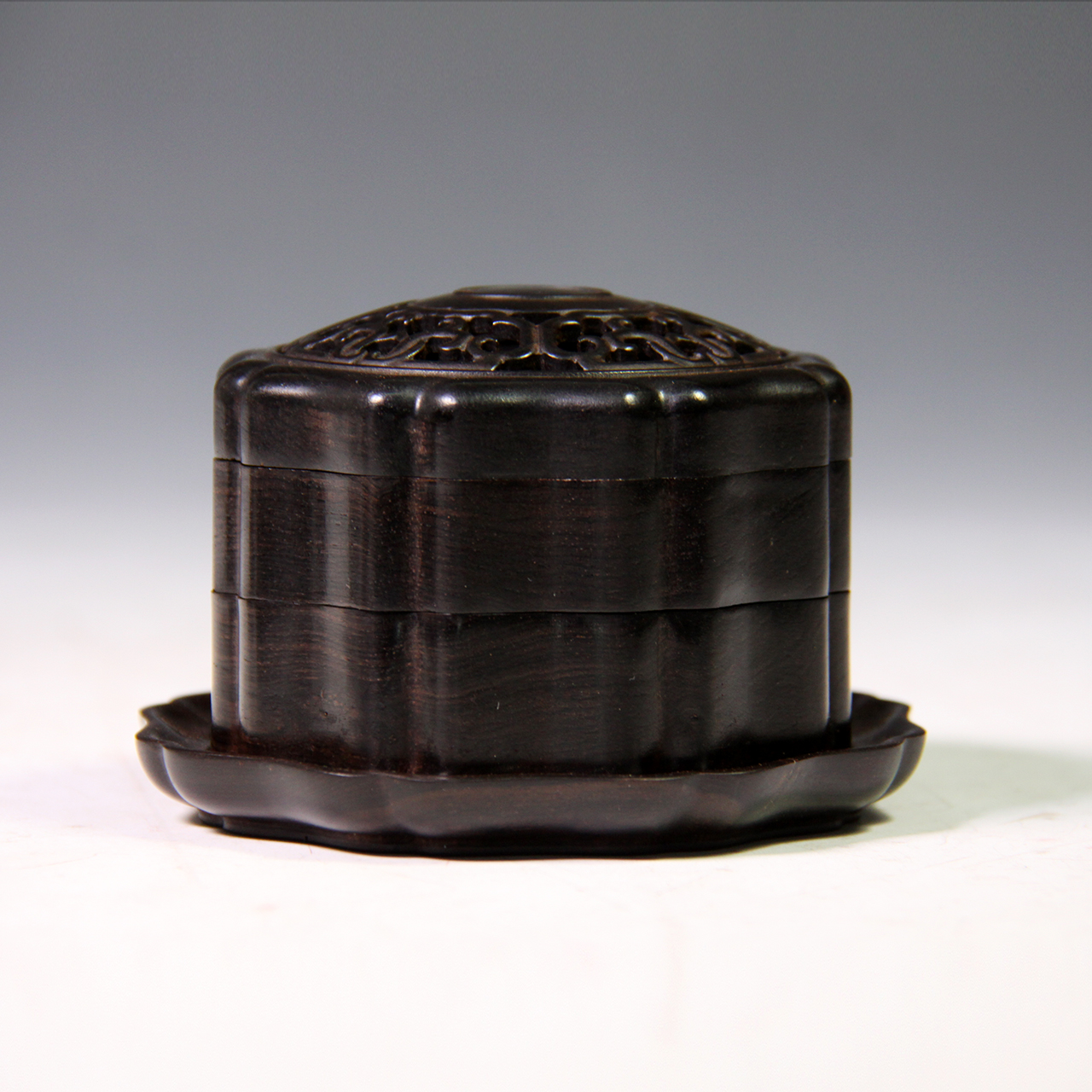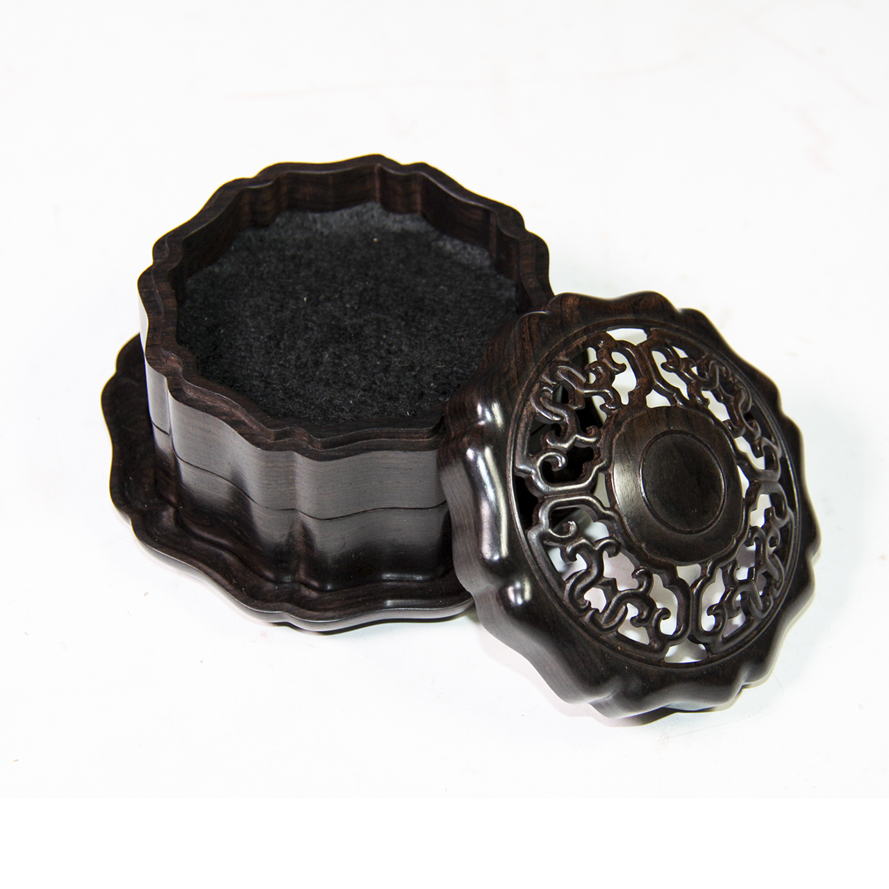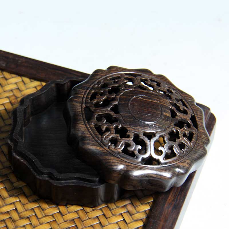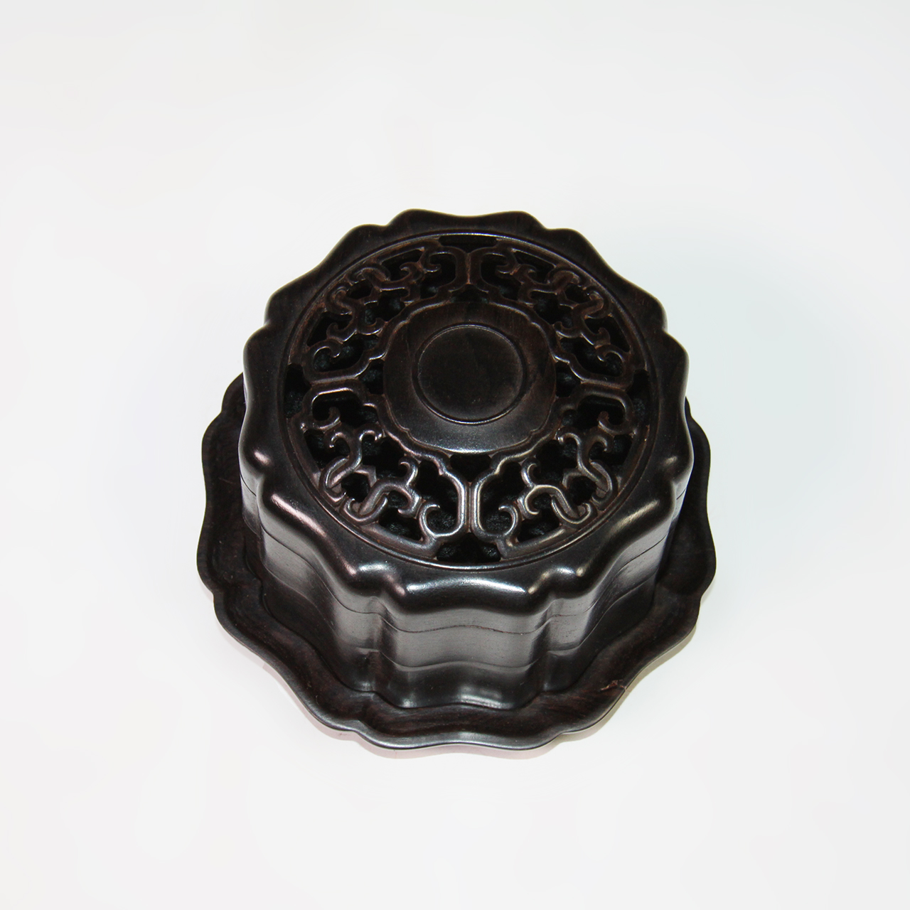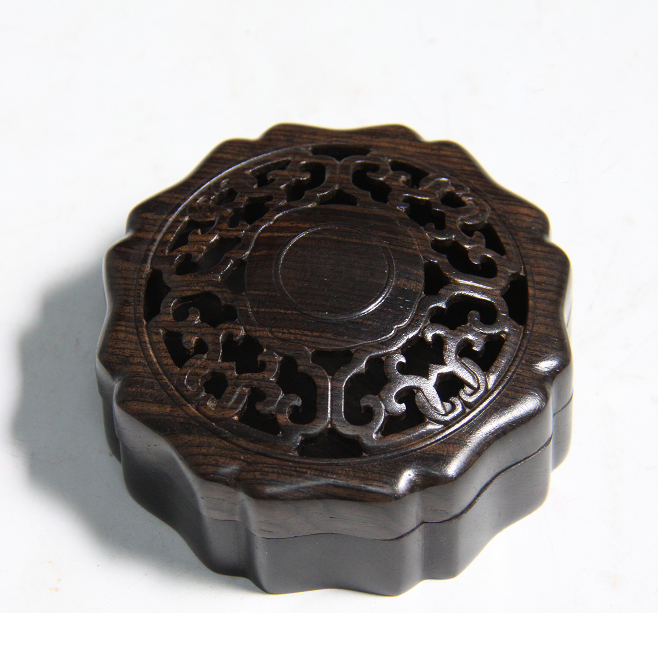 材质:紫光檀品名:圆形花瓣式勾连纹°双层盘香盒