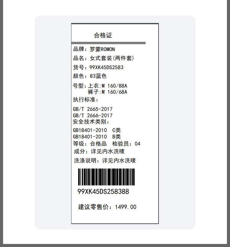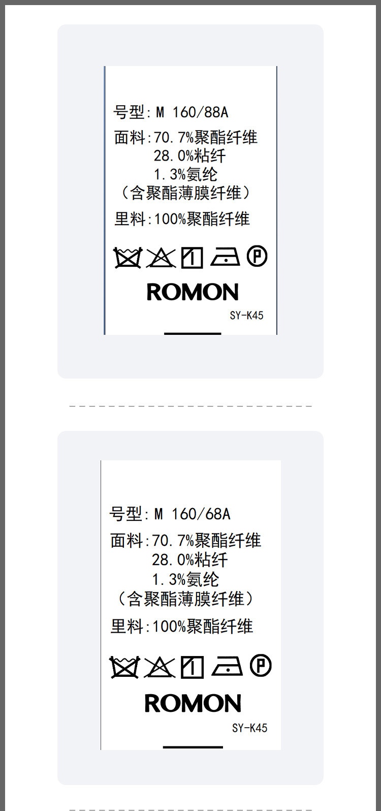 面料:70.7%聚酯纤维 28.0%粘纤 1.3%氨纶 (含聚酯薄膜纤维) 里料:100%聚酯纤维