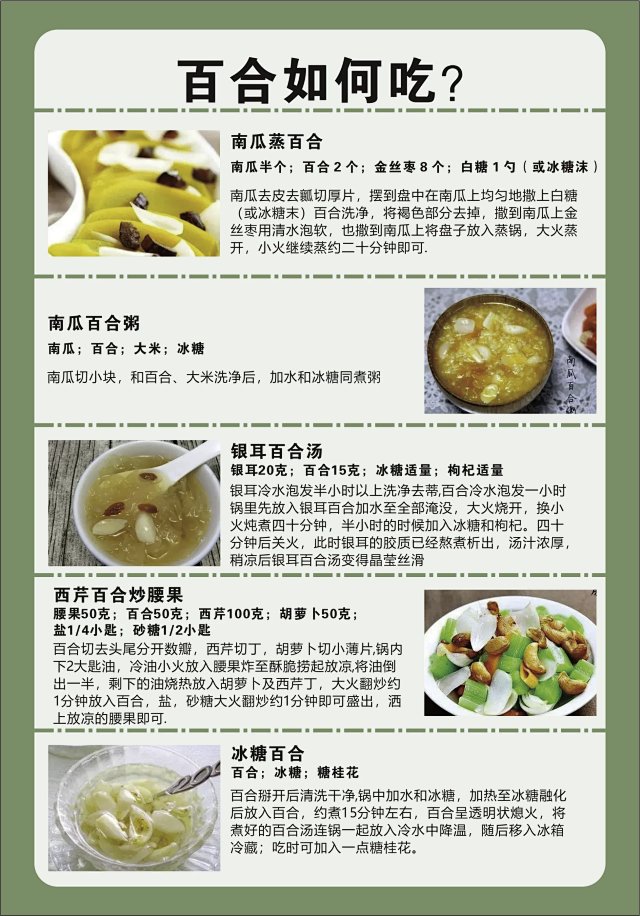 小贴士:百合含有淀粉、蛋白质、钙、磷等营养成分,具有润肺止咳、清脾chu湿、补中益气、清心安神的功xiao。煮熟后的百合略带苦味,但细细品来,则苦味变甜,甜而生津。