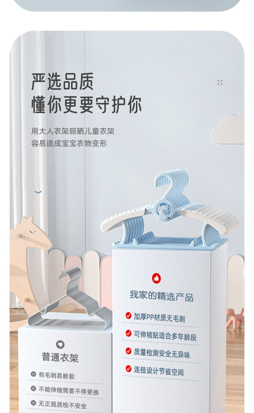 【19.9到手十件!多功能可伸缩儿童衣架】小衣服挂,心情悠扬。多功能可伸缩,适用新生儿。防滑无痕晾晒,撑衣稳当,伸缩设计,婴袜儿裤,宝宝专属,萌趣可爱!