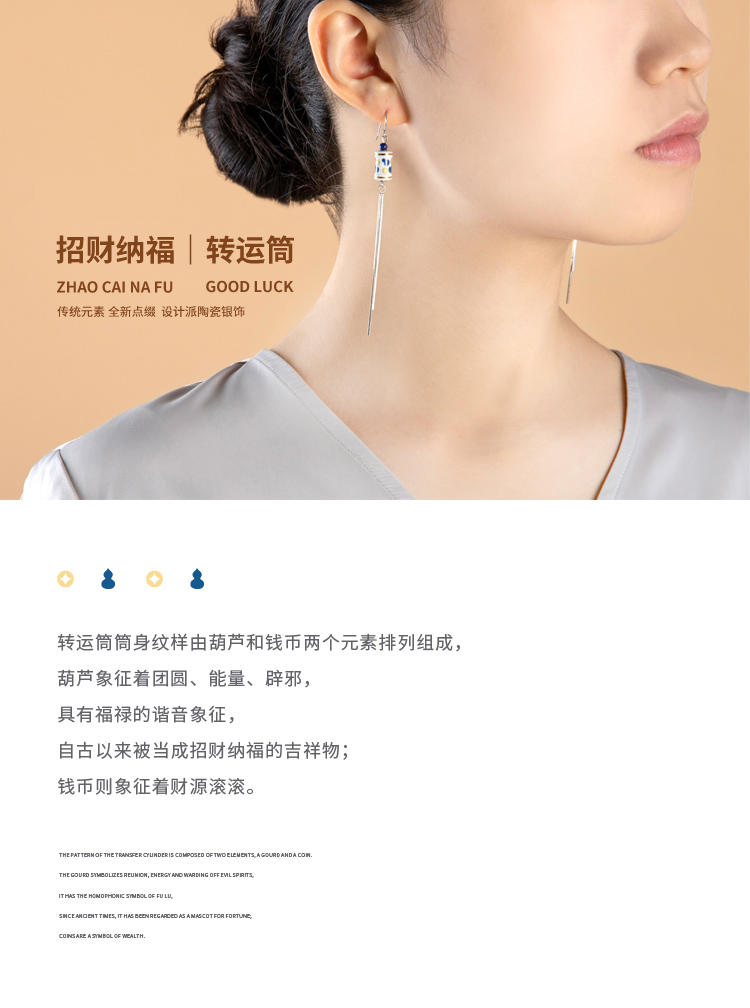 凡华造物青花转运筒转经轮首饰银饰耳环长款青花转运筒长款耳环