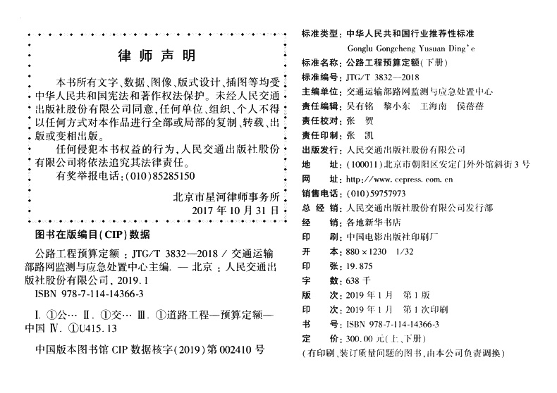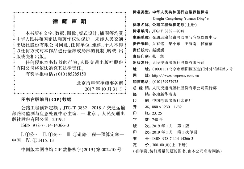 书名:公路工程预算定额(JTG/T 3832—2018)(上、下册)