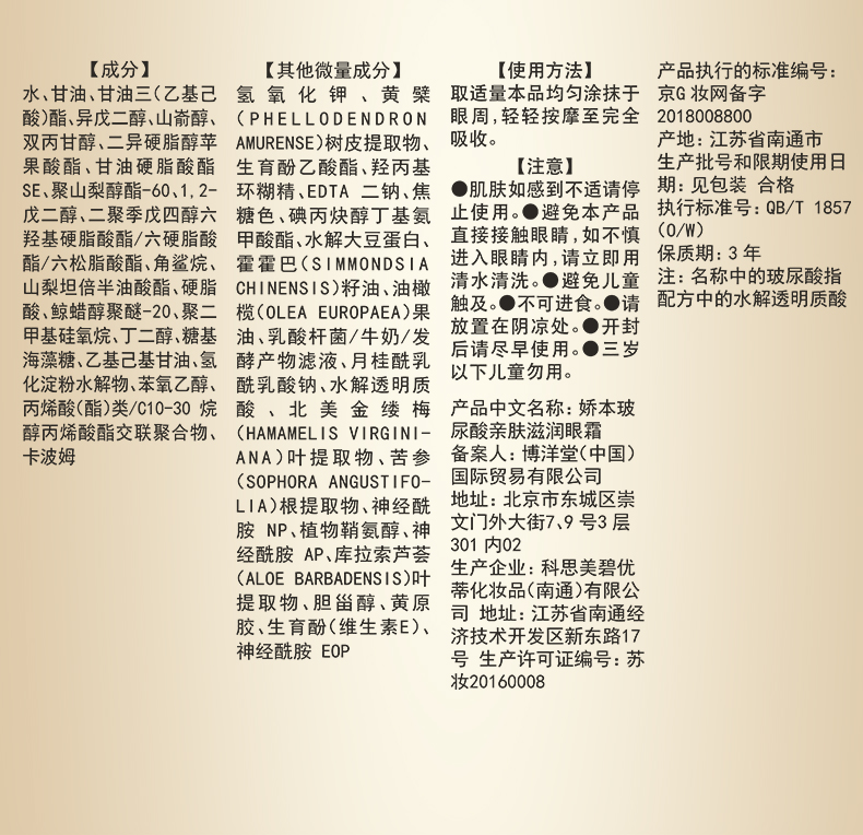 娇本玻尿酸亲肤滋润眼霜