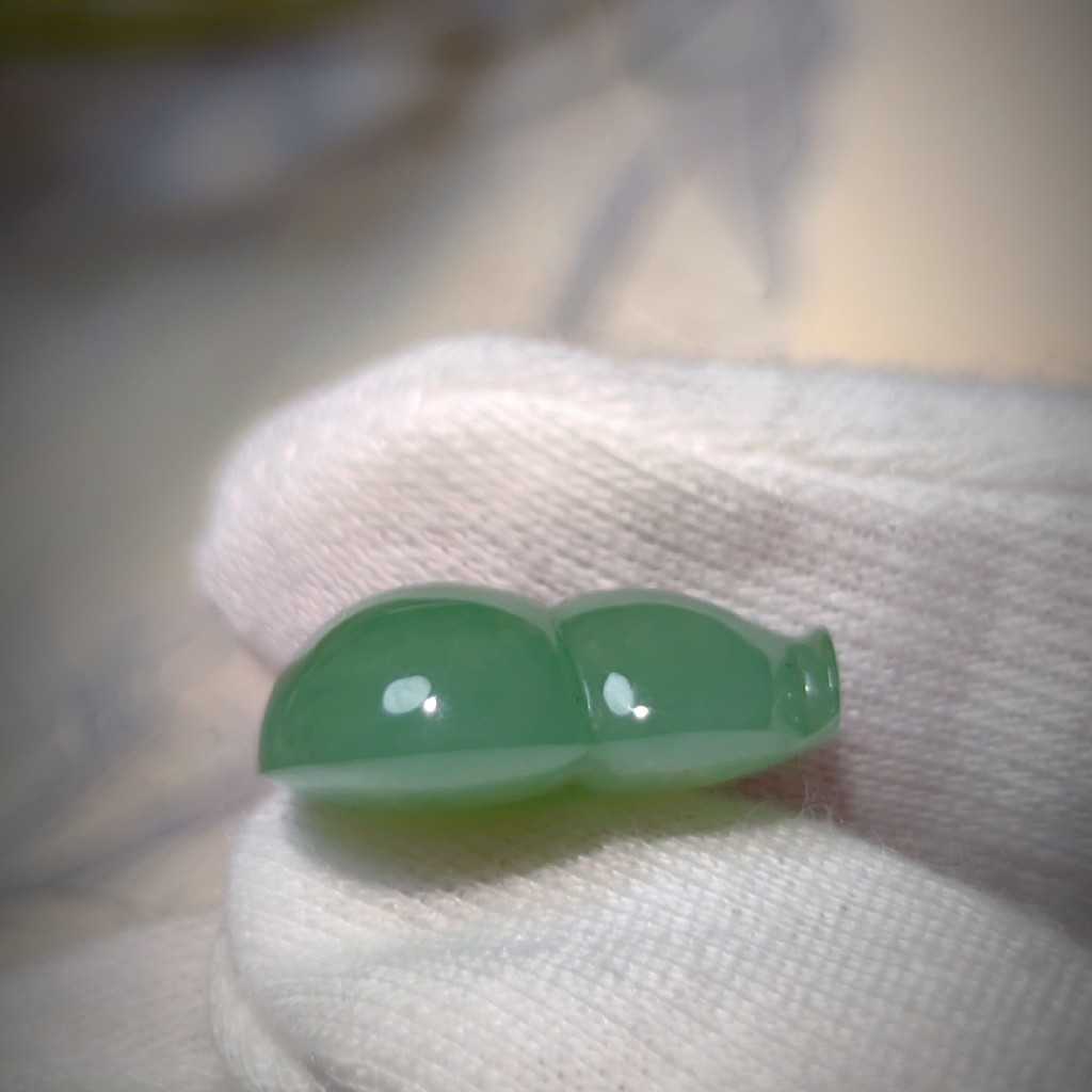 这是一枚清爽的翡翠小葫芦,恬淡的果绿色,清爽雅致不挑剔皮肤的颜色。水足料厚,一刀切的材料,肥嘟嘟的器型。无处不在显示着它的可爱。