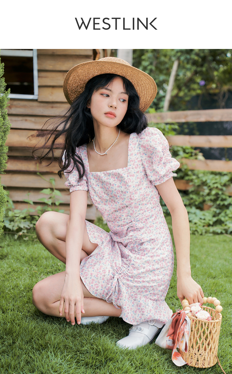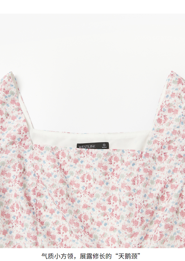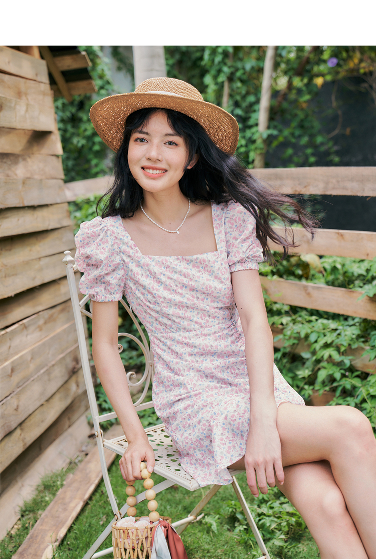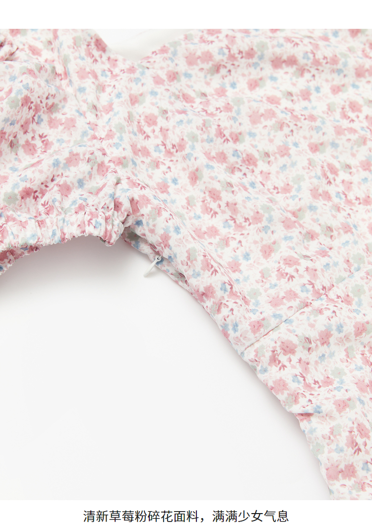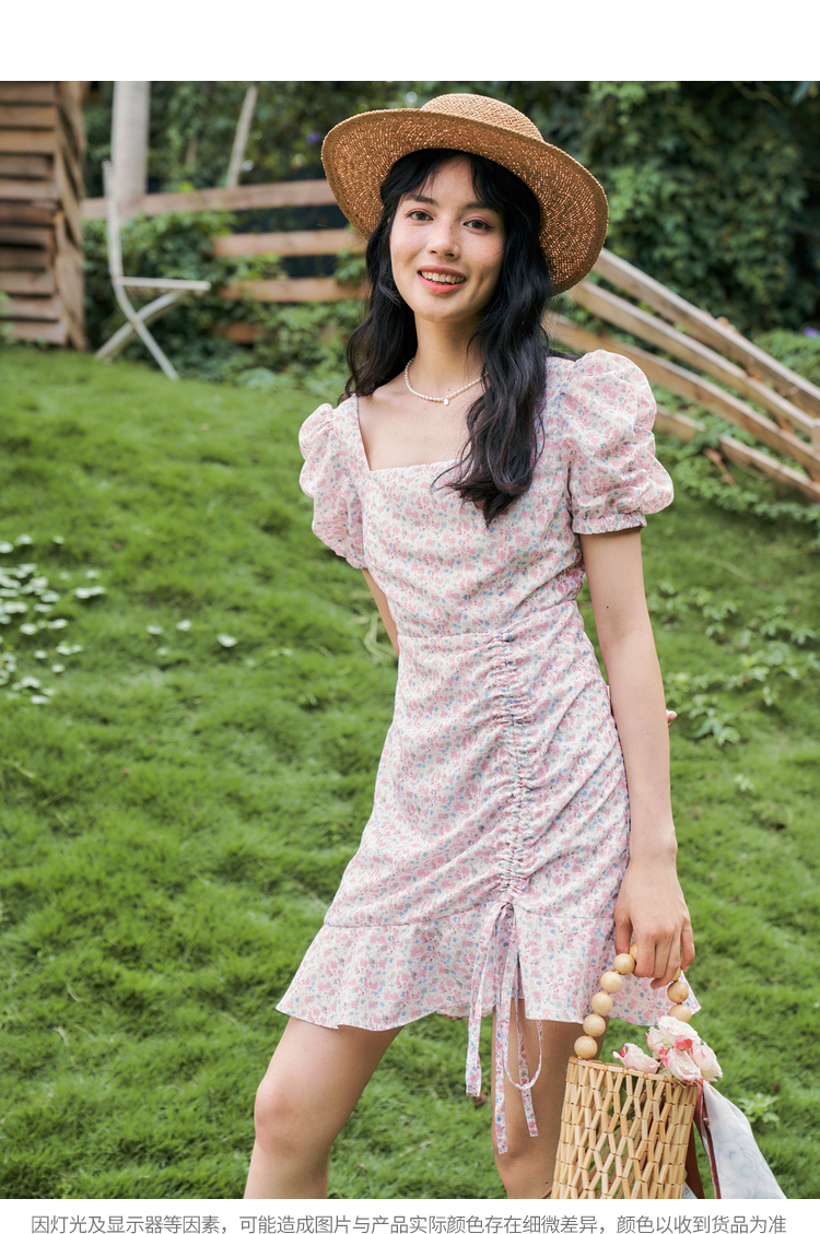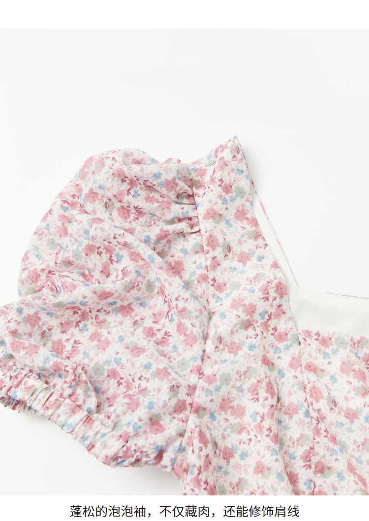 西遇法式碎花连衣裙春夏季新款泡泡袖性感裙子方领V0820558