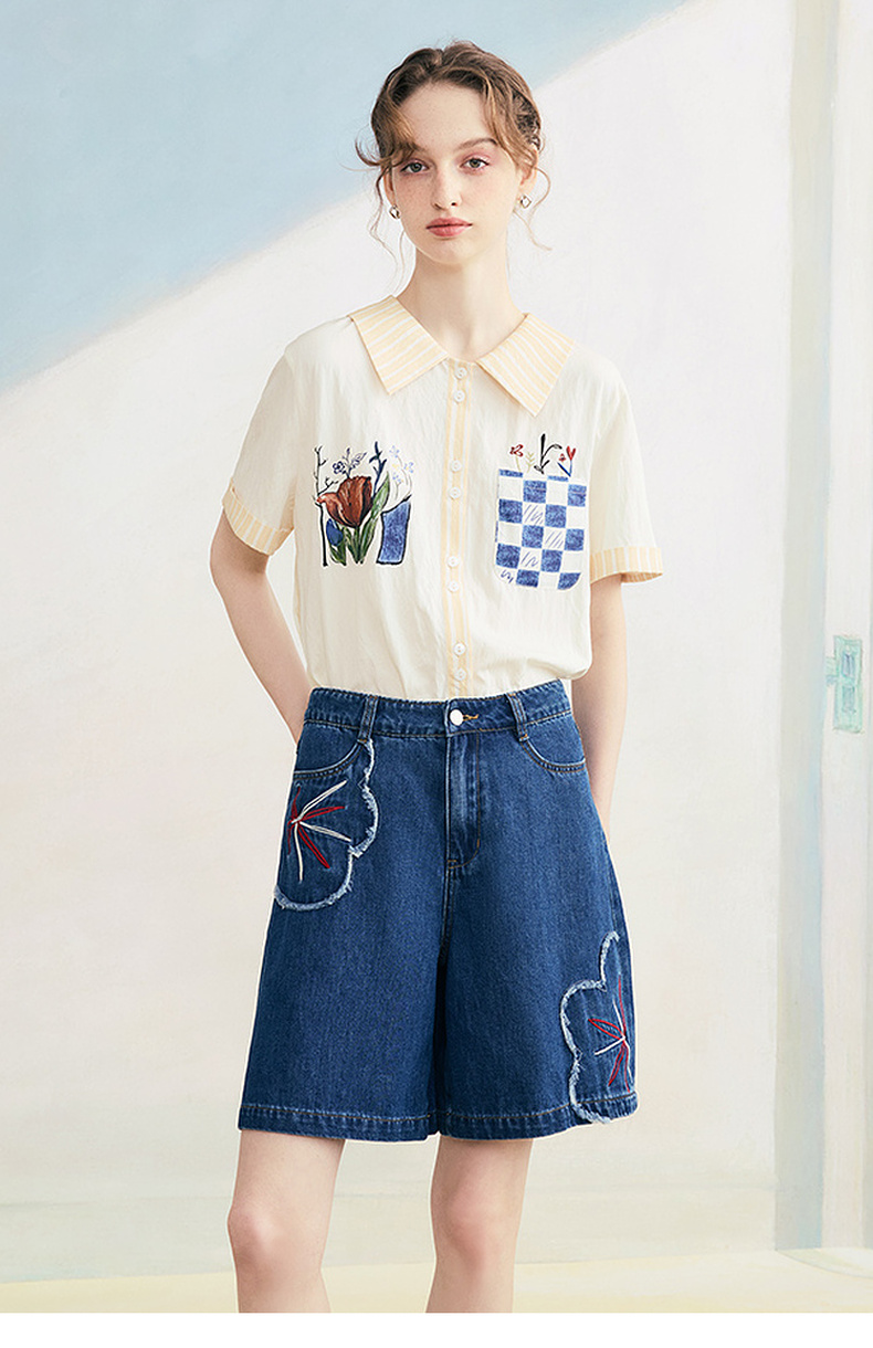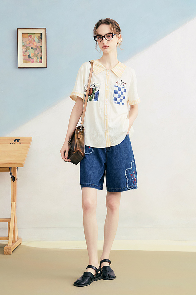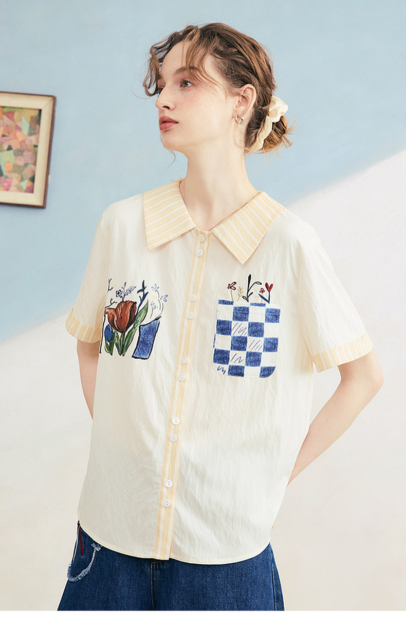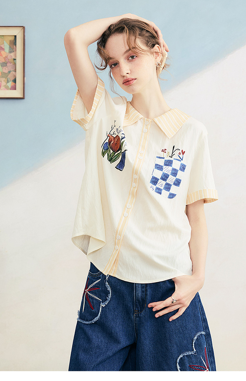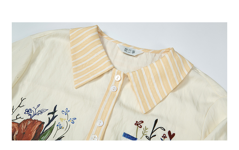 两三事 花影低喃 2025夏季新款小清新印花口袋短袖衬衫女宽松