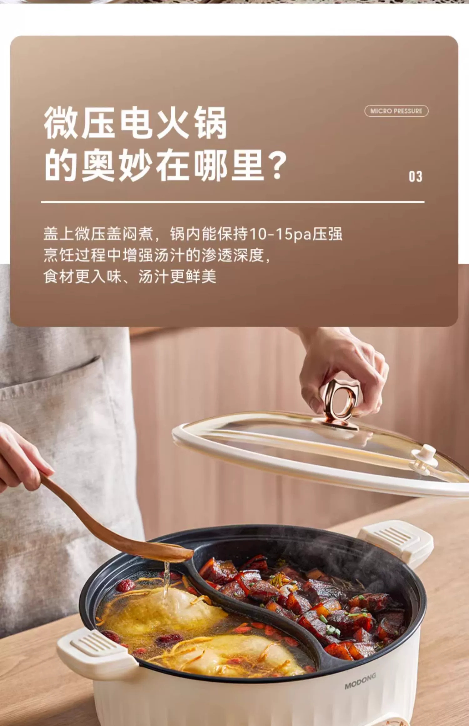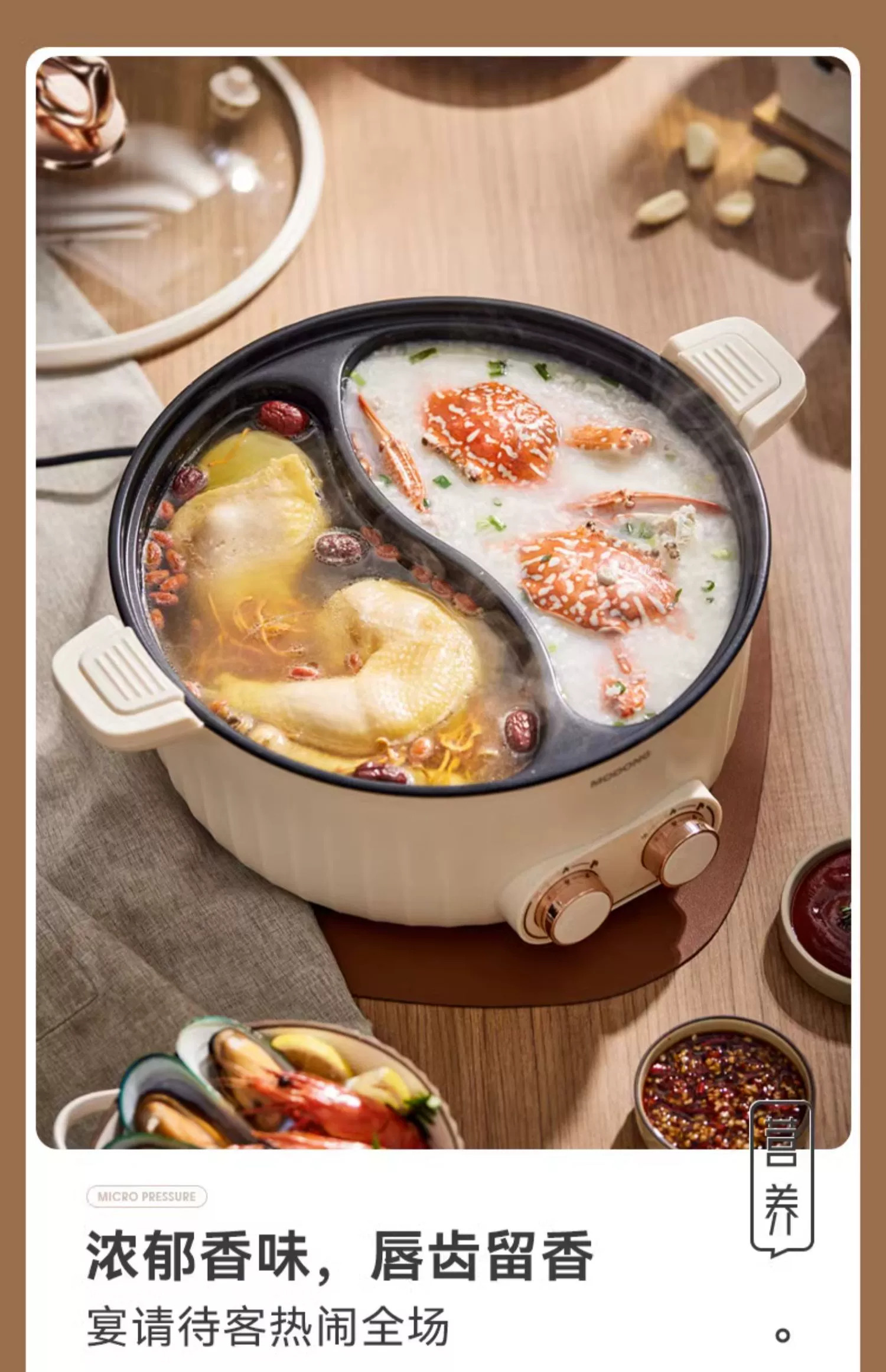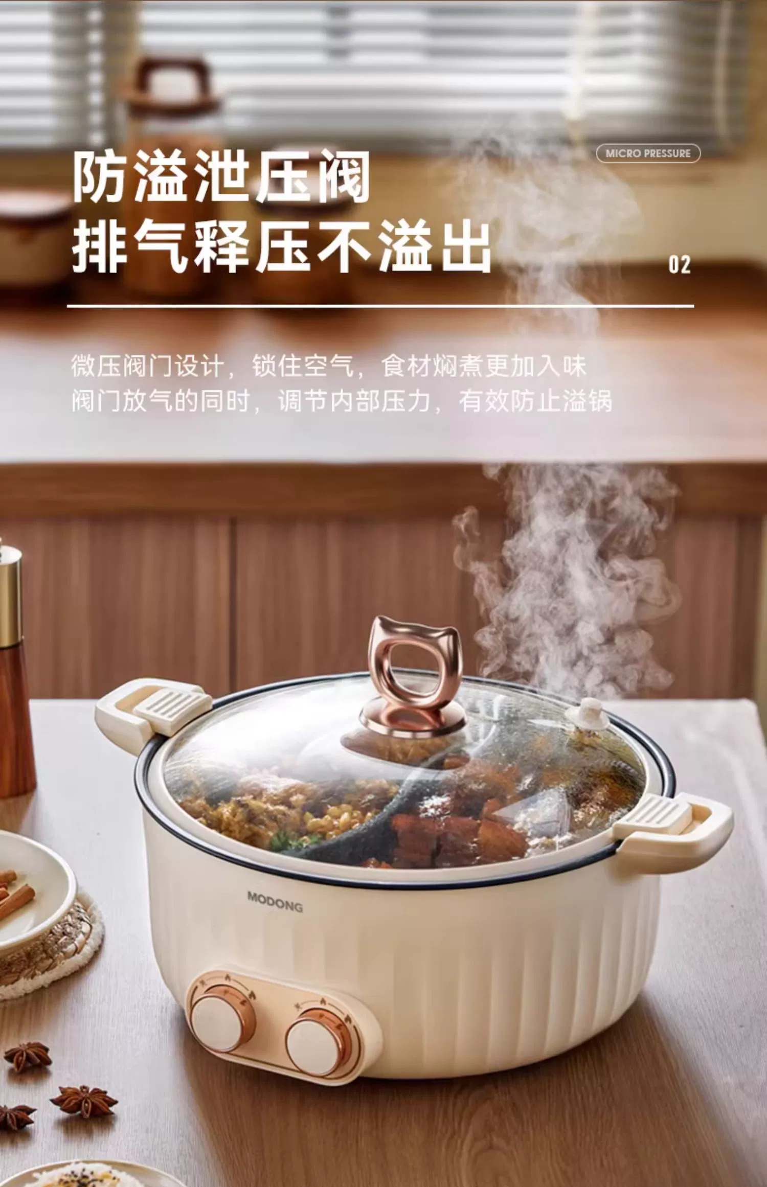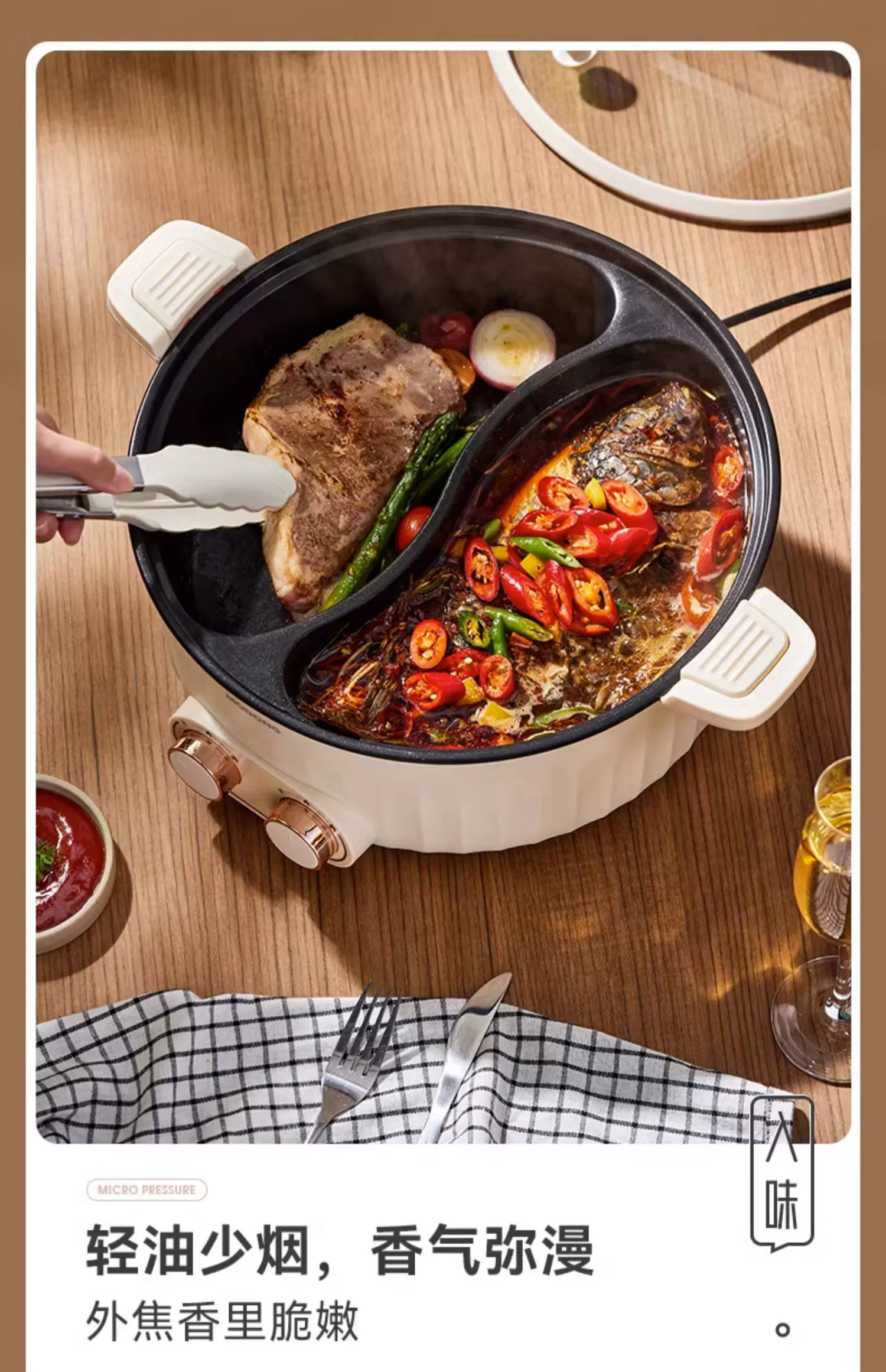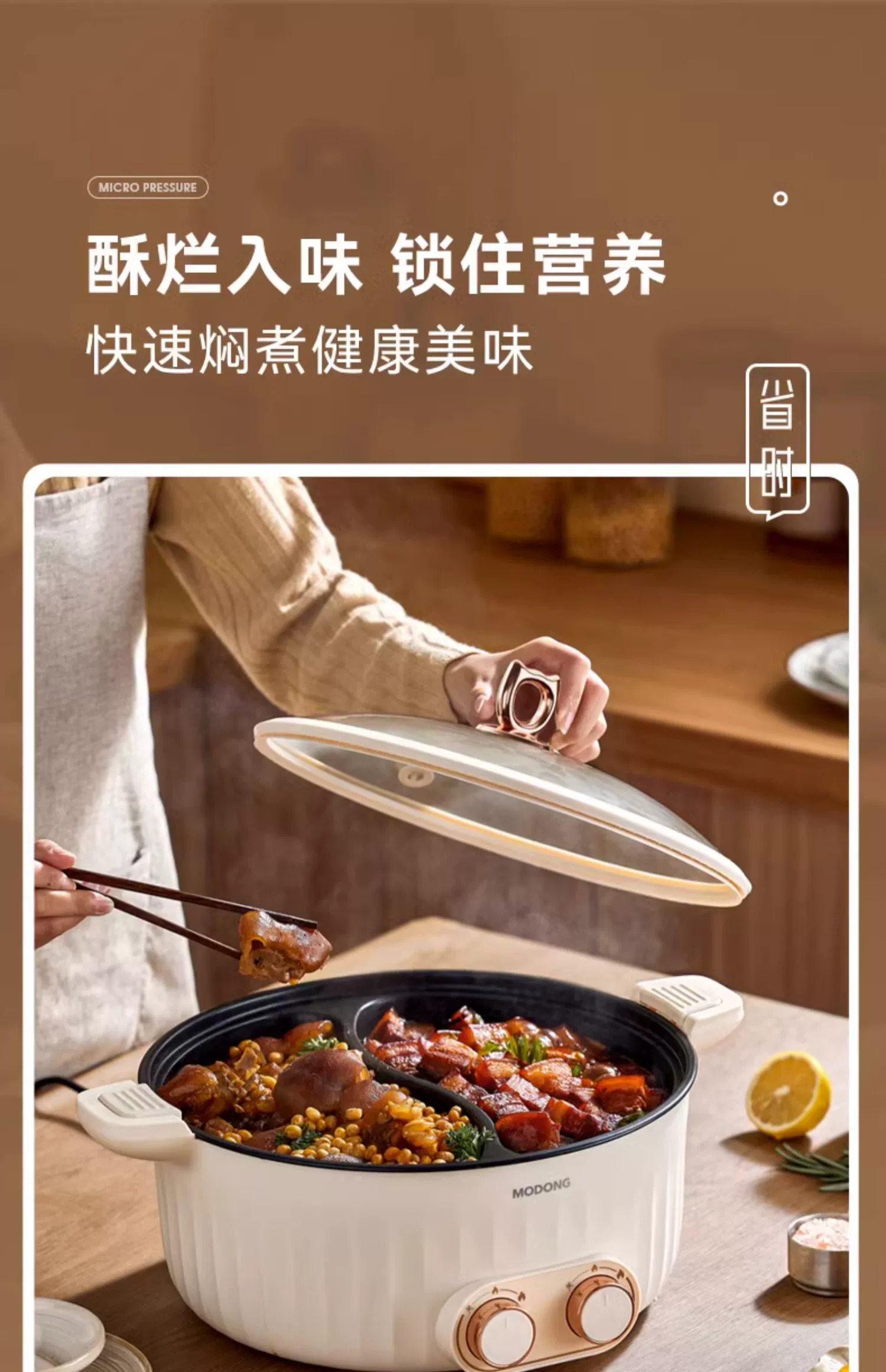 摩动鸳鸯电火锅家用微压小电锅6L大容量多功能一体电炒锅蒸电煮锅