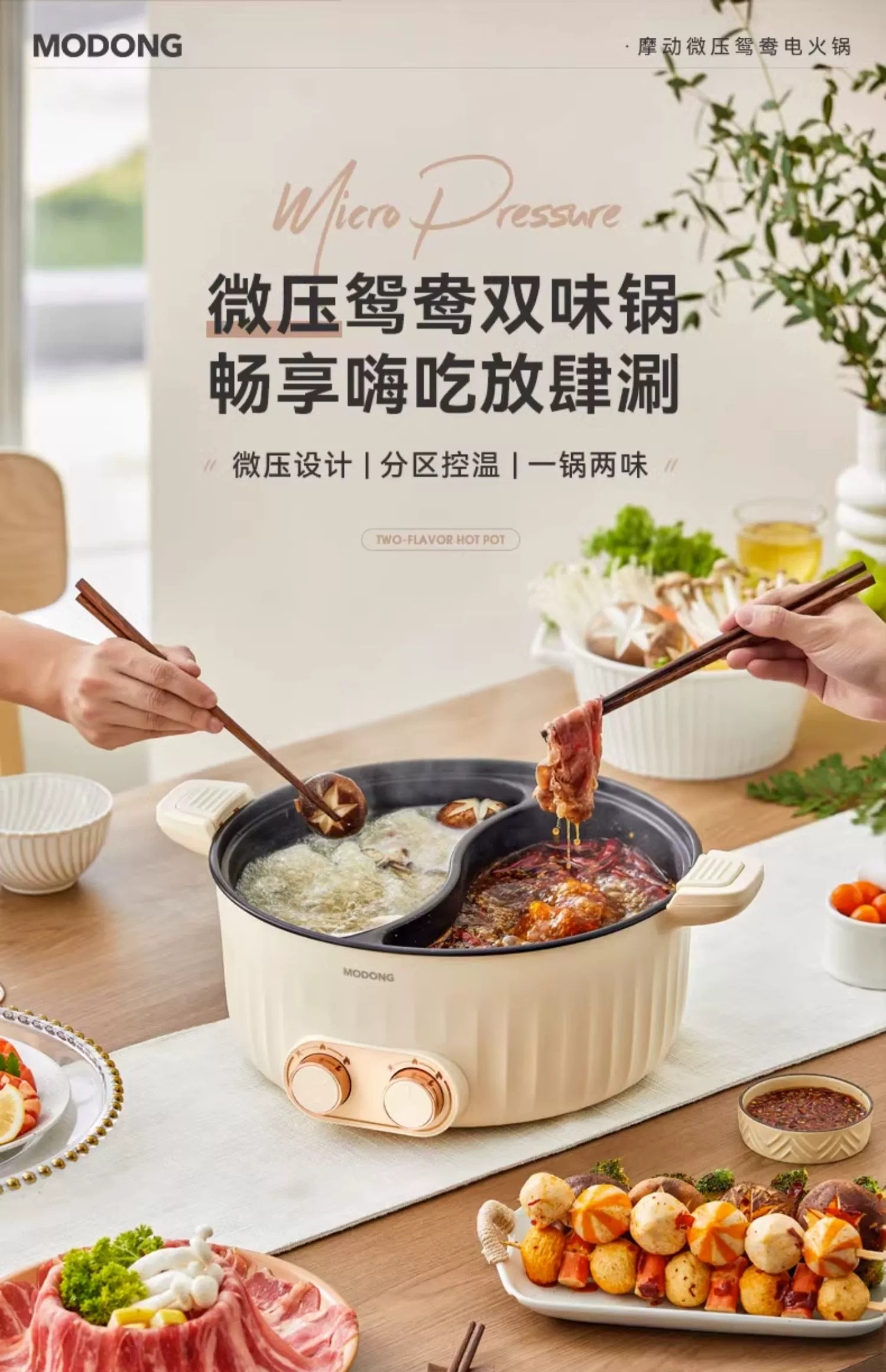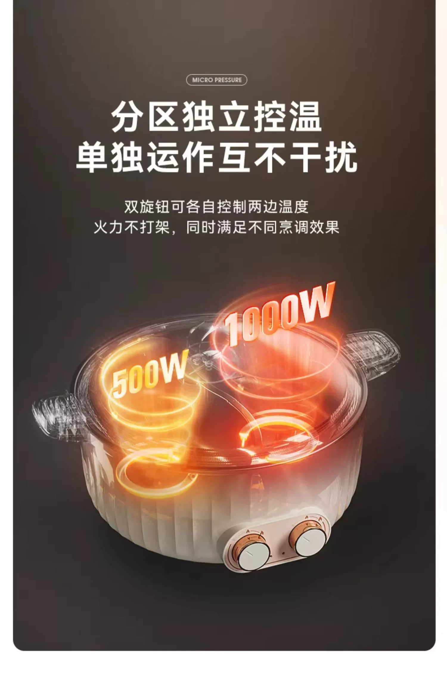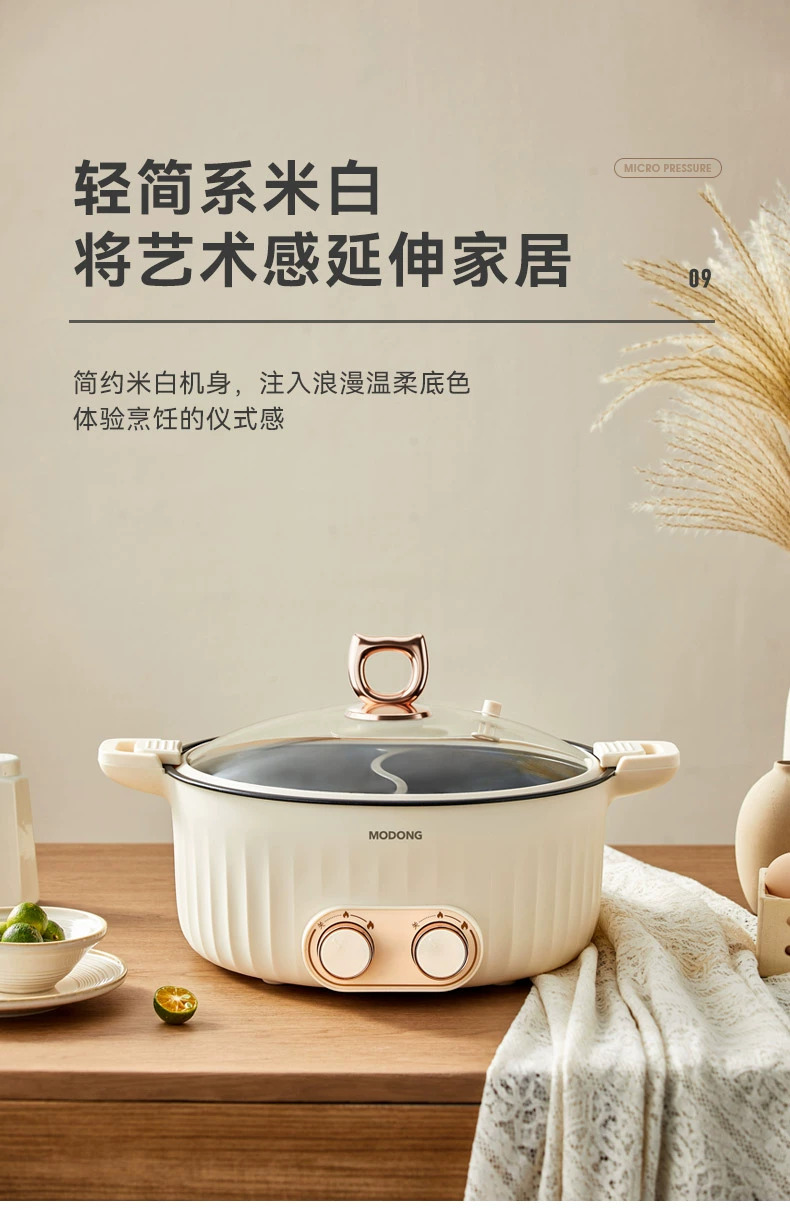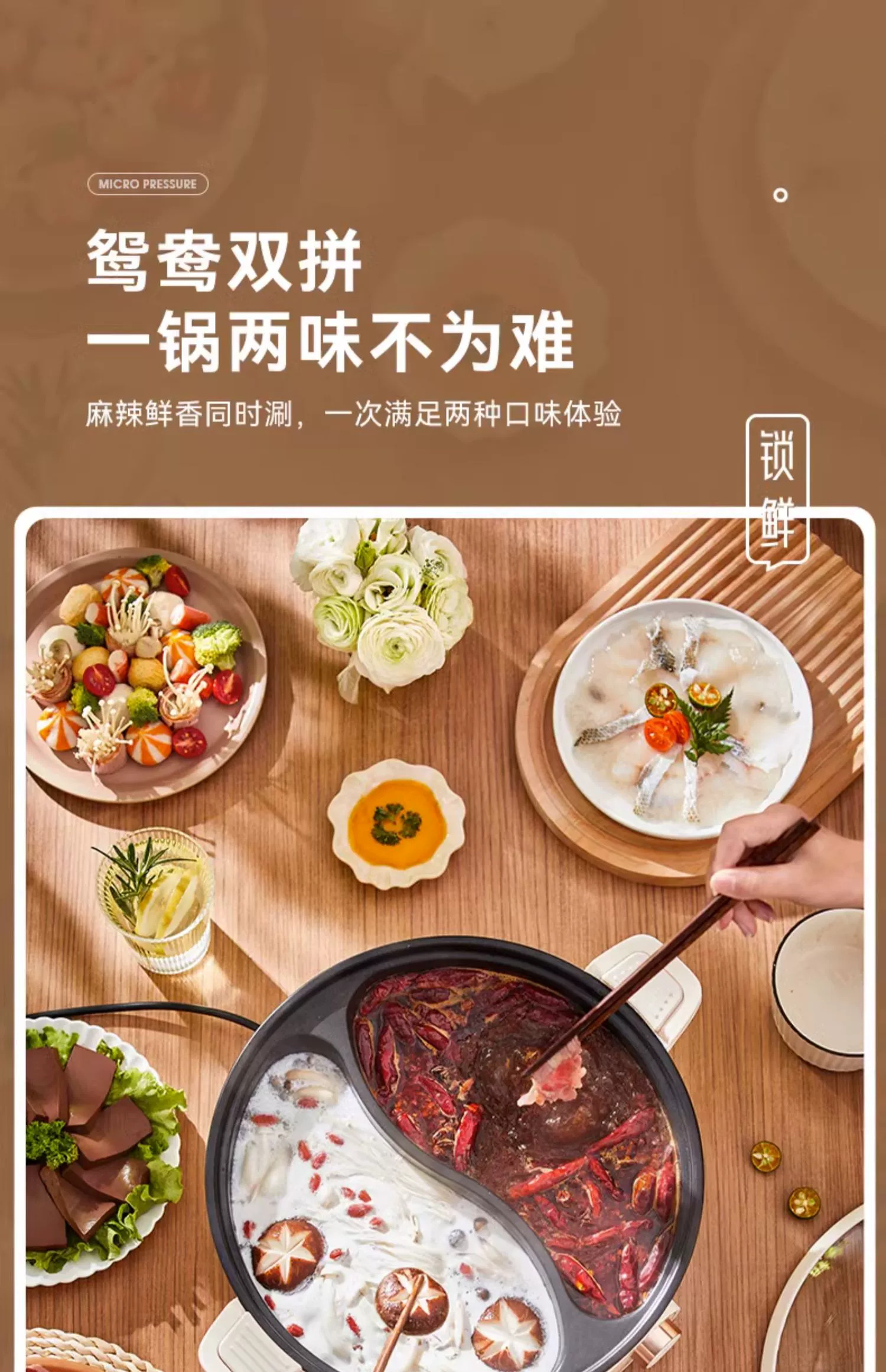 摩动鸳鸯电火锅家用微压小电锅6L大容量多功能一体电炒锅蒸电煮锅