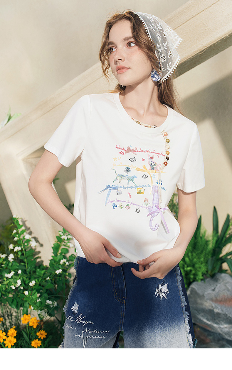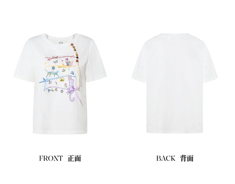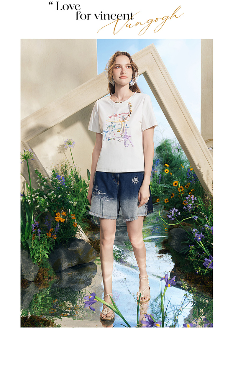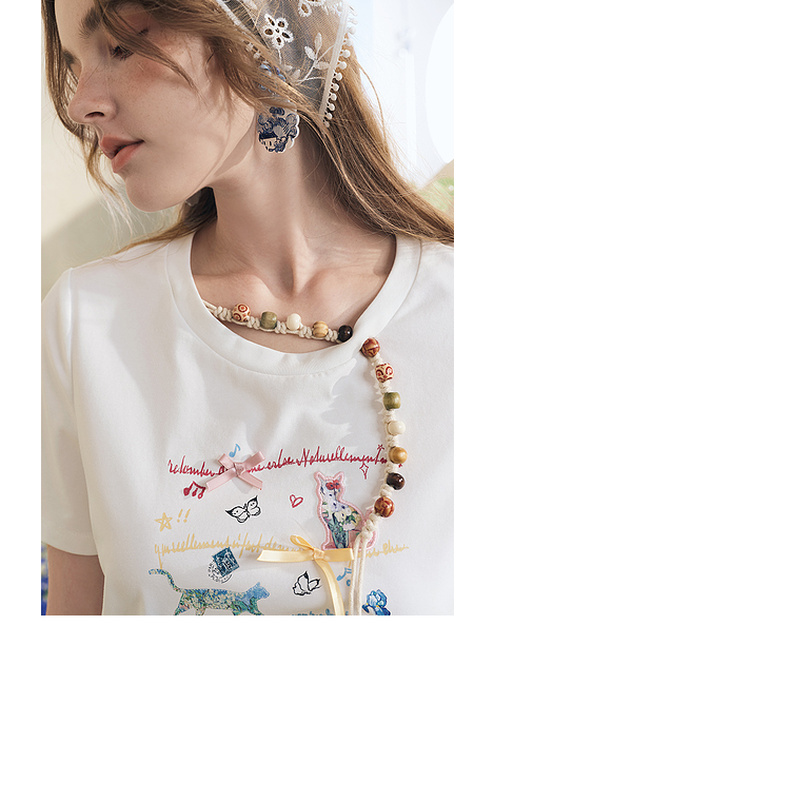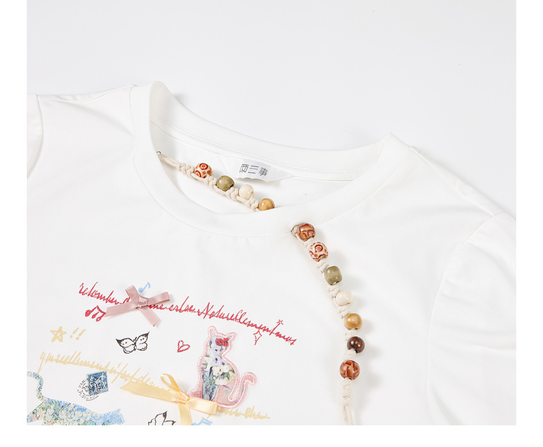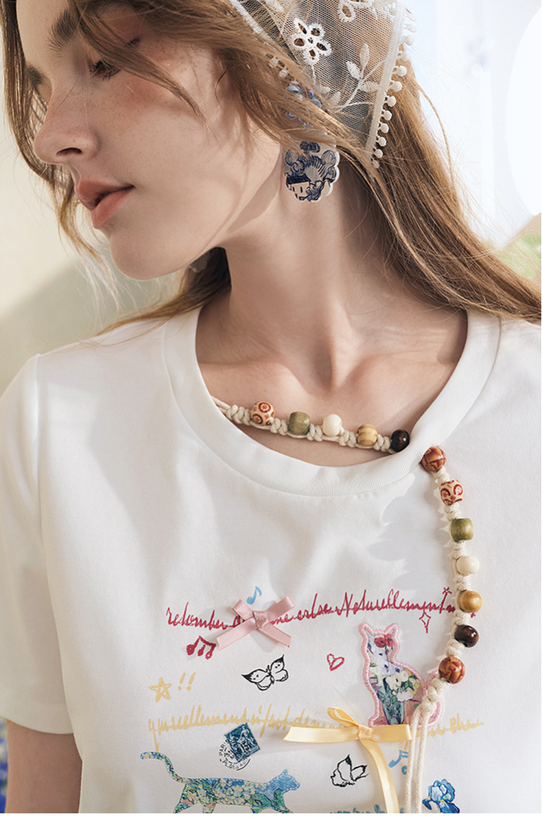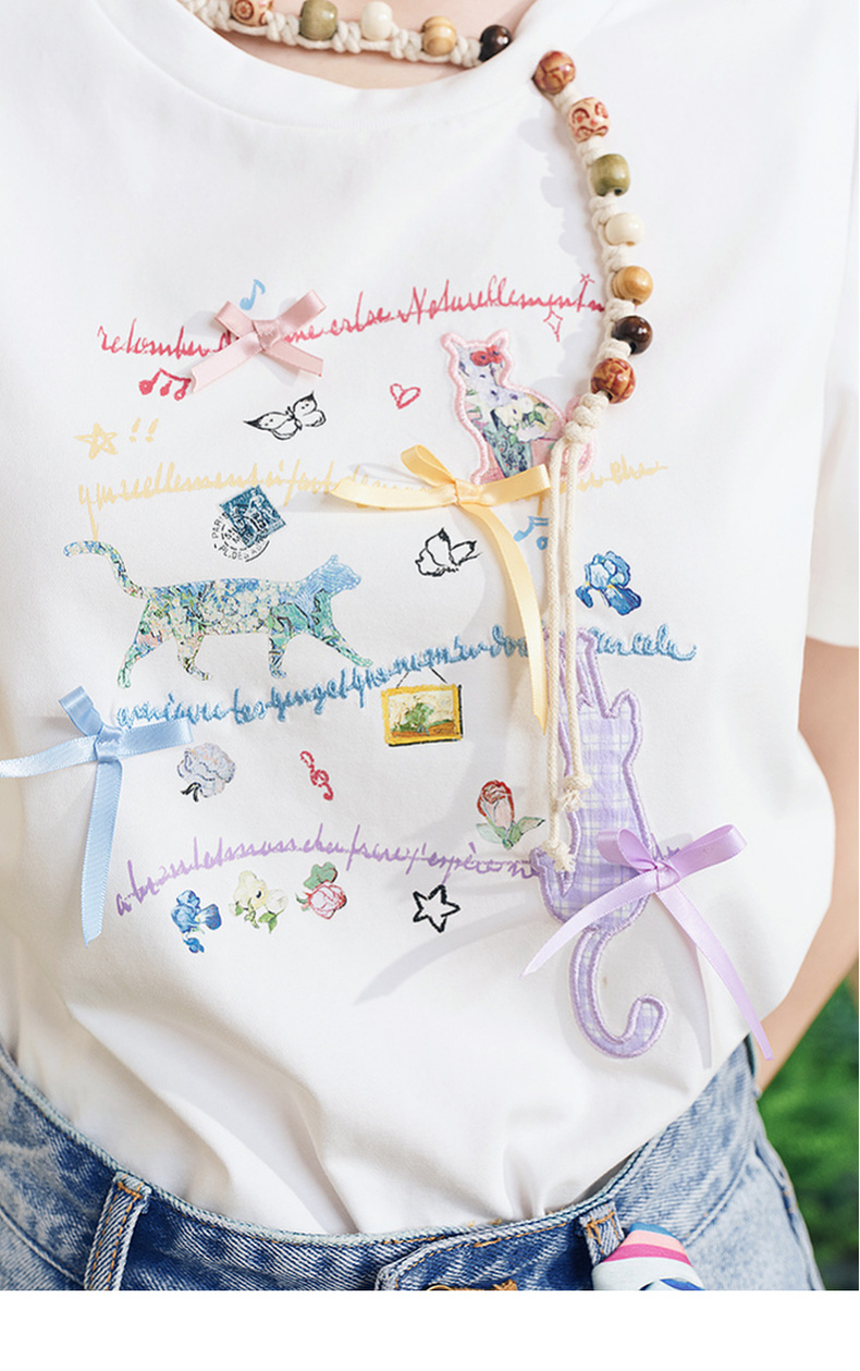 两三事梵高文艺 喵游记 2025夏季新款串珠装饰蝴蝶结贴布绣t恤女