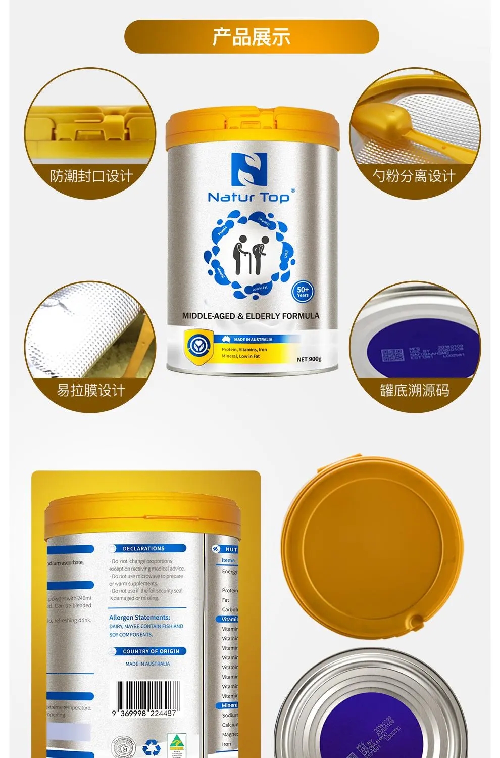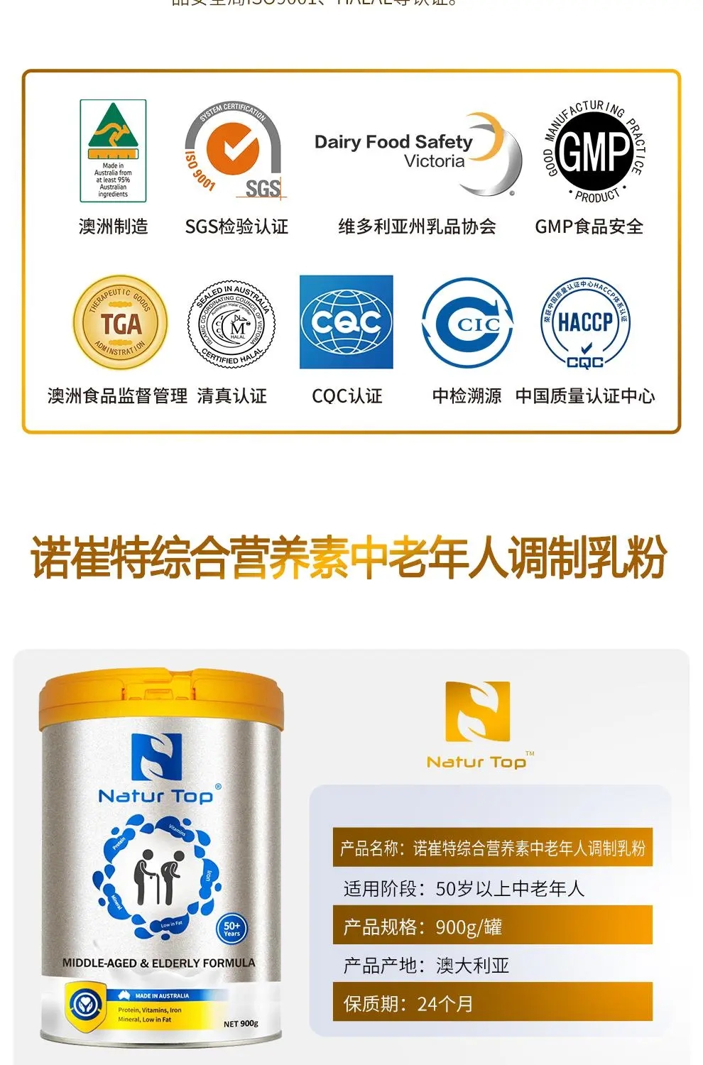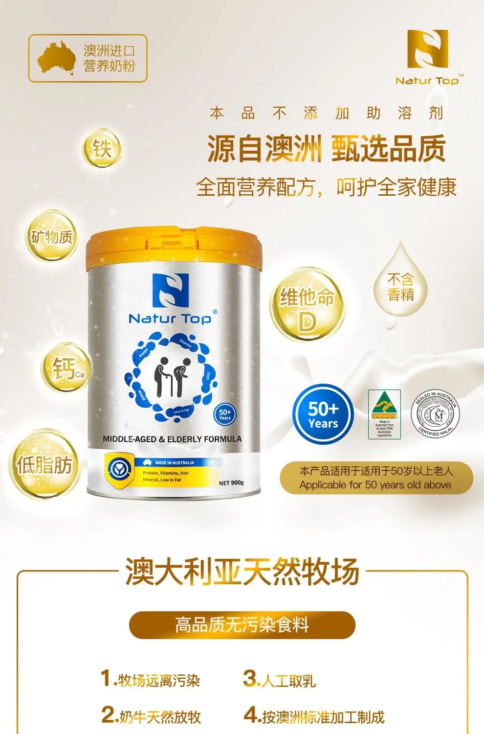 Natur Top诺崔特中老年奶粉低脱脂高钙无蔗糖澳洲进口牛奶粉900g