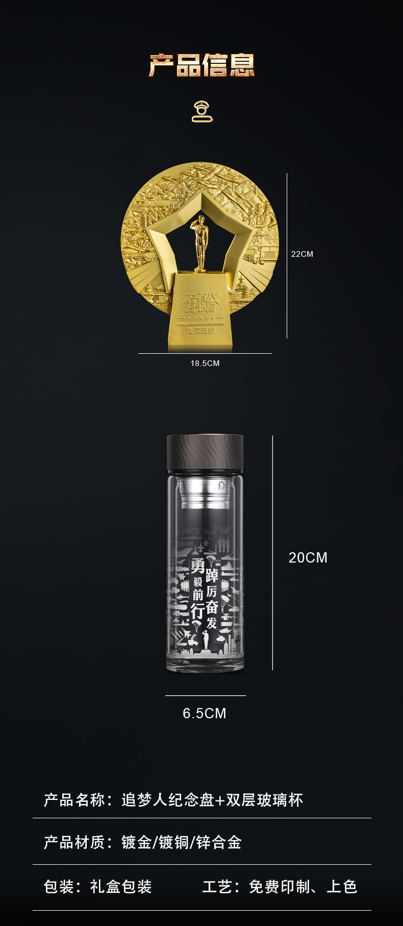 纪念品 追梦纪念盘 双层玻璃杯 强军包套装