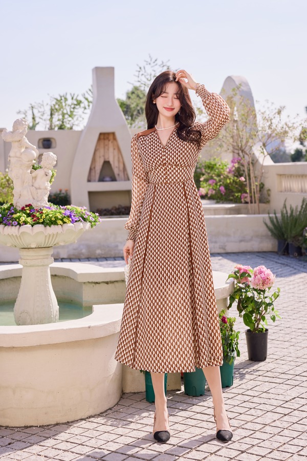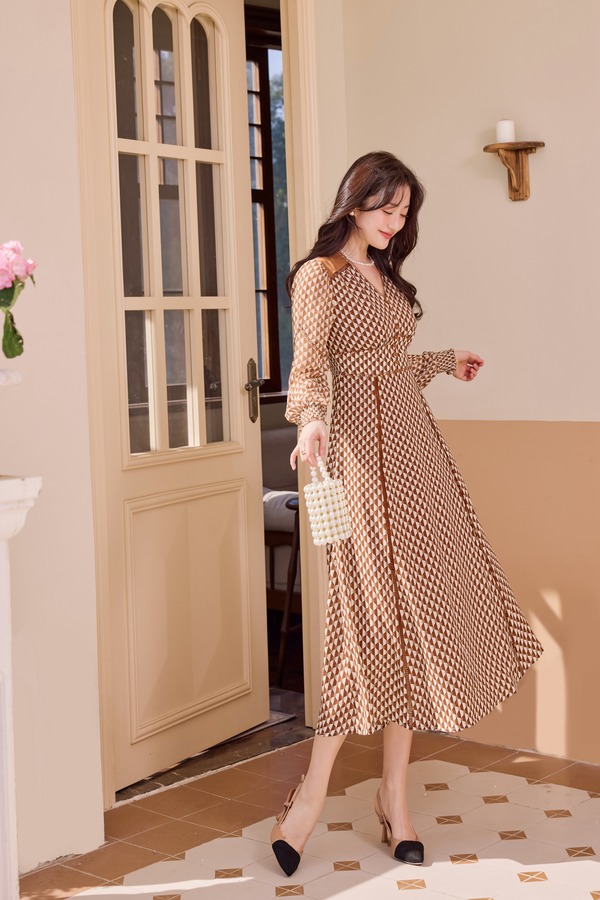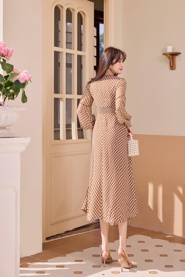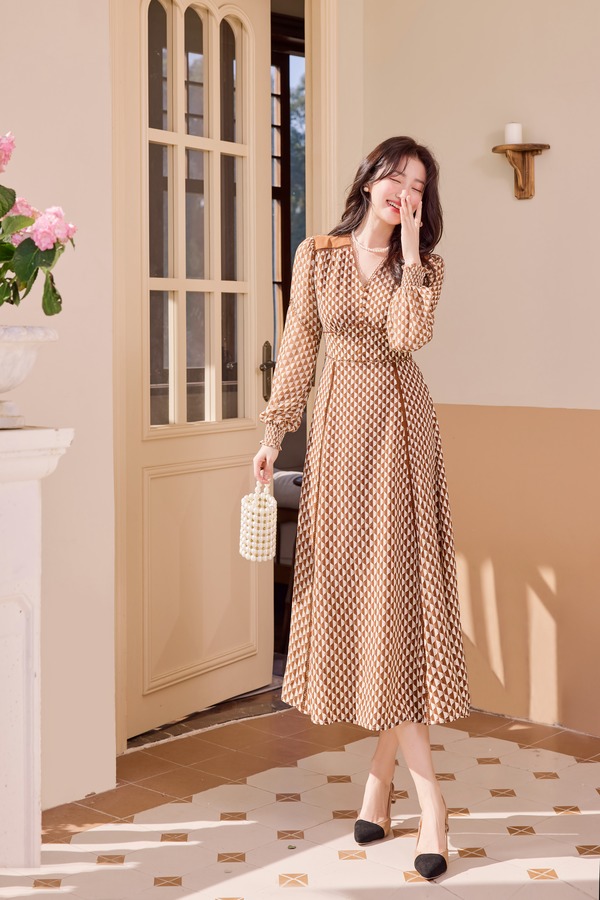 Le Malene 咖色翻领V领收腰印花连衣裙 19885