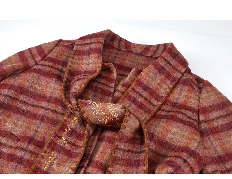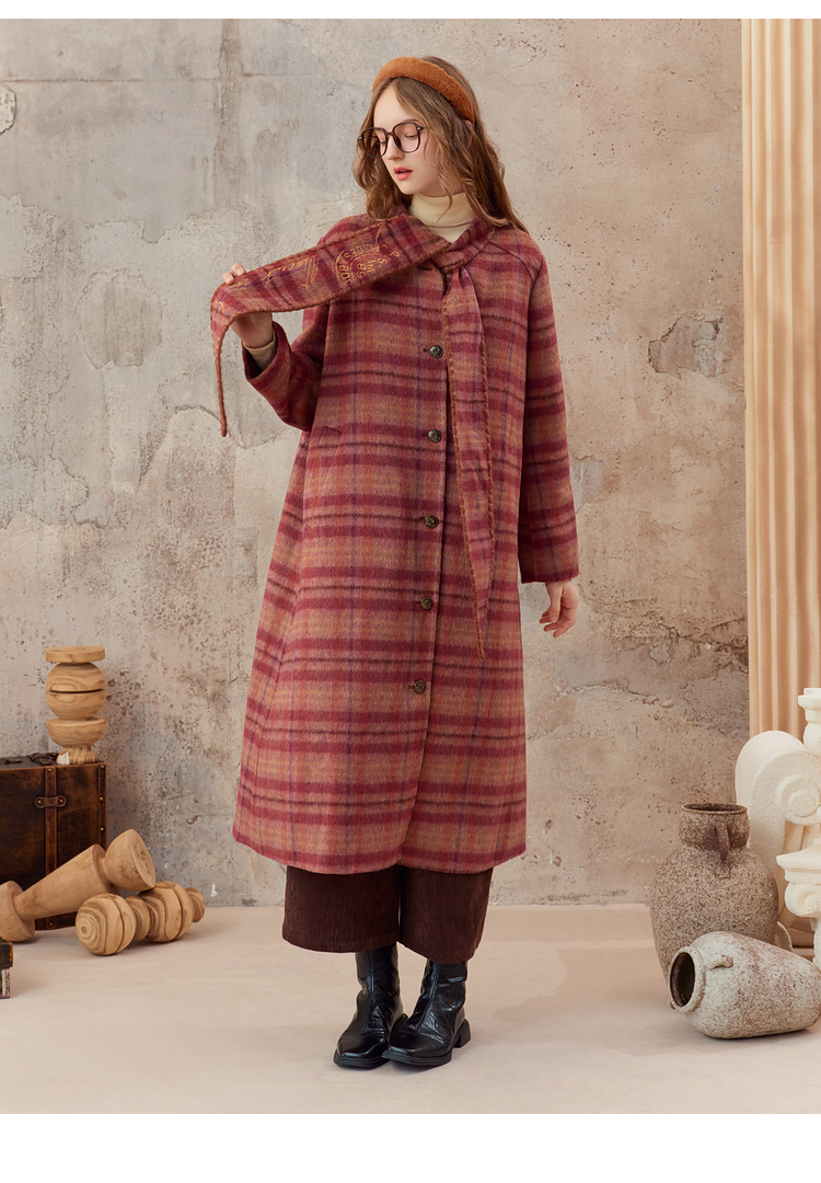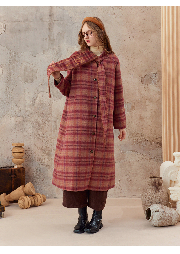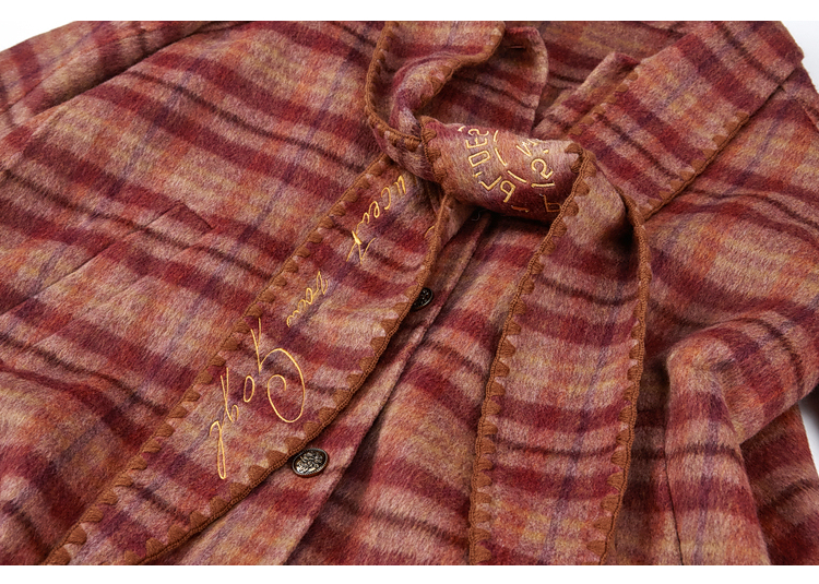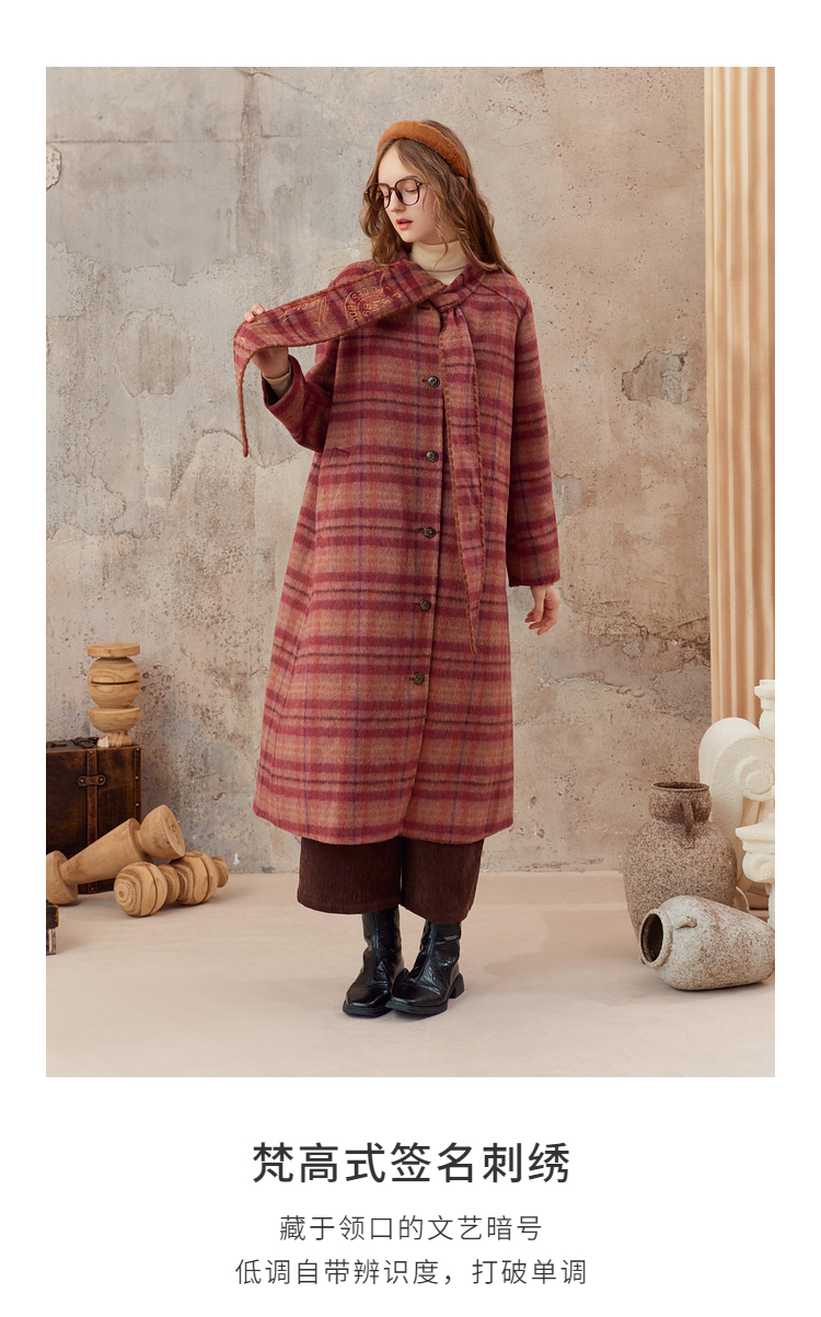 【暖冬内购】两三事梵高文艺 热红酒 2025秋冬新款刺绣围巾领格子毛呢外套女