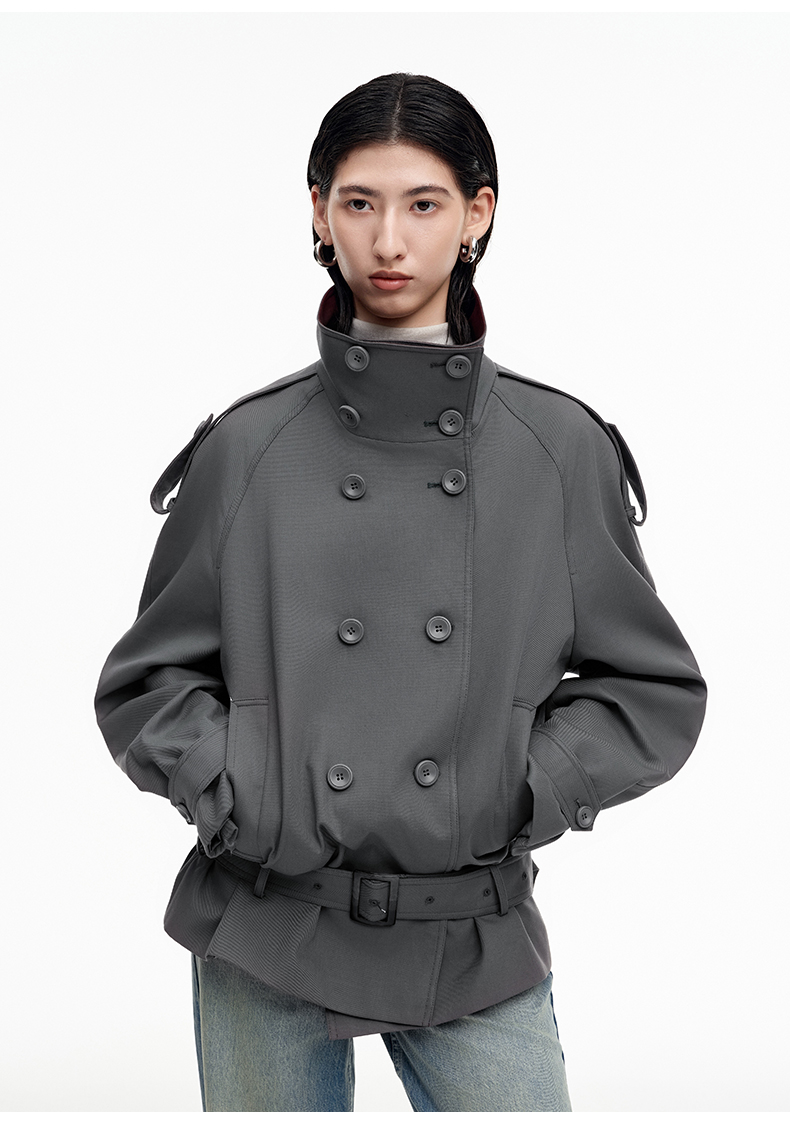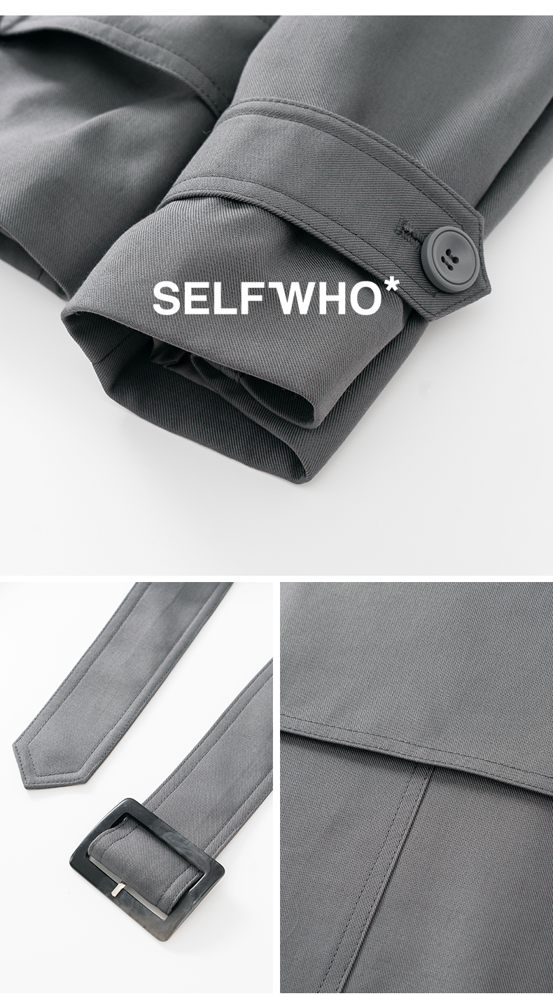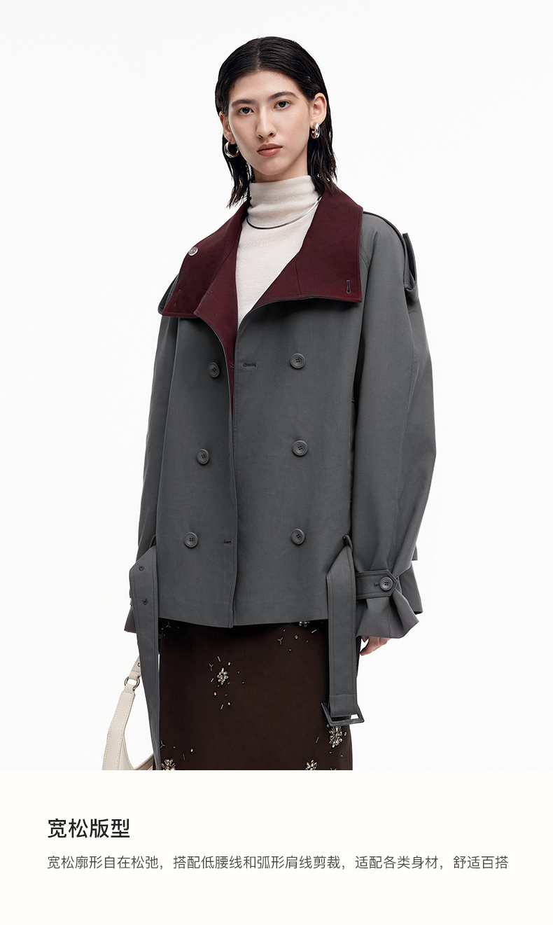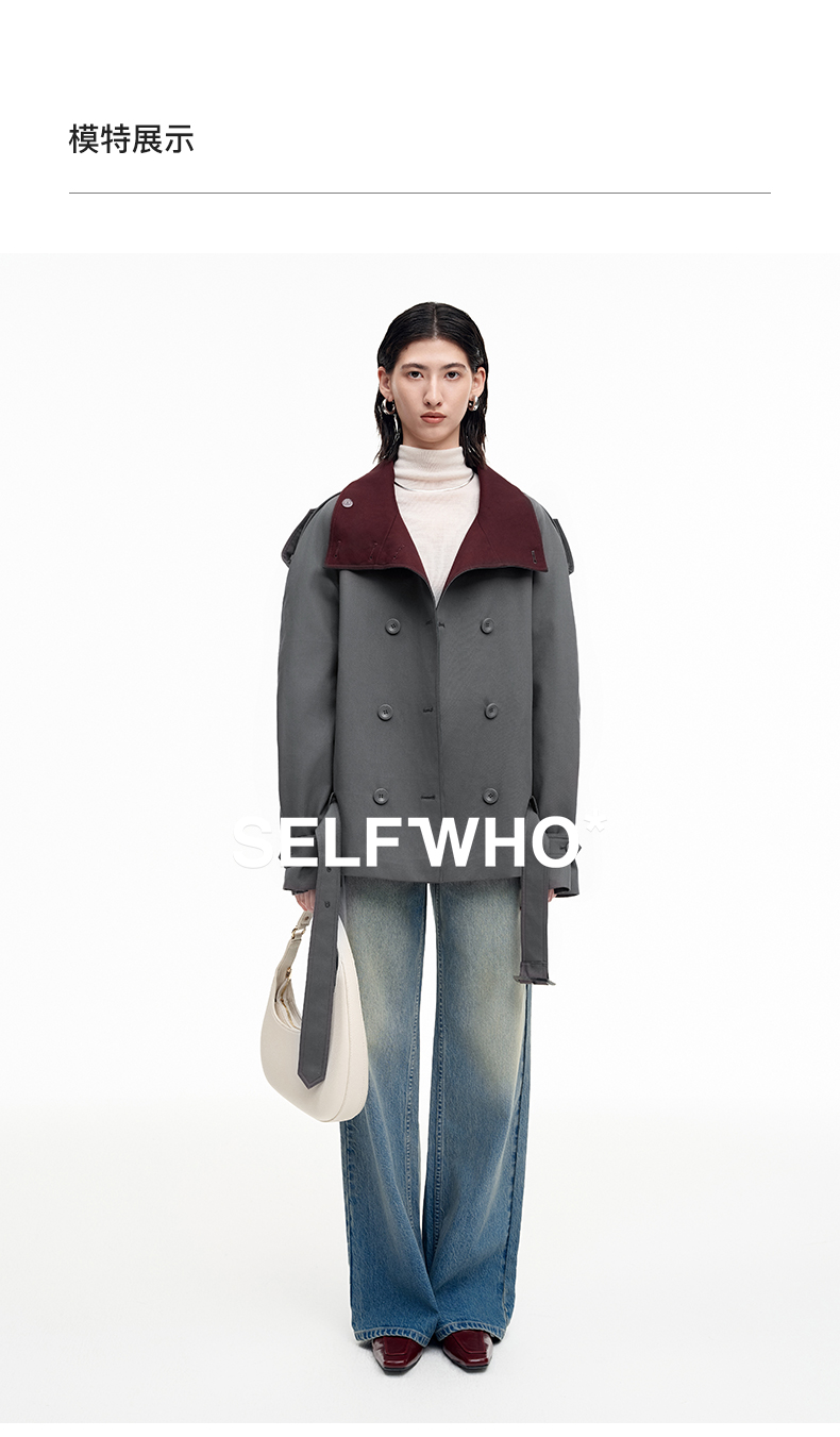 SELFWHO棉混纺灰色双排扣风衣外套女2025秋新款配腰带高立领上衣