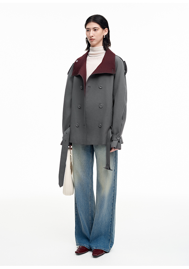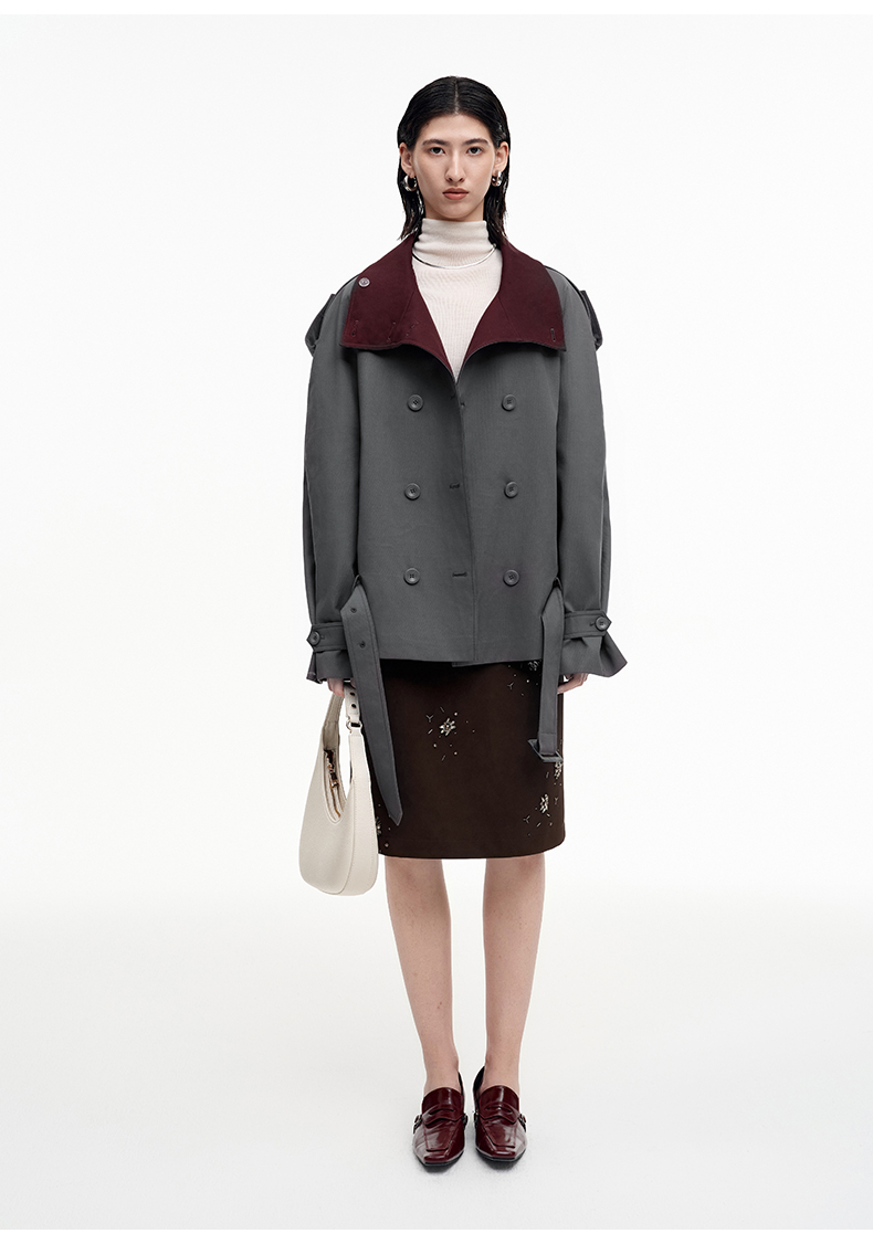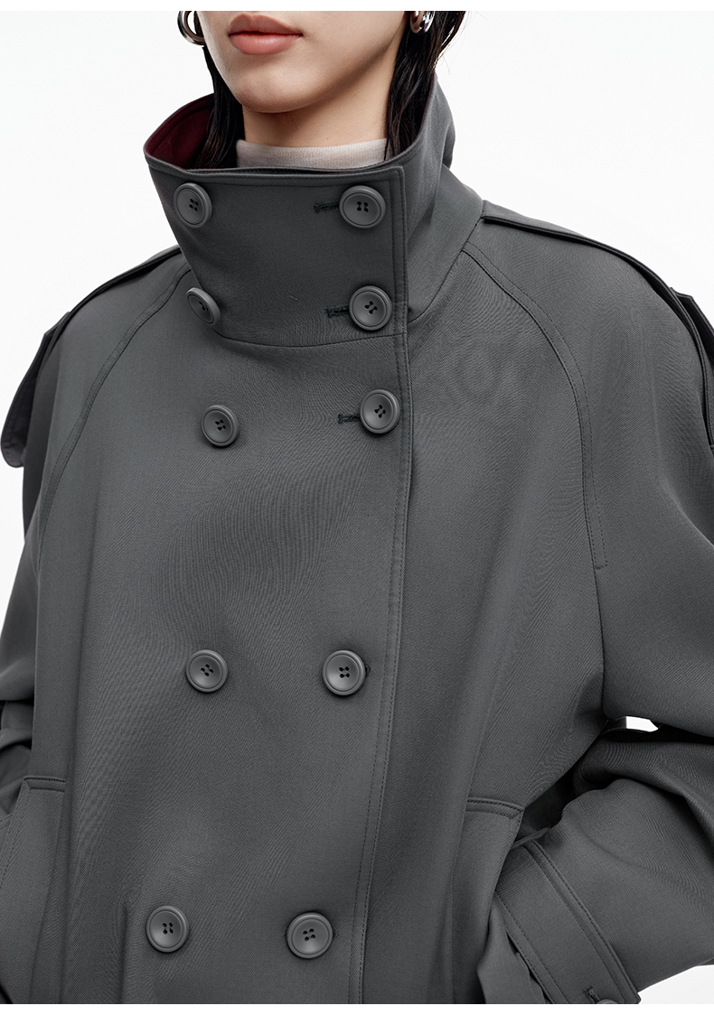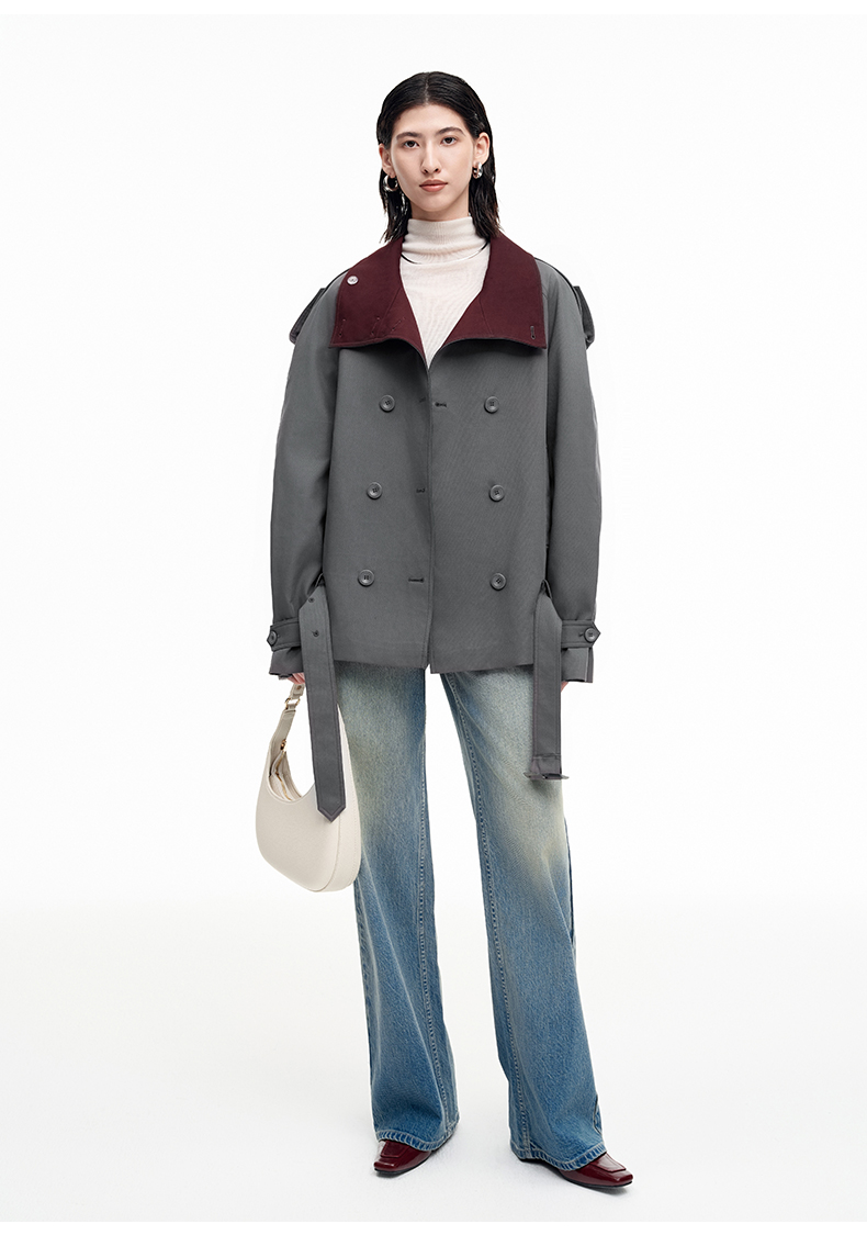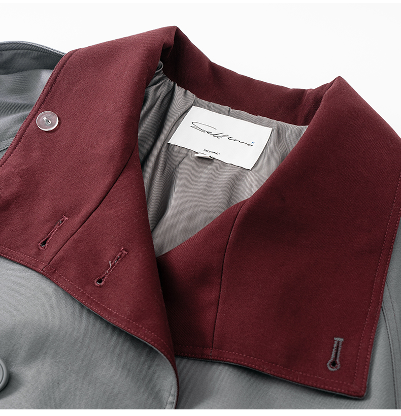 SELFWHO棉混纺灰色双排扣风衣外套女2025秋新款配腰带高立领上衣