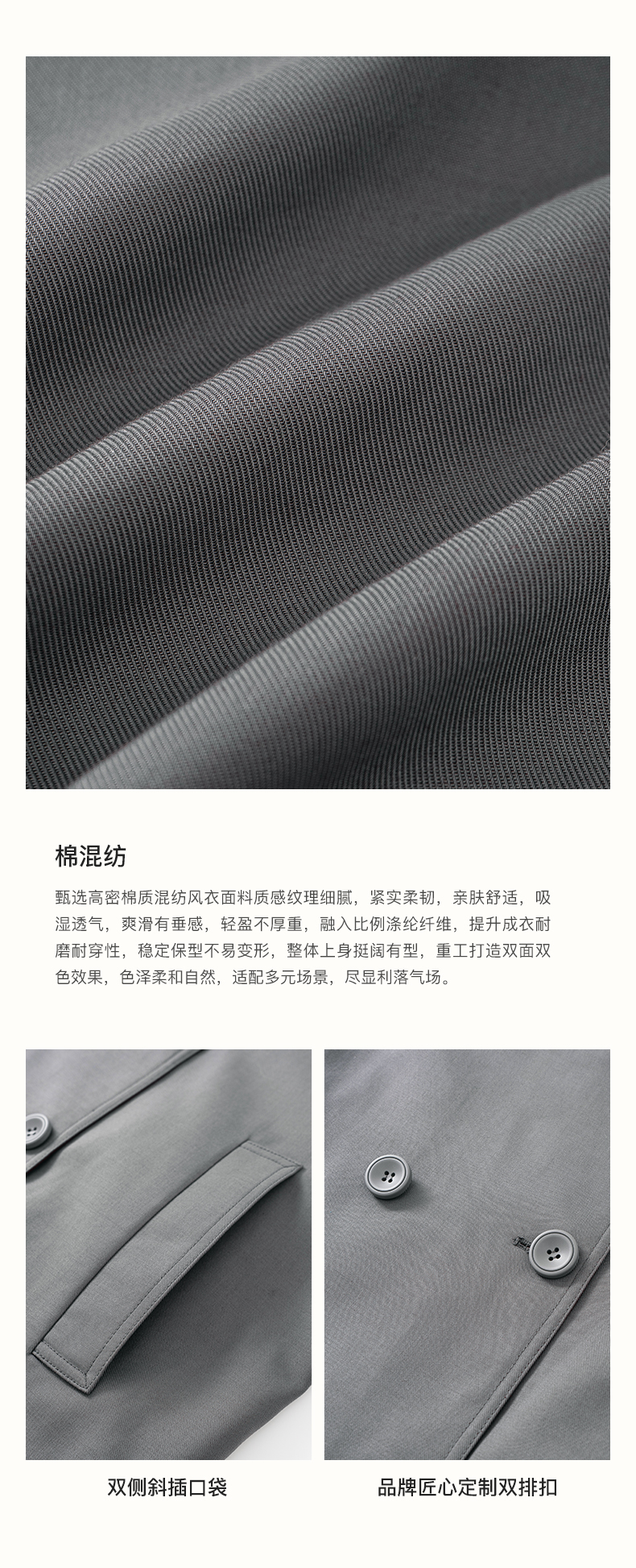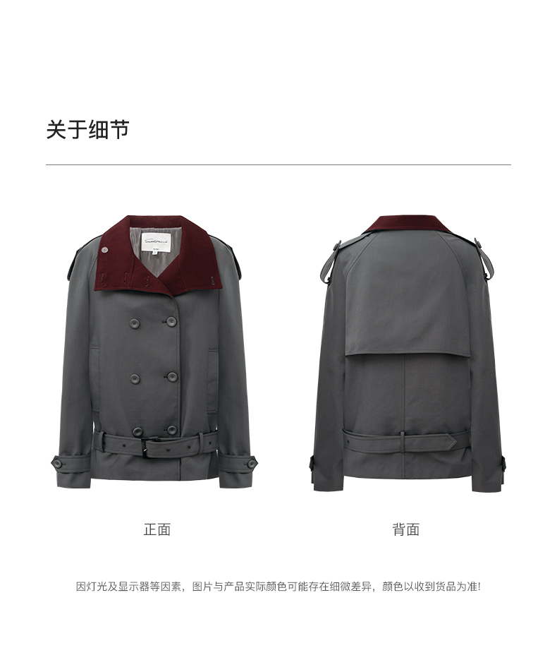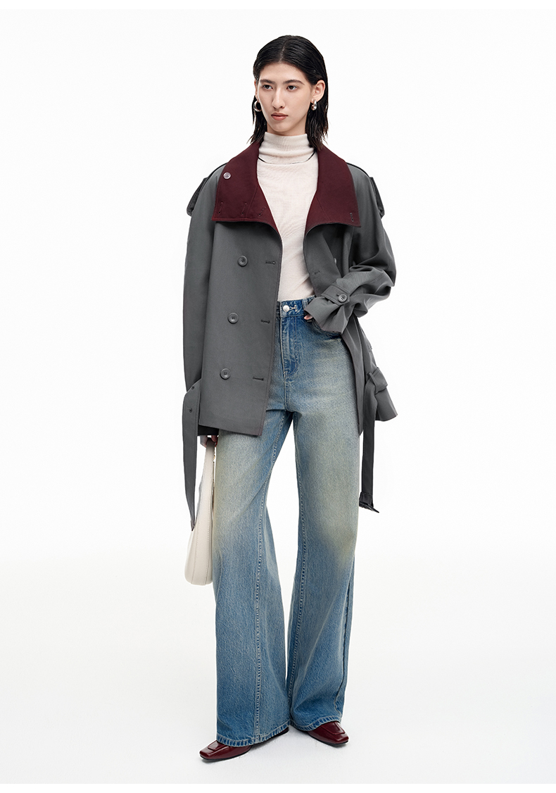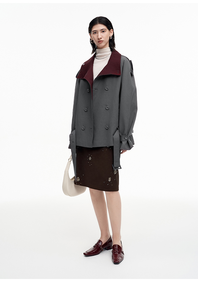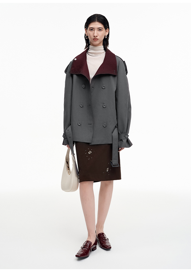 SELFWHO棉混纺灰色双排扣风衣外套女2025秋新款配腰带高立领上衣