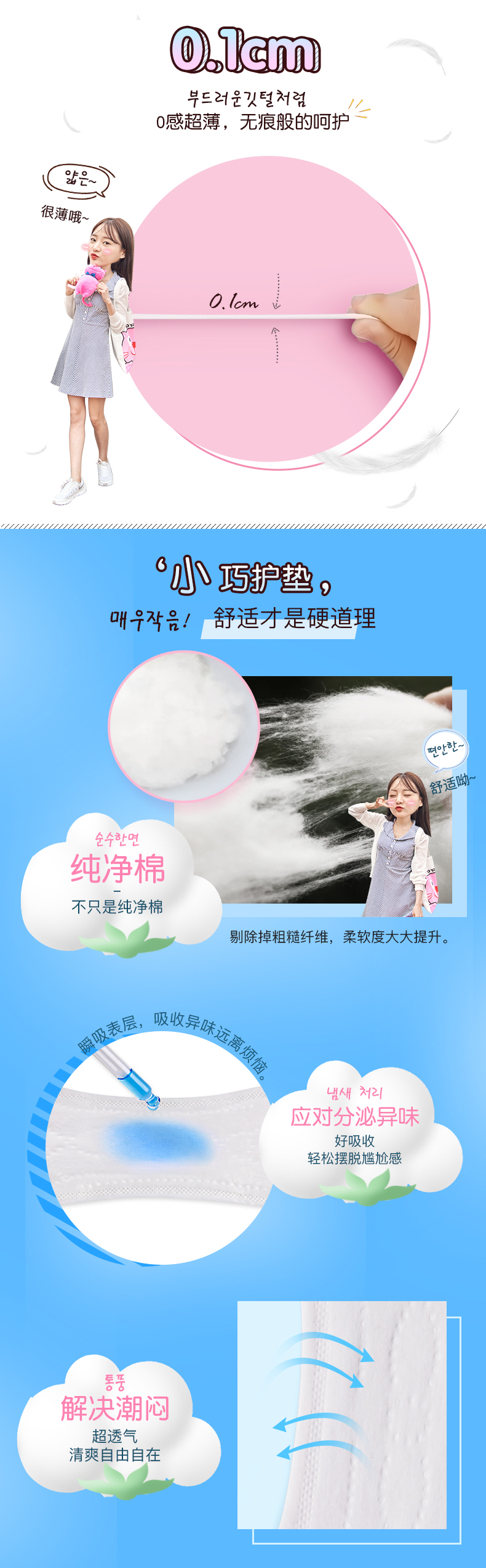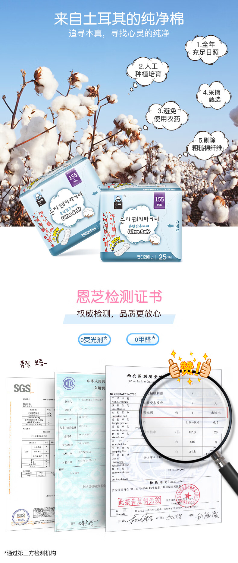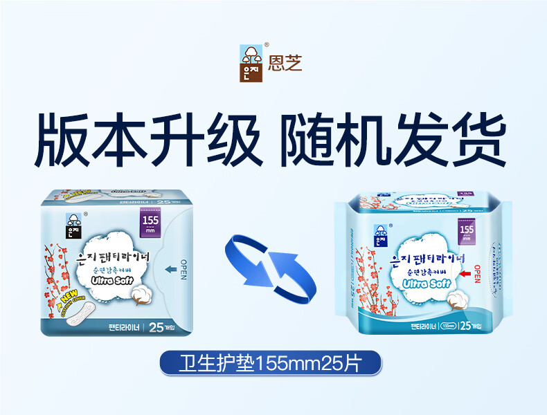 【2包装】恩芝(Eunjee)韩国进口轻薄透气无护翼姨妈巾卫生巾护垫155mm*25片/包