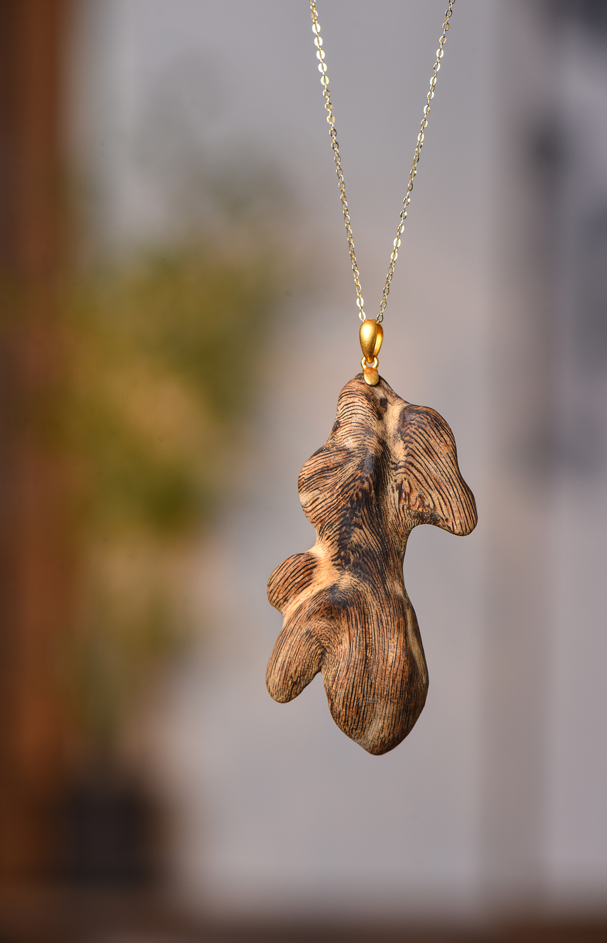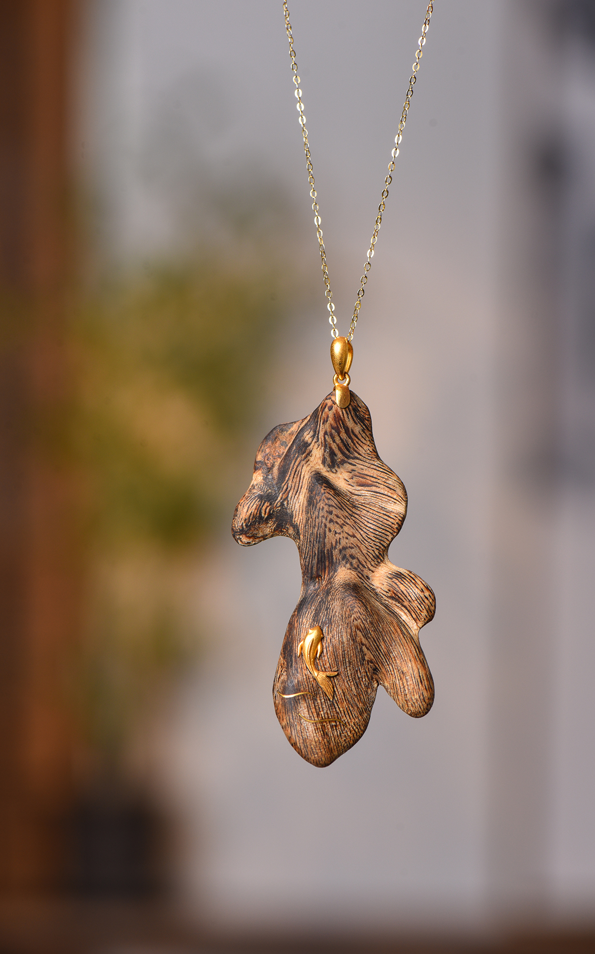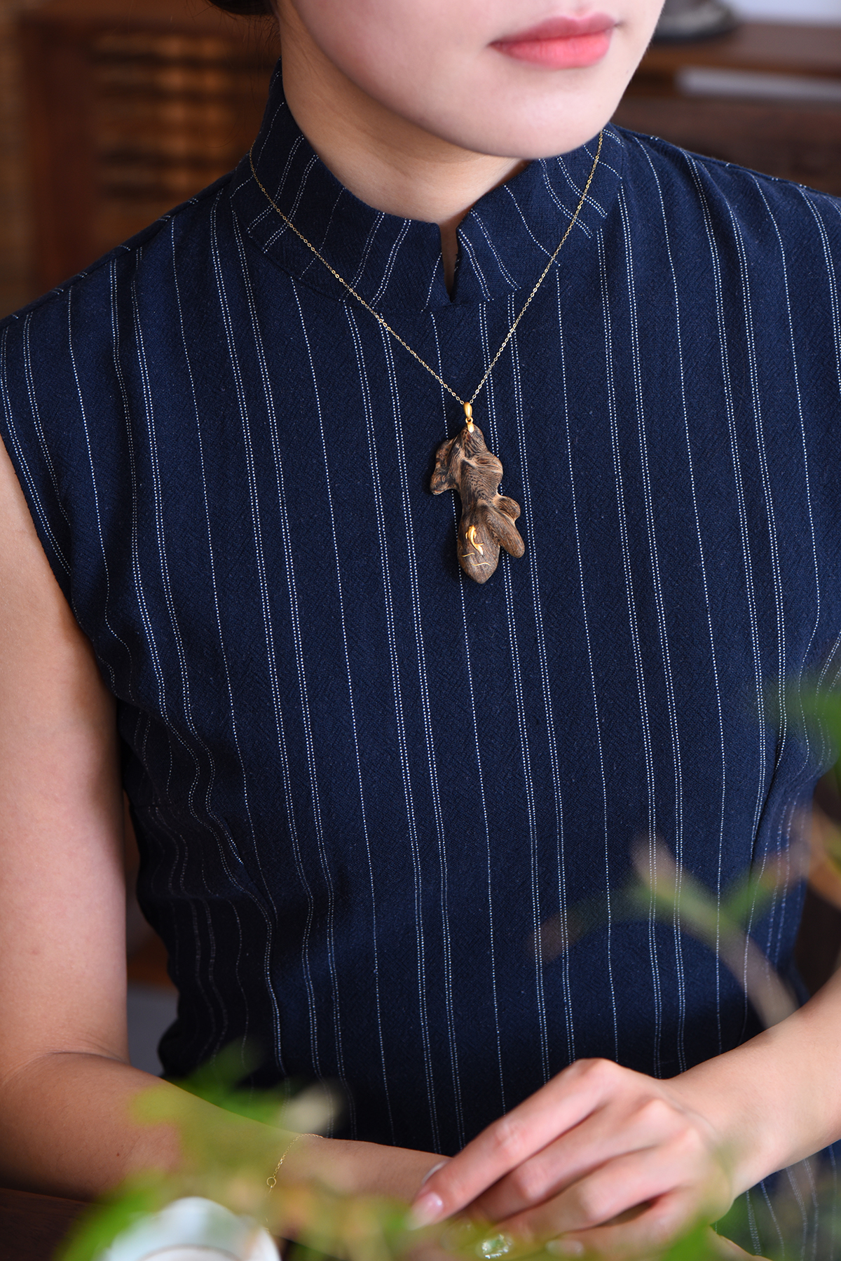 随形沉香是 “山 / 水的写意”,错金小鱼是 “活的生气”,组合起来像一幅 “无声的鱼戏图”,戴在身上,连日常都多了几分 “茶烟里的闲情”。