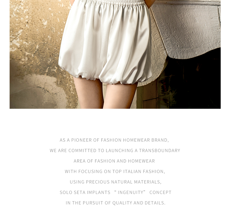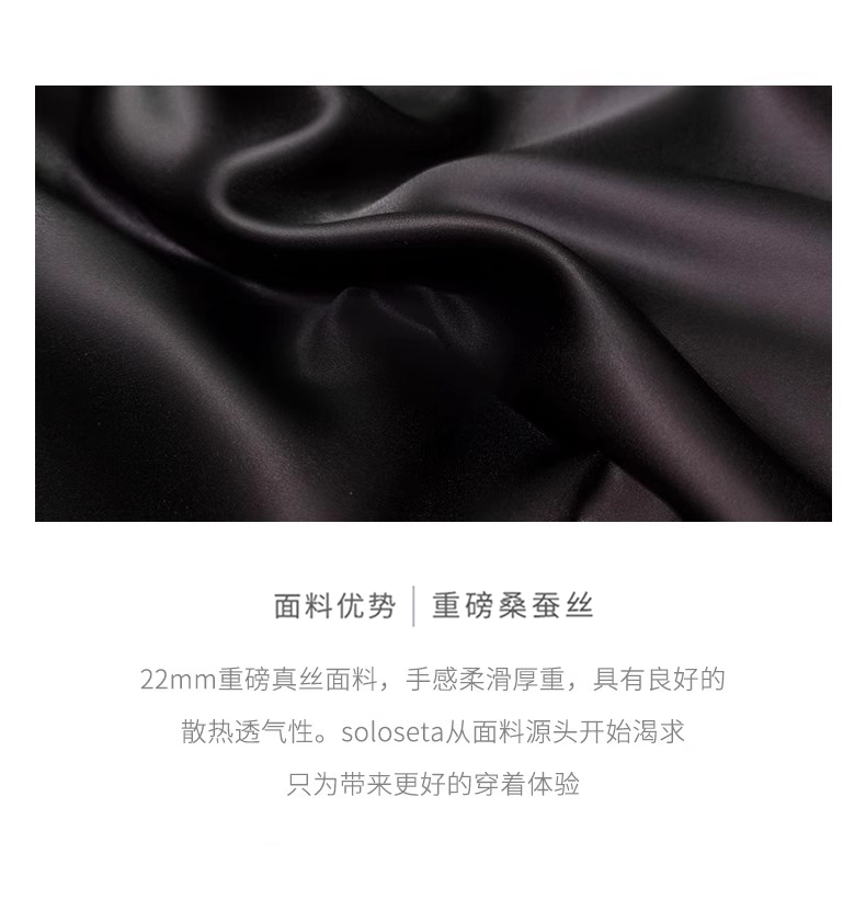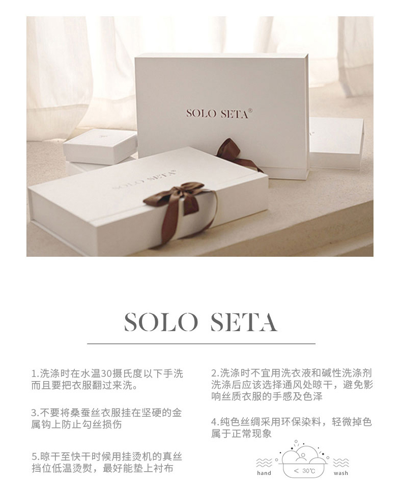 - soloseta专注于真丝织物,灵感源自意大利语,中文含义为“只做真丝”的意思。让睡衣变时尚,居家和外出瞬间切换,使其更具有出街,度假,参加宴会等功能。