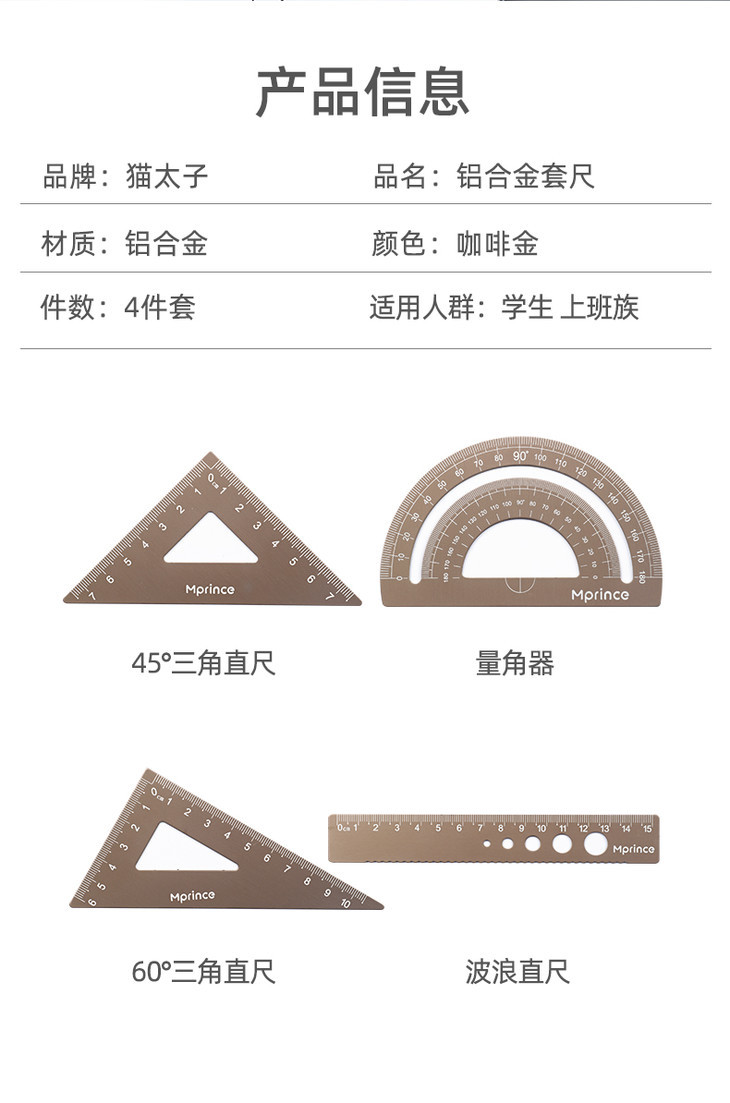 猫太子金属尺子套装小学生用直尺三角尺带波浪线量角器整套考试用学习文具