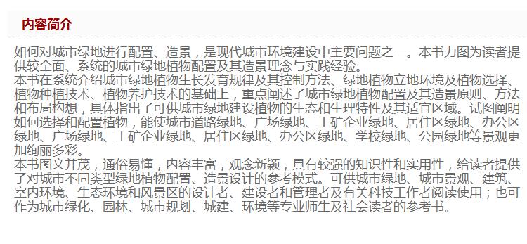 城市绿地植物配置及其造景 2539 城市绿化 园林 城市规划 城建 环境 居住区 公园 工矿企业 道路绿地 植物配置造景 中国林业出版社