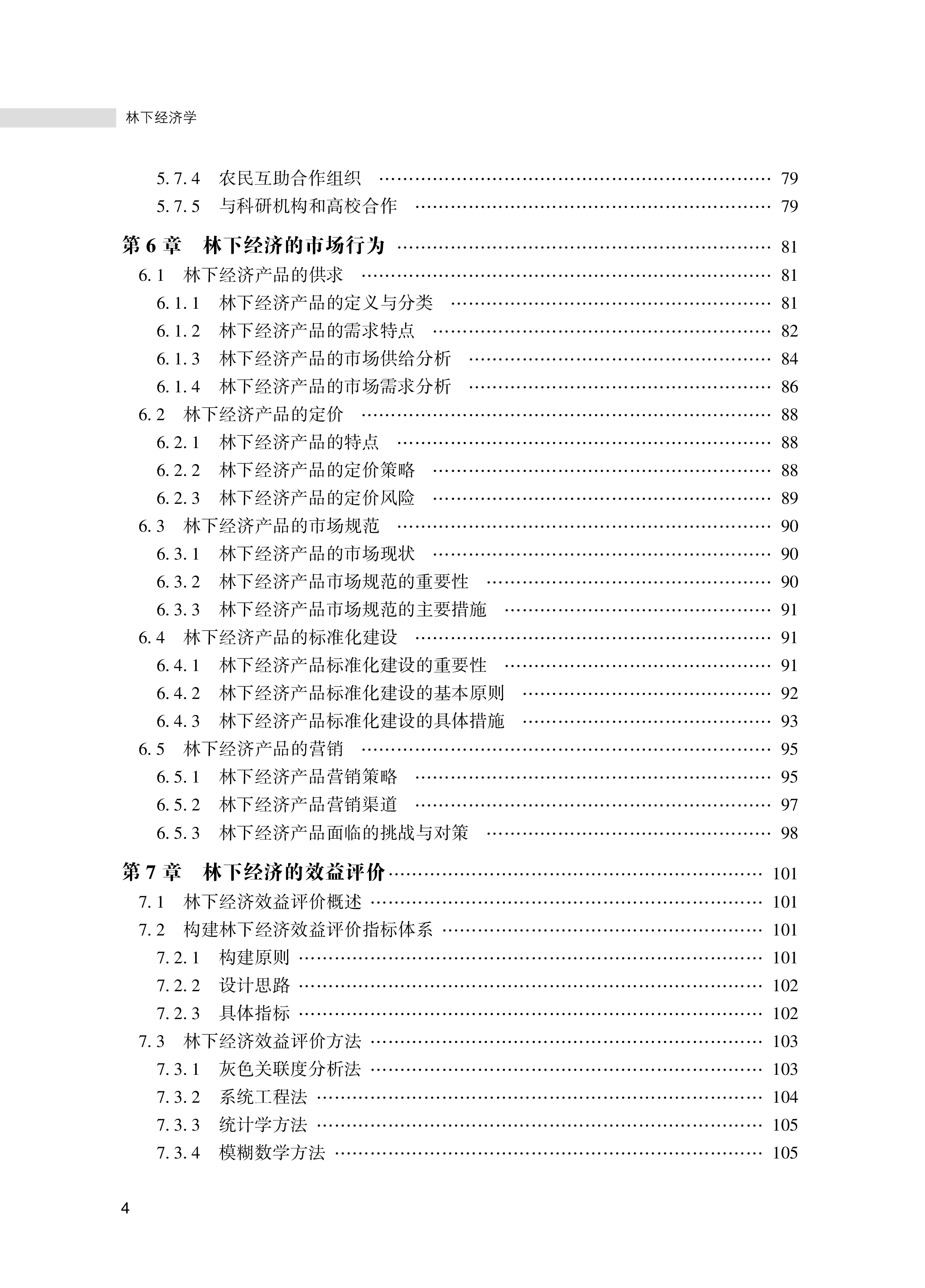内容简介:本书对林下经济的基本理论、研究对象、研究方法、研究范畴和规律、概念和原理等进行了研究,回顾总结了林下经济学的形成与发展、国内外林下经济的发展历史与现状,阐述了林下经济的供求、定价、市场规范、标准化建设和营销等市场行为,以及林下经济的效益评价,论述了林下经济发展的主要任务和保障措施,列举了林下经济发展典型案例。全书比较系统地涵盖了有关林下经济的各方面知识,具有较强的理论性、政策性和实用性。对农林院校师生、科研人员、从事林下经济的企事业单位和个人、林业主管部门有关人员具有重要的参考价值。