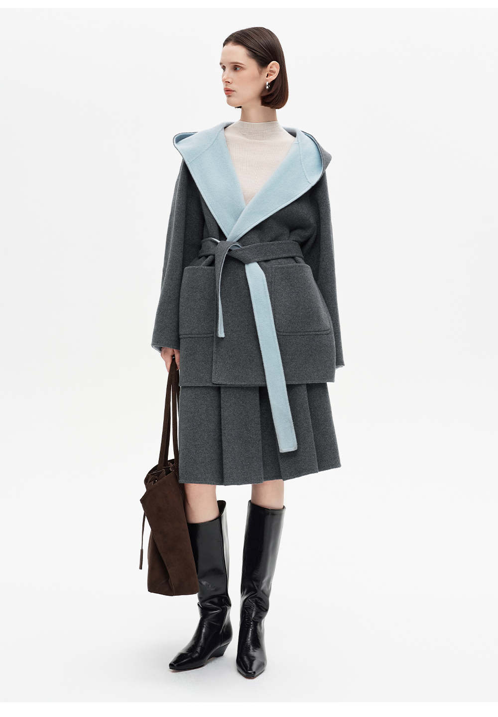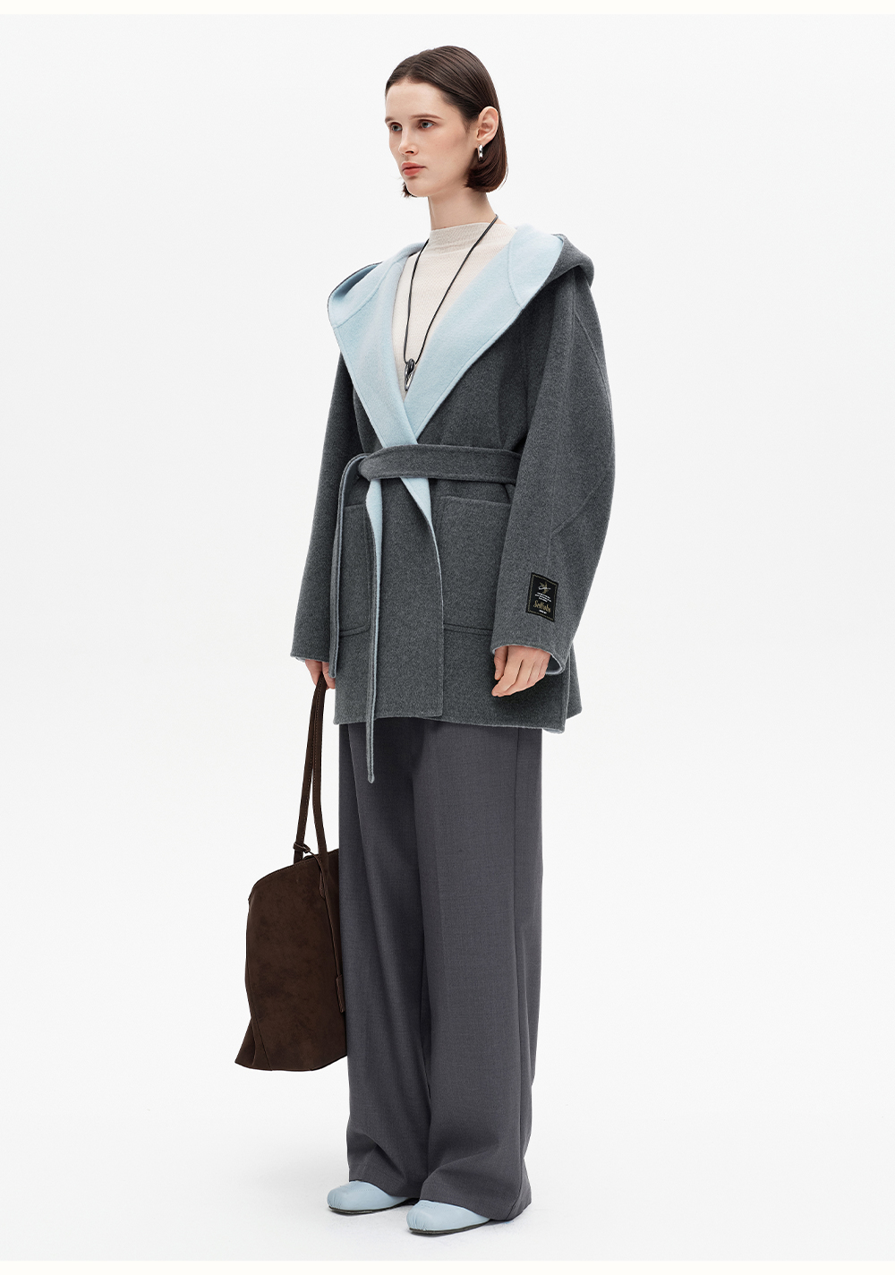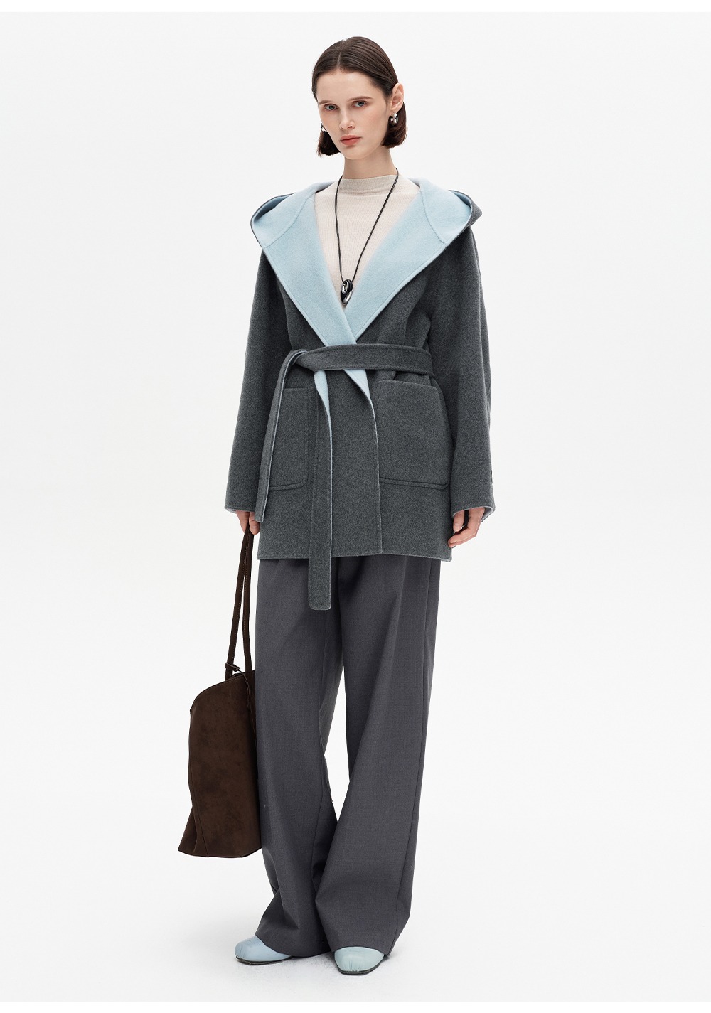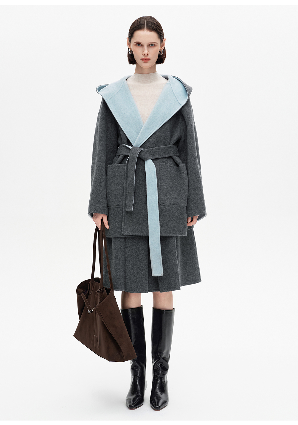 SELFWHO绵羊毛混纺浴袍式连帽撞色毛呢外套女25冬新款中长款大衣