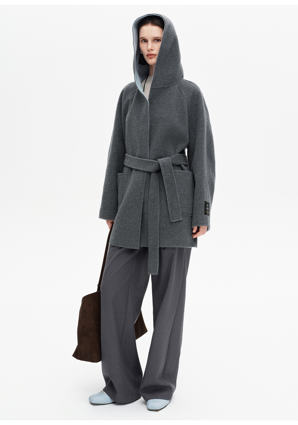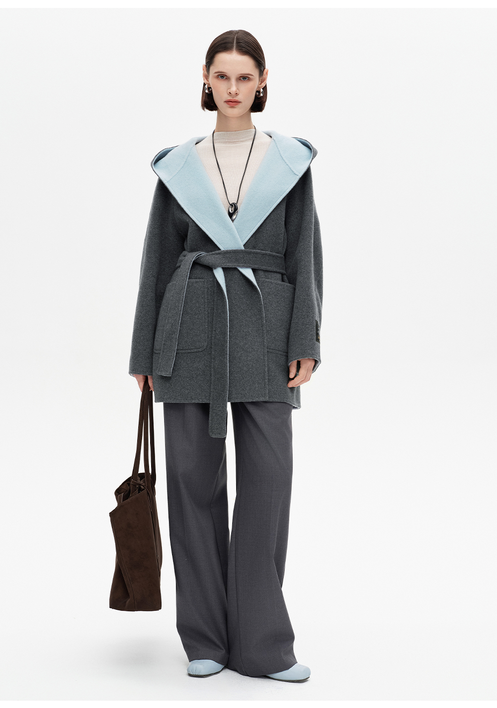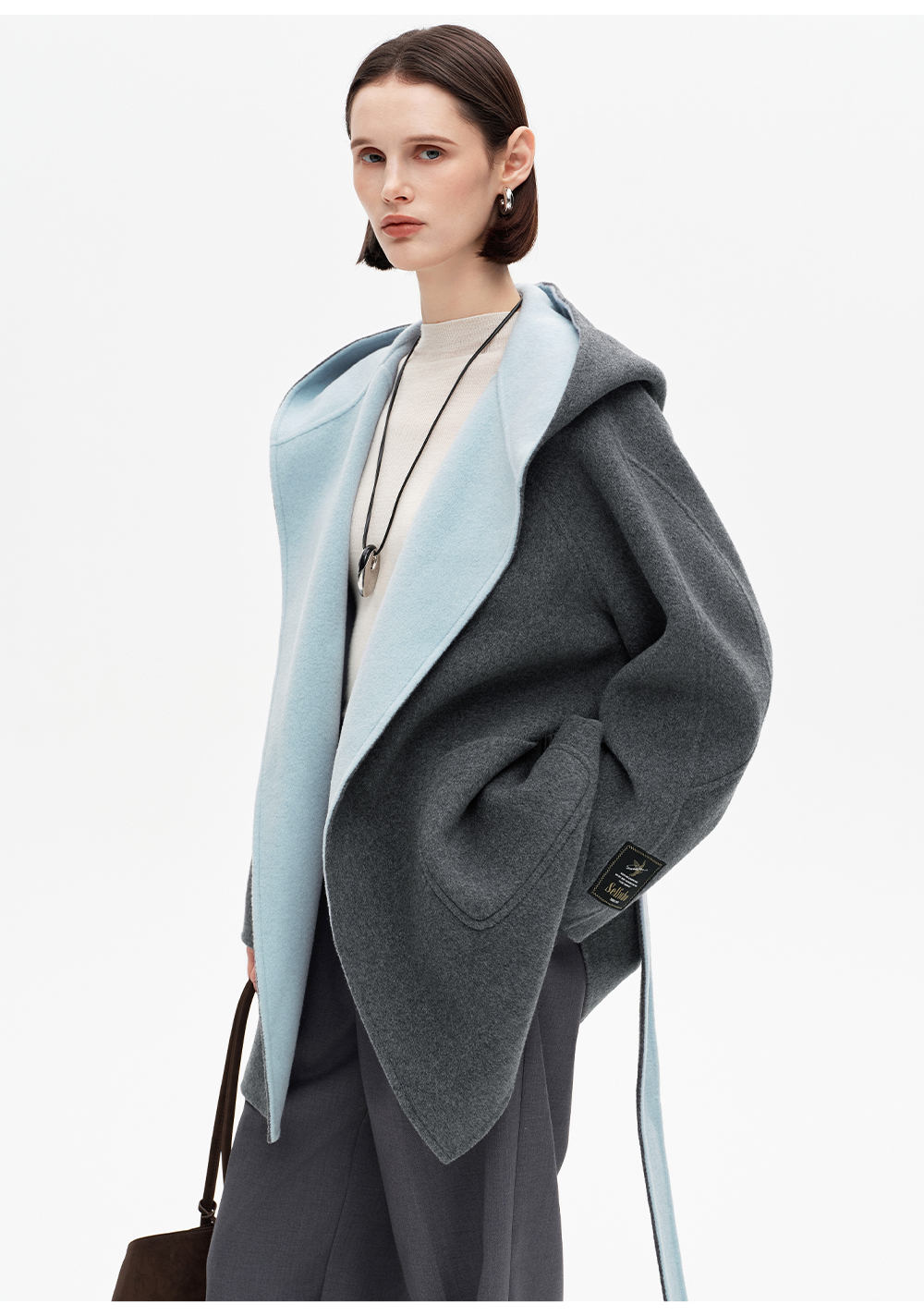 SELFWHO绵羊毛混纺浴袍式连帽撞色毛呢外套女25冬新款中长款大衣