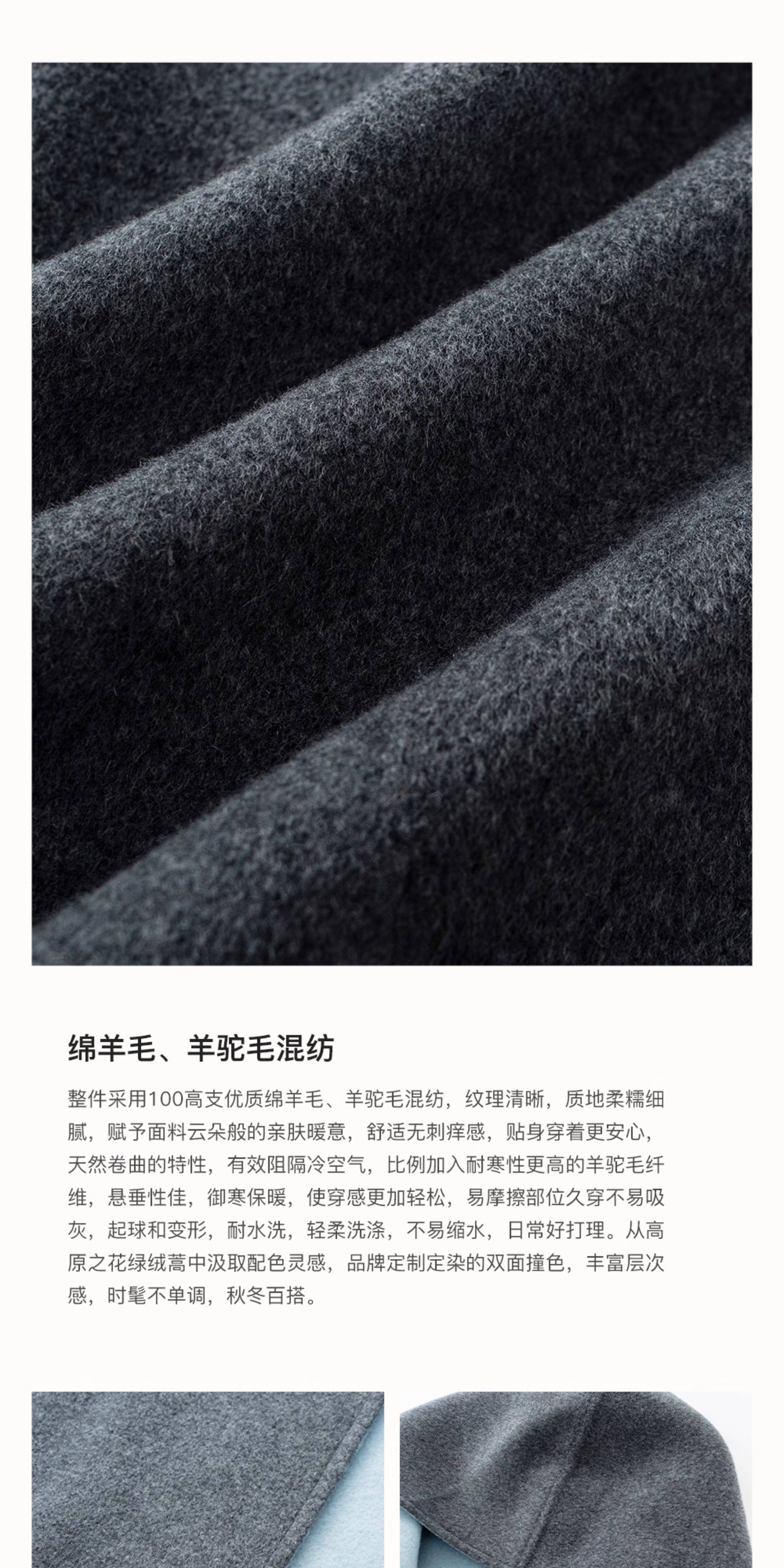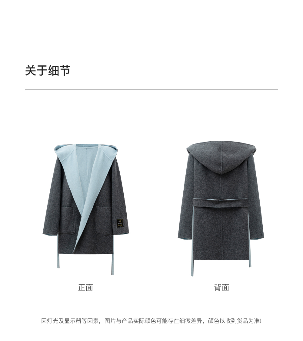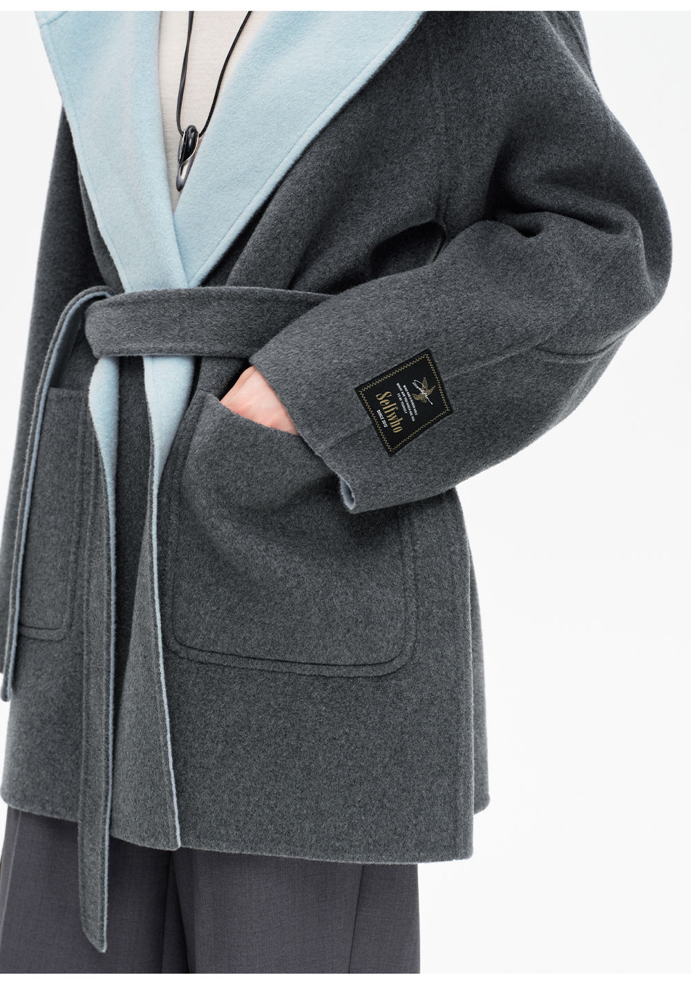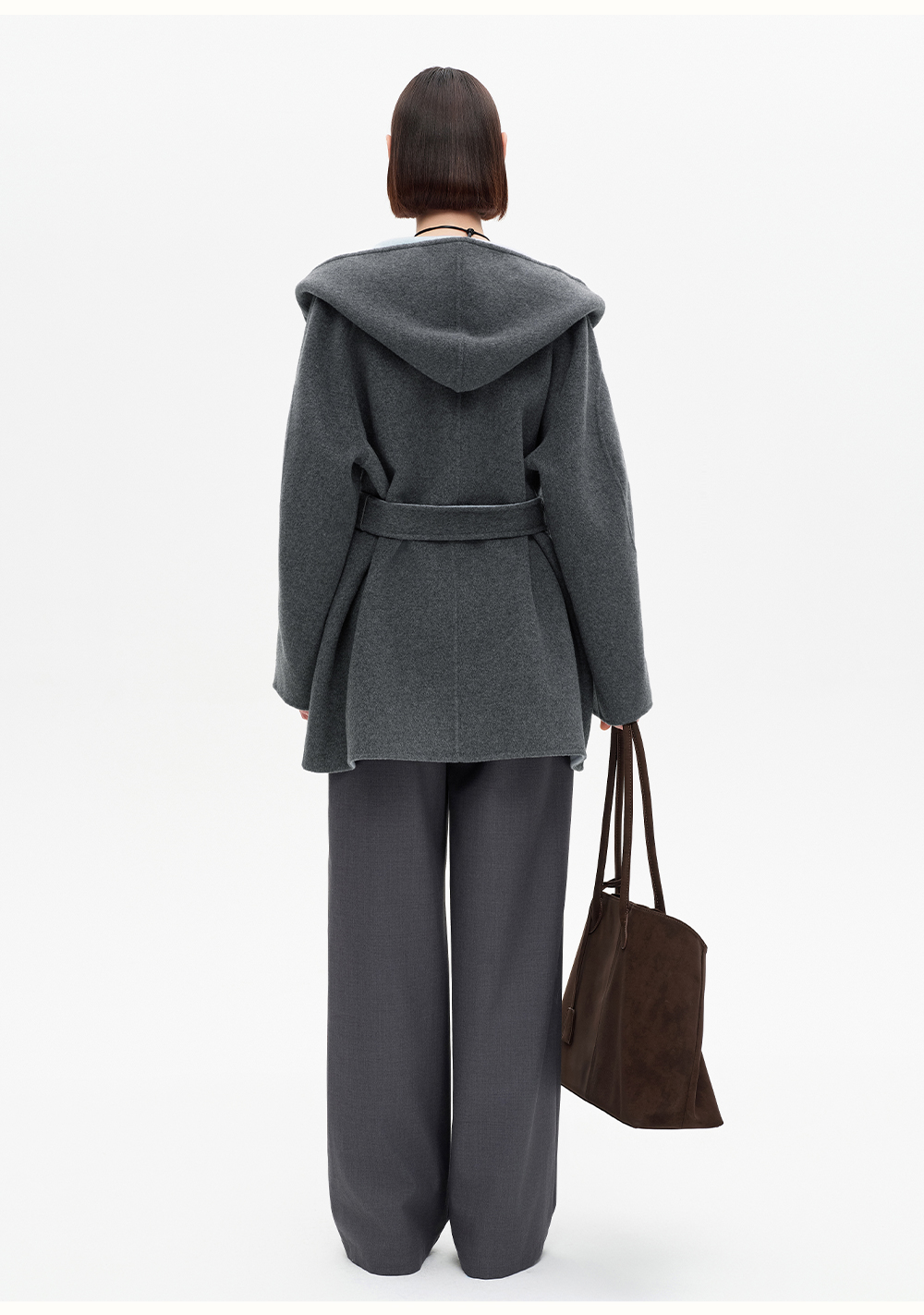 SELFWHO绵羊毛混纺浴袍式连帽撞色毛呢外套女25冬新款中长款大衣