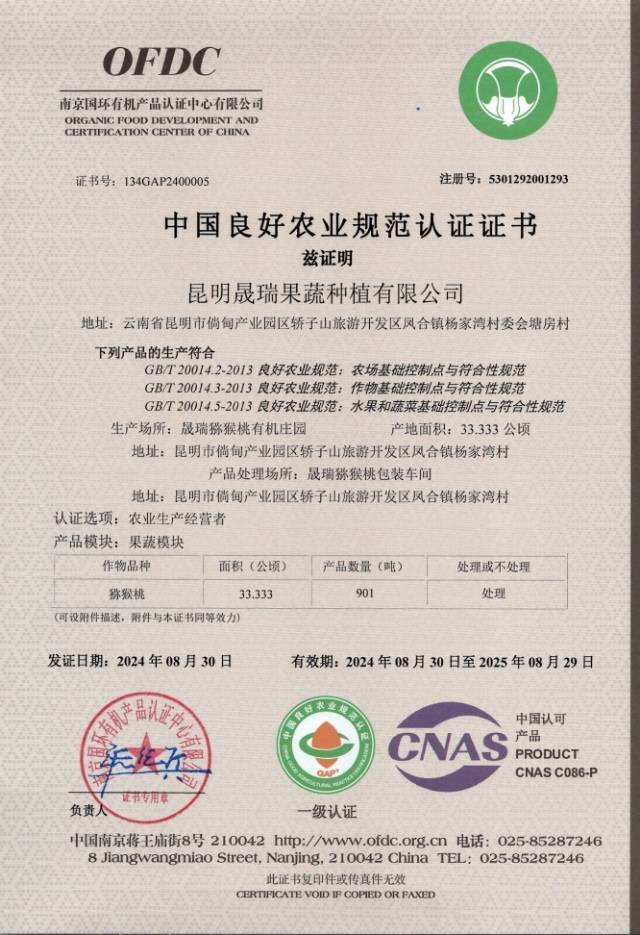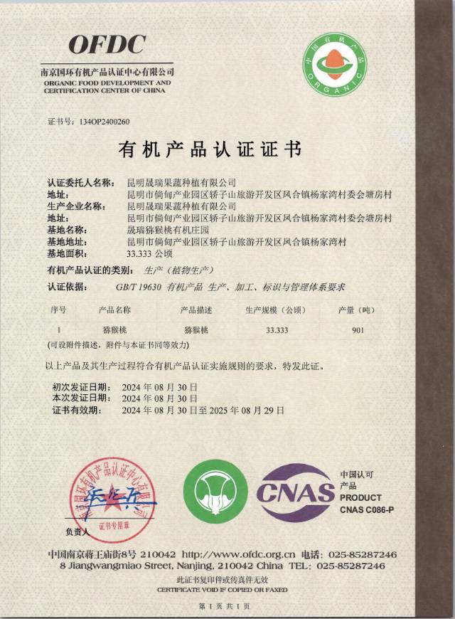 【种植】基地位于云南昆明市,海拔2200米,昼夜温差大,年日照2120小时以上。露天种植,每一颗果实都被阳光亲吻过。无任何化学农药、化肥、化学激素,果香甜蜜,糖度超过16以上、干物质含量超过20%超高VC含量,营养丰富绿盟猕猴桃专用双通道分拣每一颗猕猴桃从种植到采摘,日照时间均超过2120小时,且禁用JS类农药、化肥、催熟剂、膨大剂、甜蜜素等,连续五年通过农残检测,产品实现“零农残”。荣获“中国良好农业规范(GAP)一级认证”,并获“有机认证证书”,贴追溯码。它们种植在海拔2200米的红土地,昼夜温差大,日照时间长,年平均气温14.5℃,果肉含量、糖度均比较高。