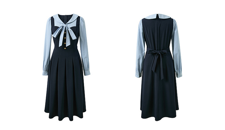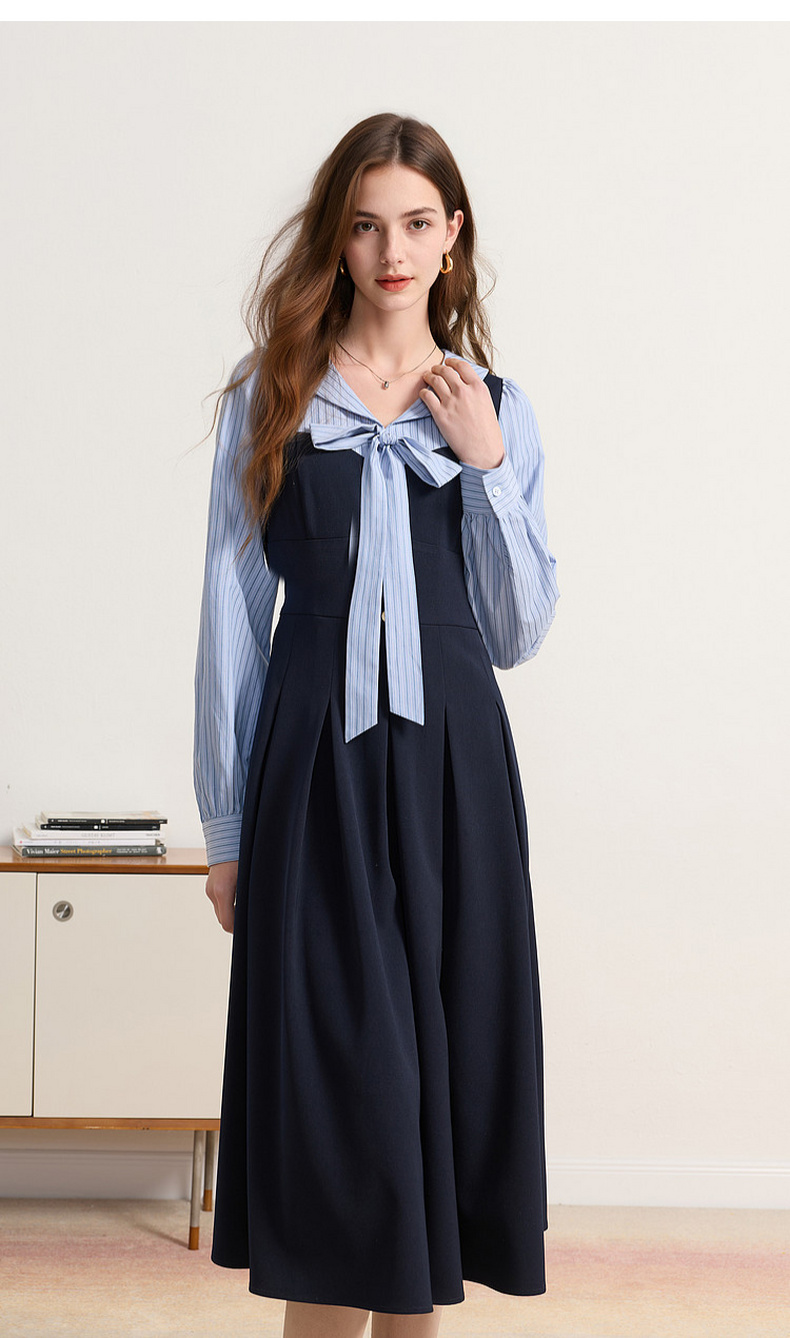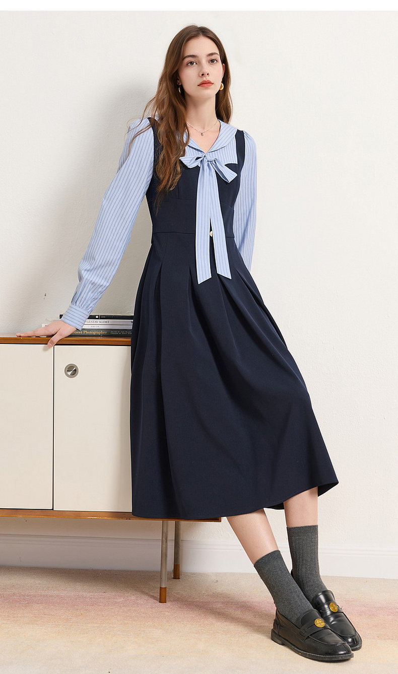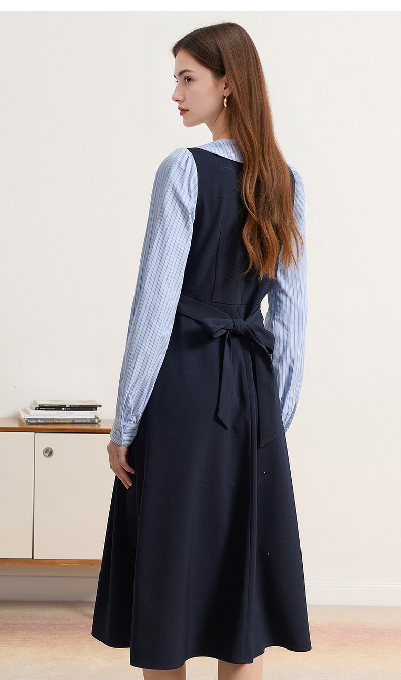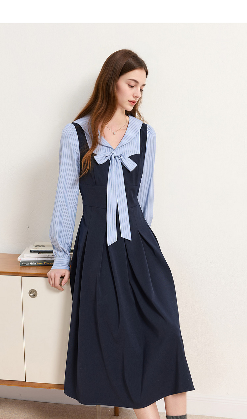 三彩2026春季新款条纹假两件连衣裙长袖系带收腰A字裙长裙M