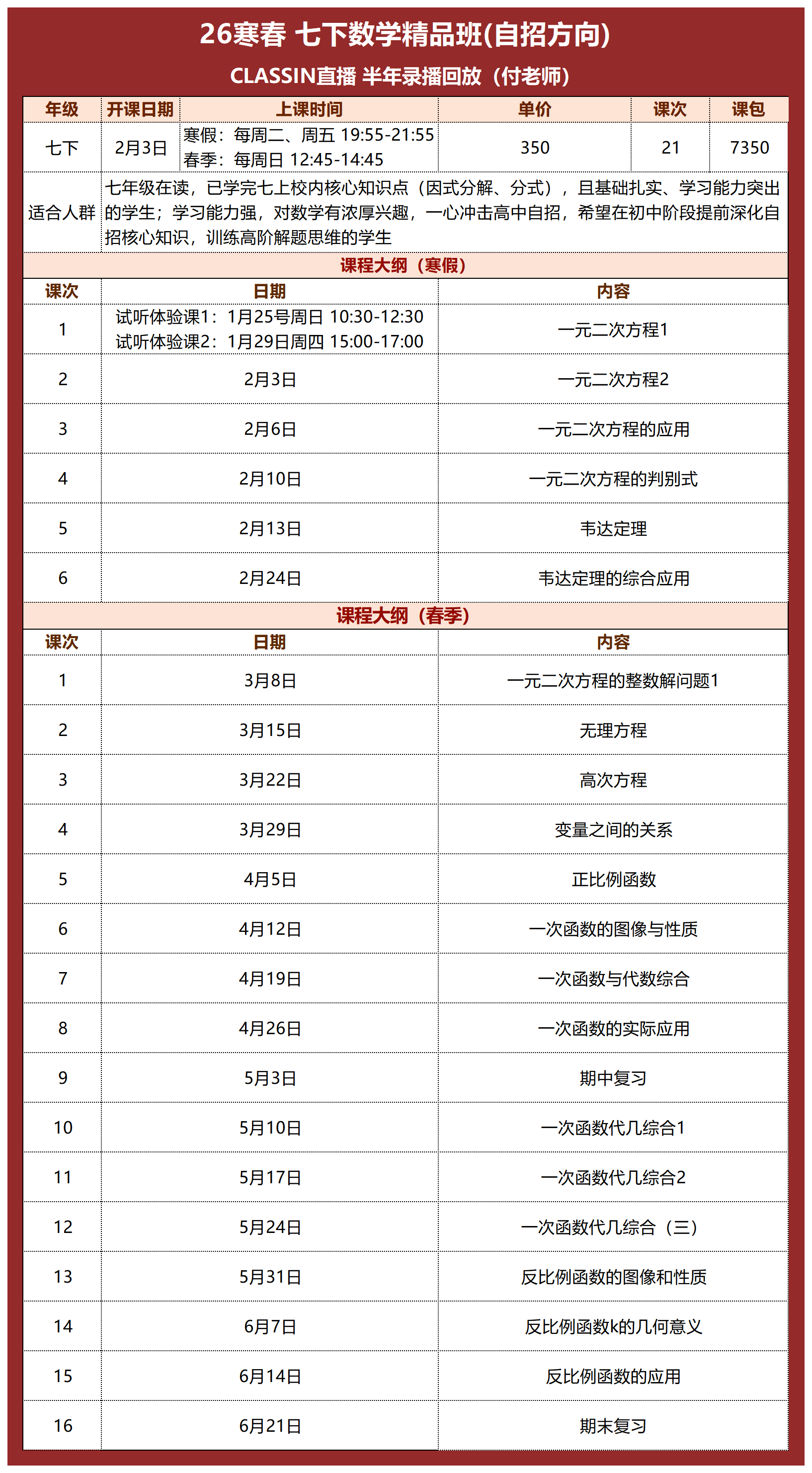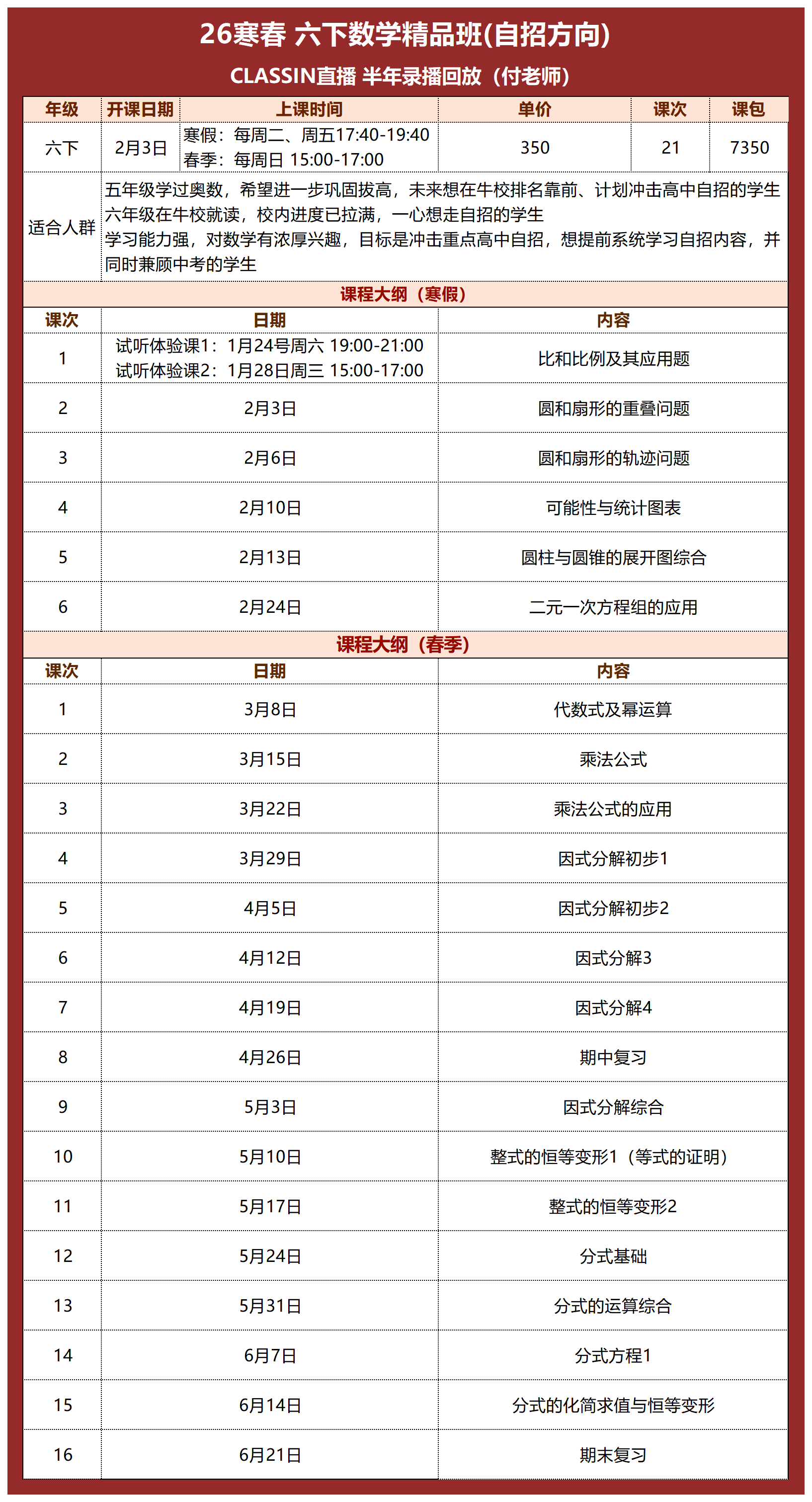 寒假5讲,春季16讲,一共21讲,350元/120分钟/讲